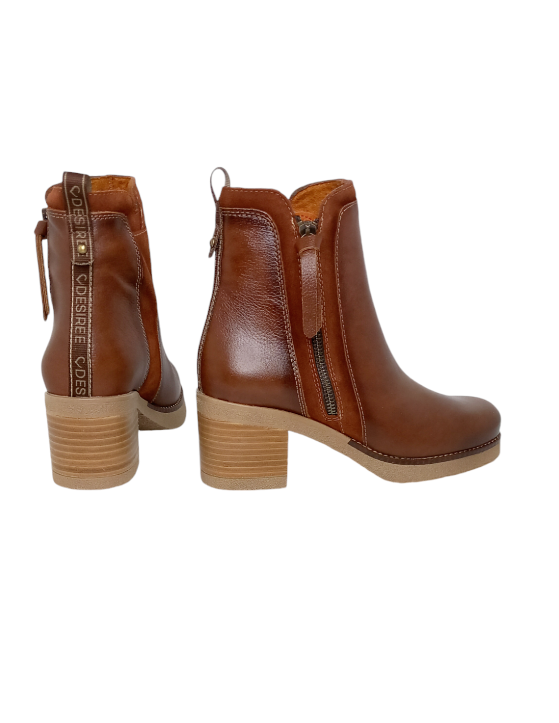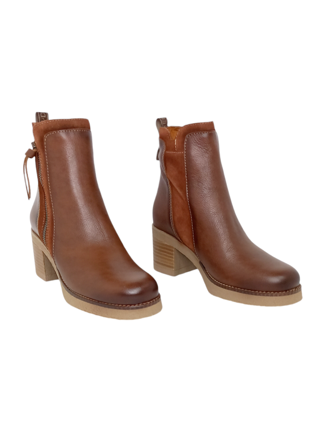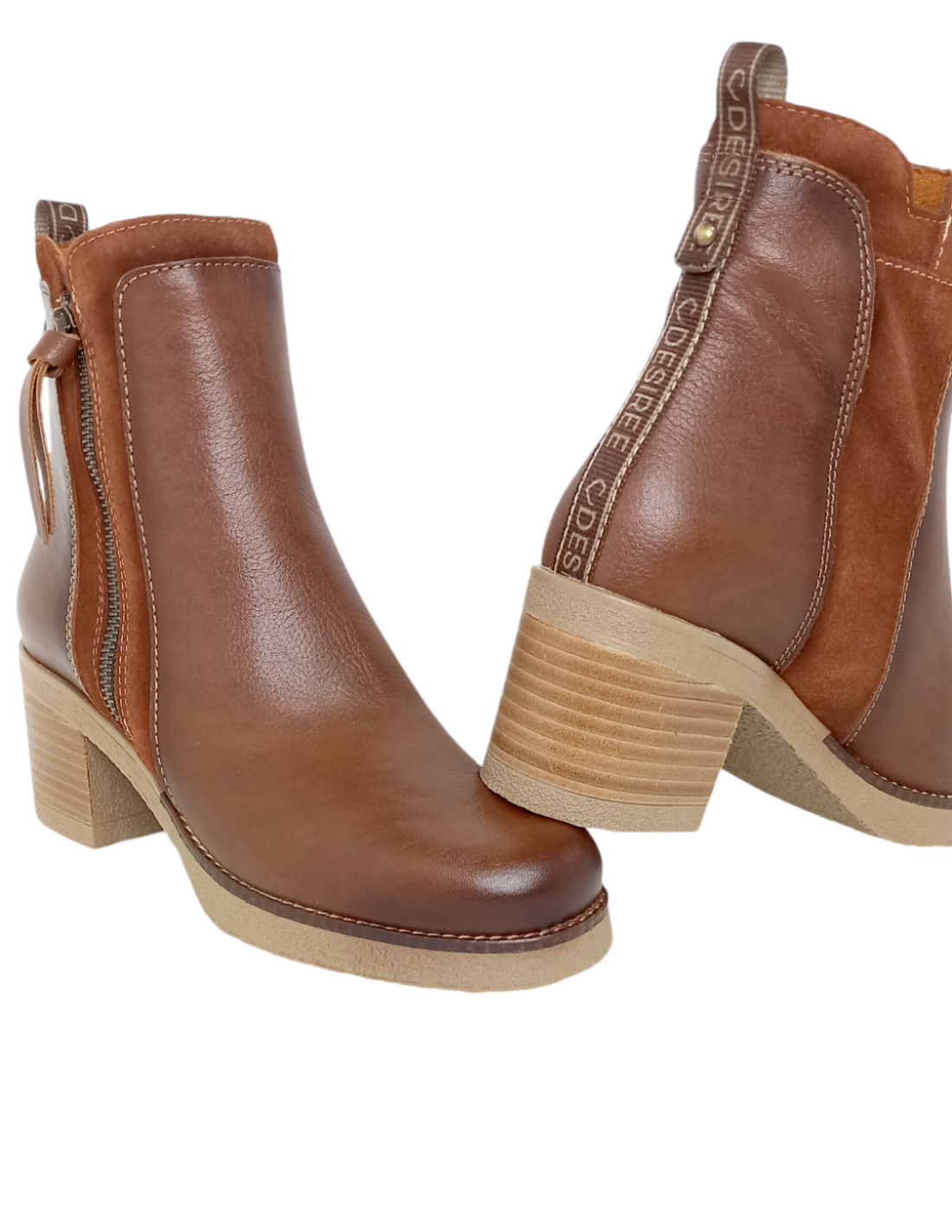 Fabricado en piel natural, con combinación de piel boscal y piel serraje. Tirador en la parte trasera para facilitar el calce.