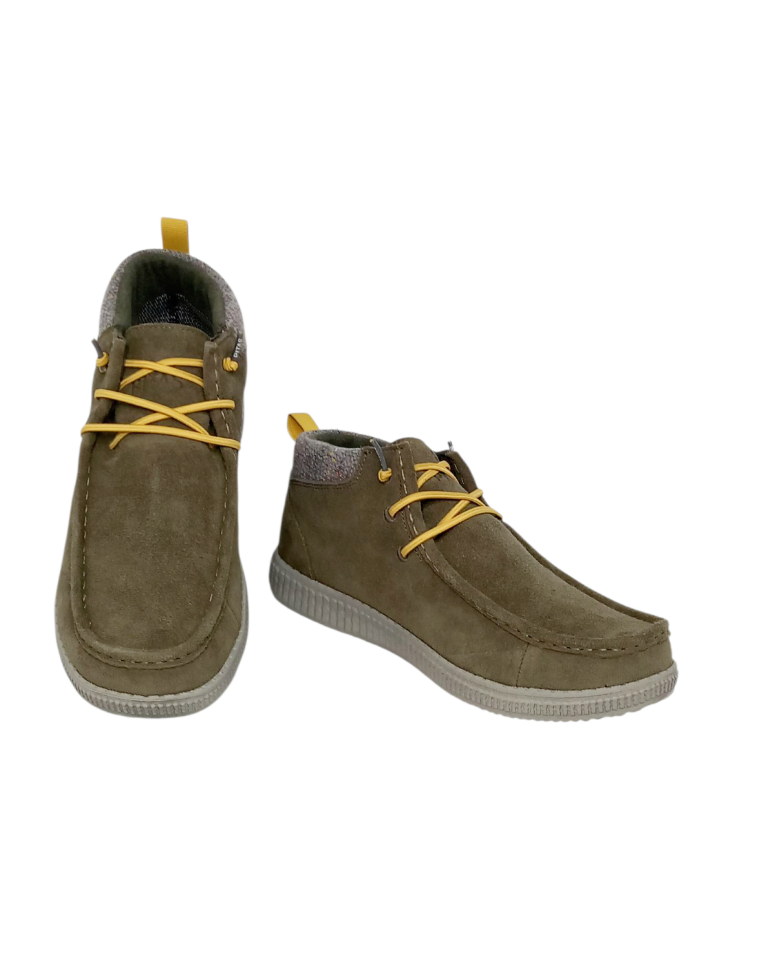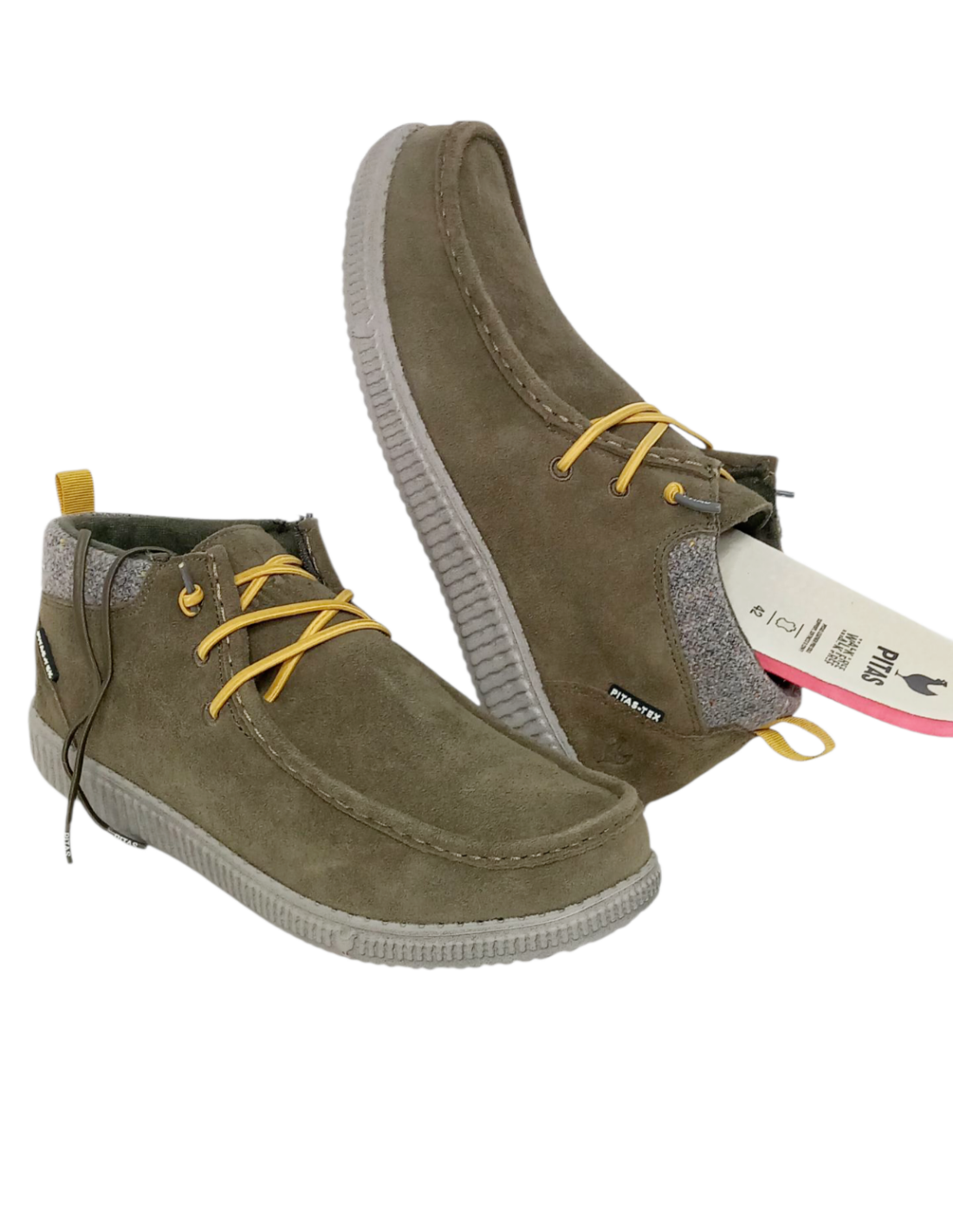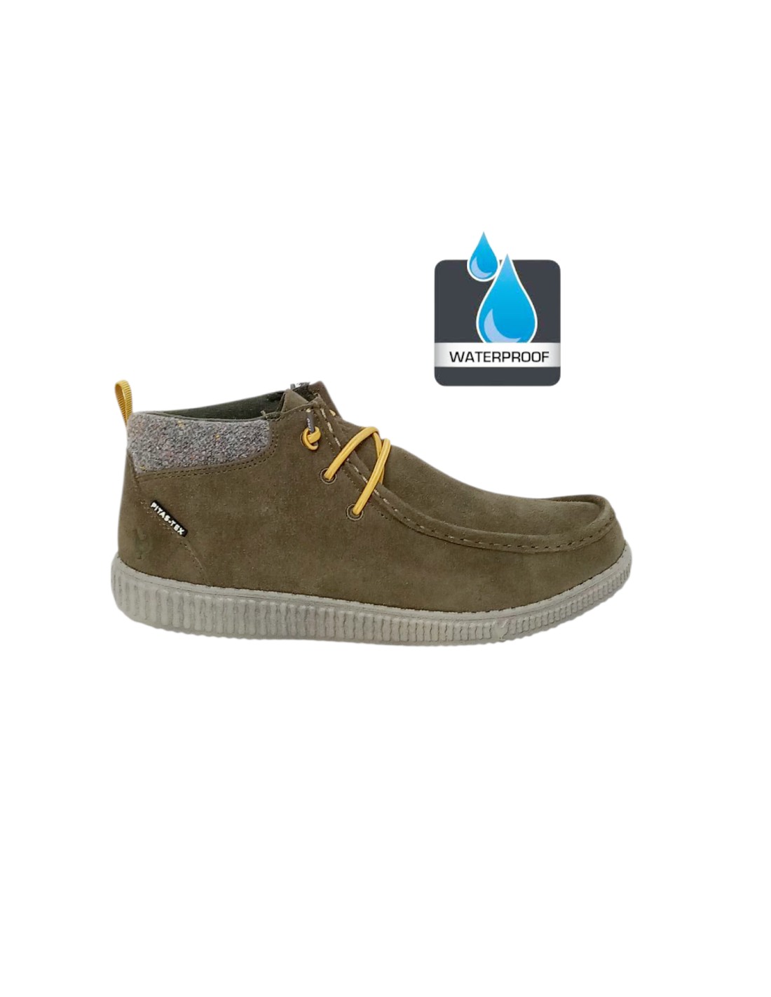 Botín con bordón en la parte delantera, también llamado wallabi, fabricado en serraje hidrofugado repelente al agua, en colores verde kakhi y gris oscuro, con cuello en textil jaspeado.