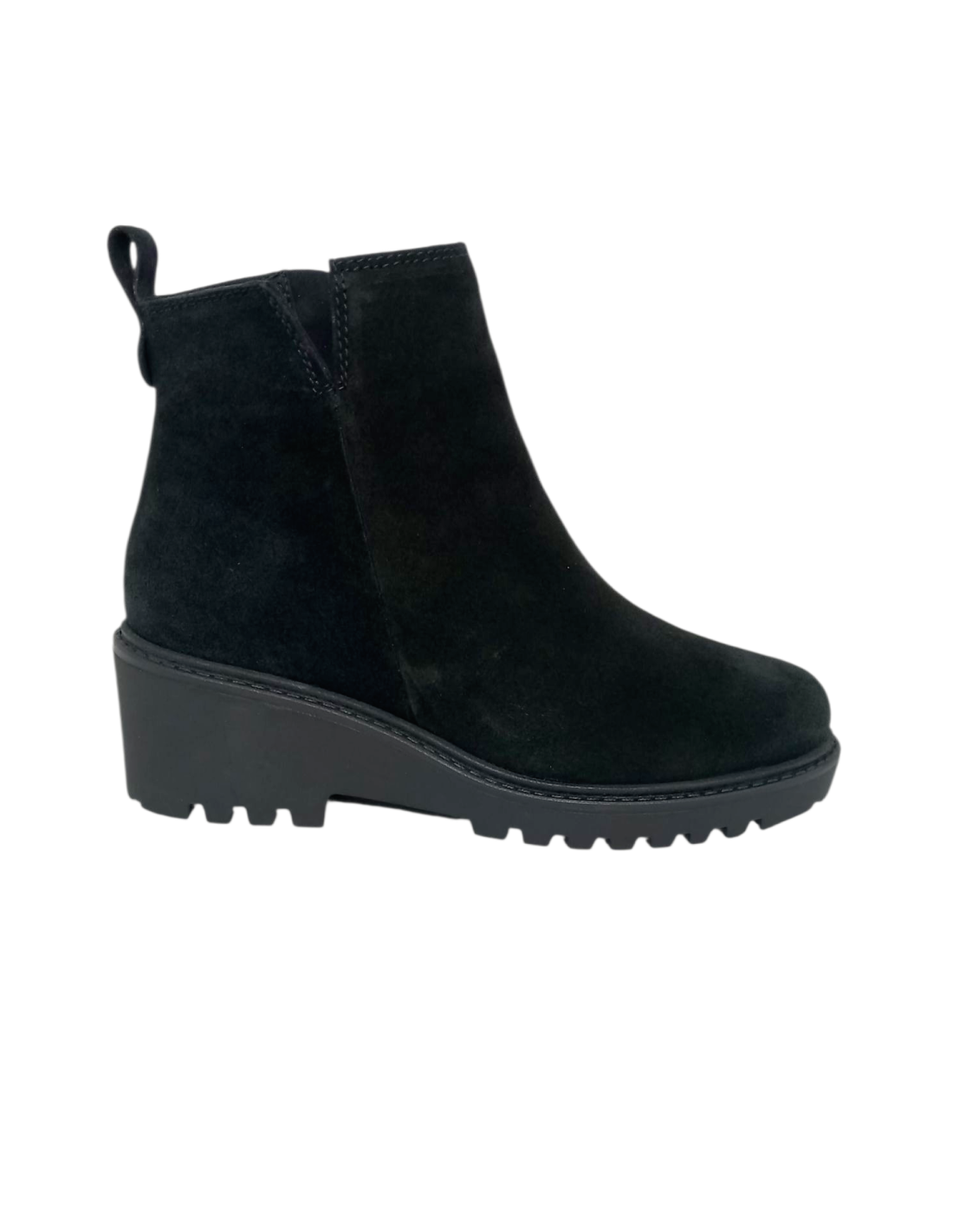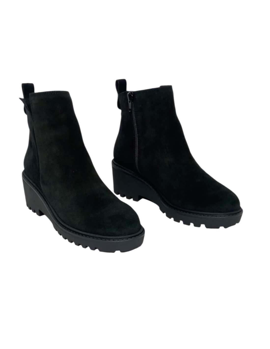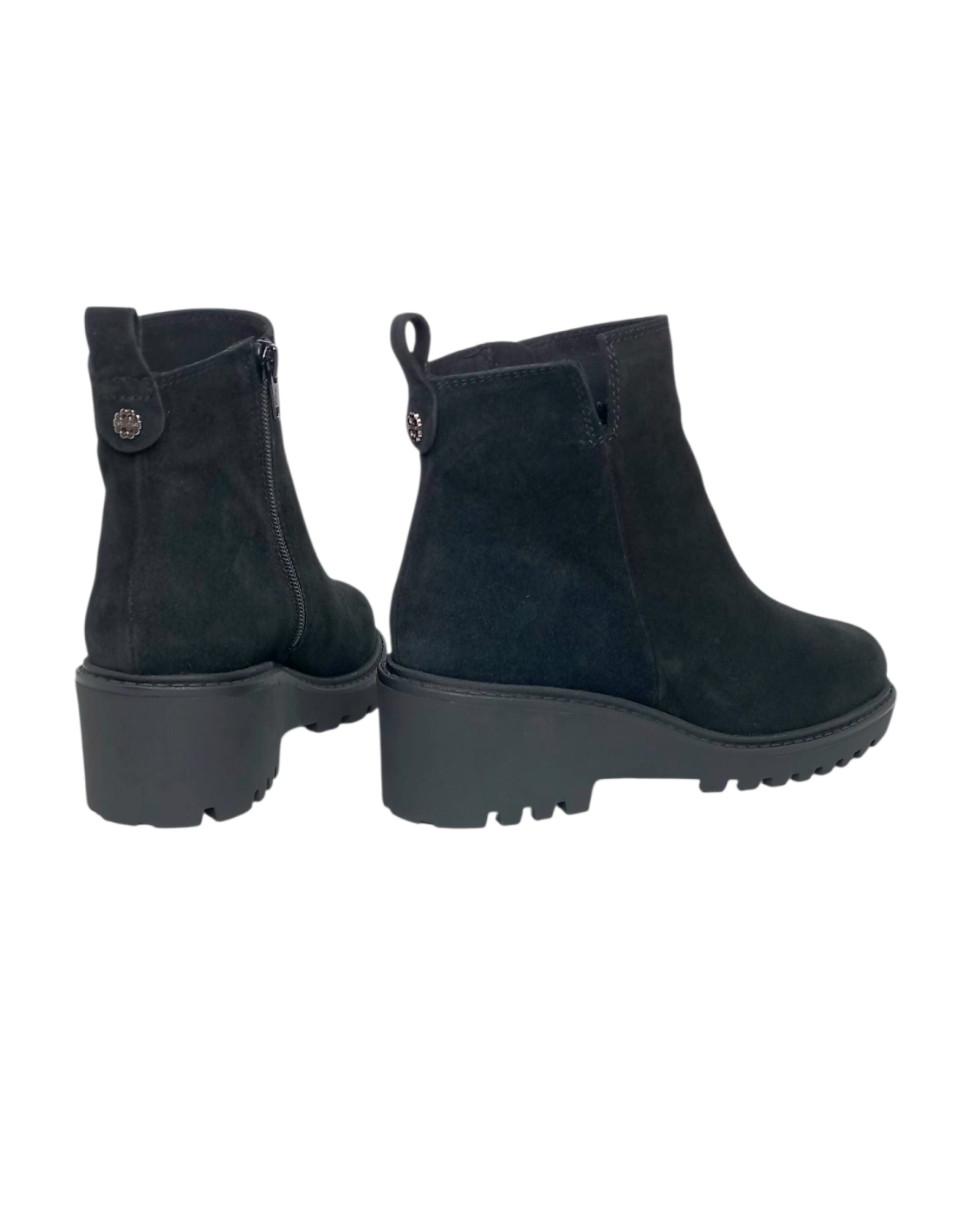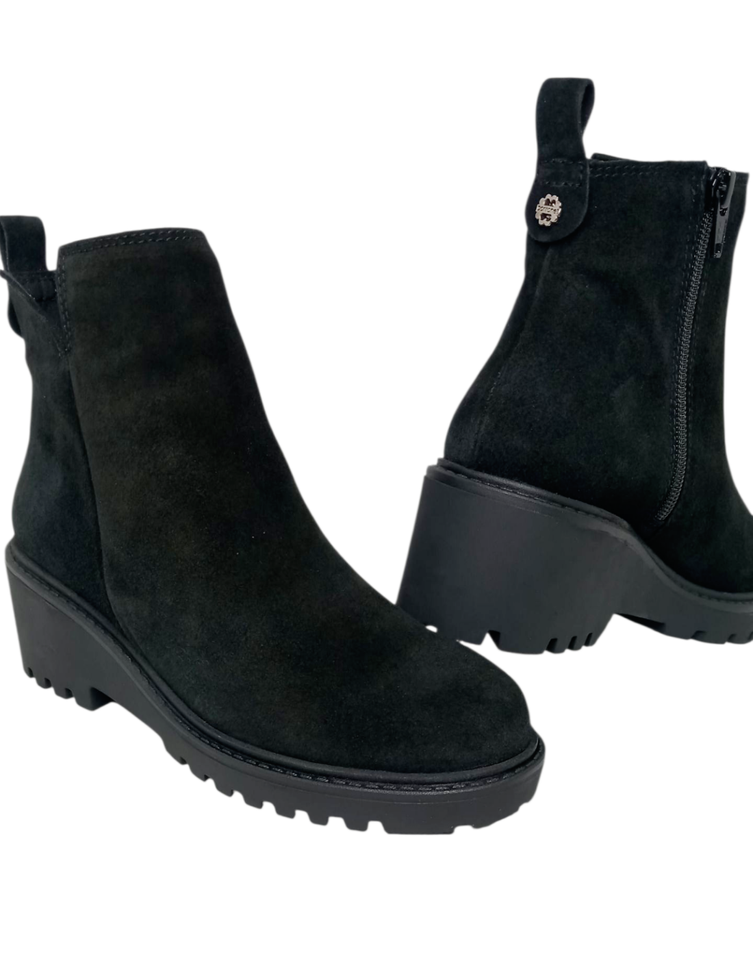 Botín fabricado en piel serraje de color negro, con cierre de cremallera y corte superior en forma de "V" para facilitar el calce.