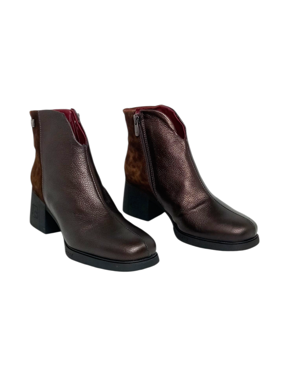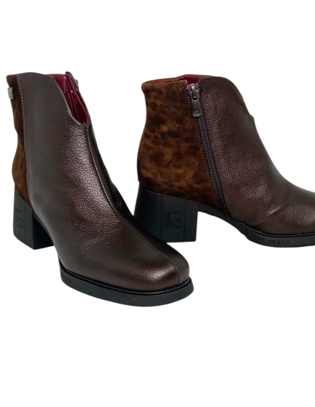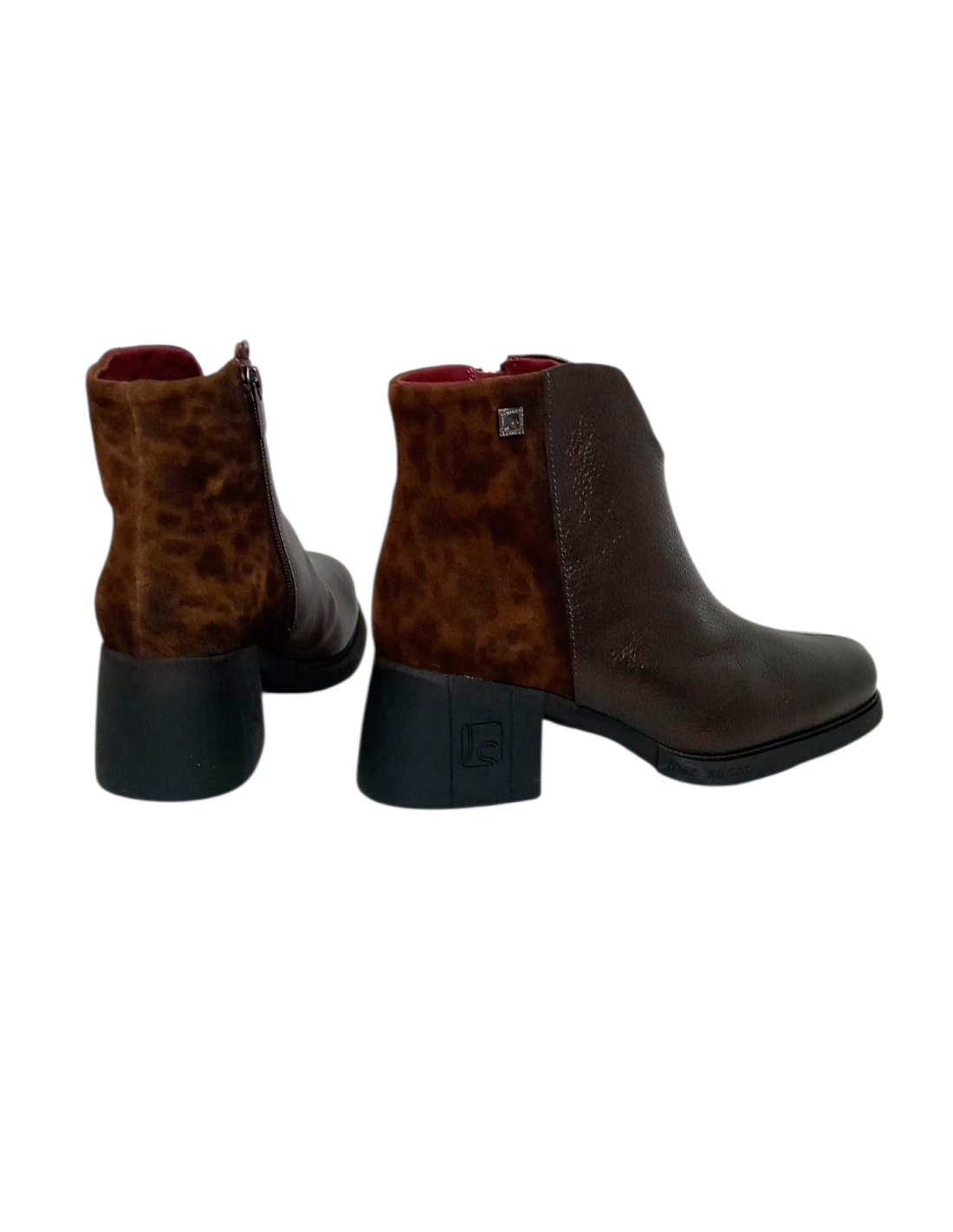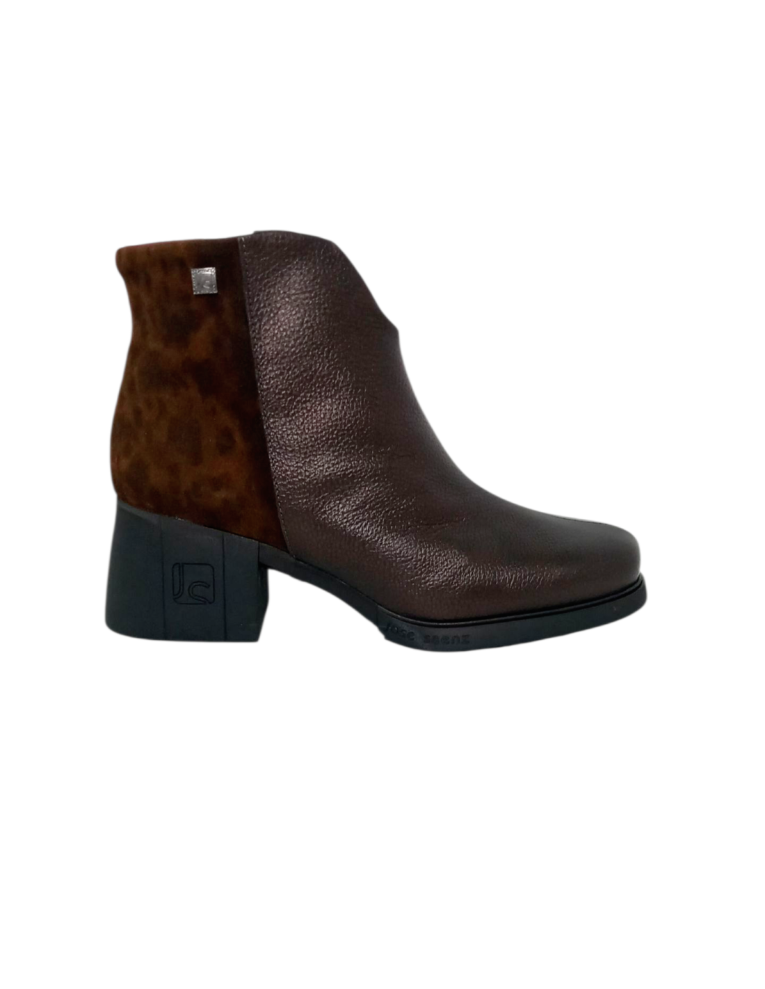 Botín fabricado en piel marrón combinada con piel serraje de animal print de leopardo en la parte trasera.