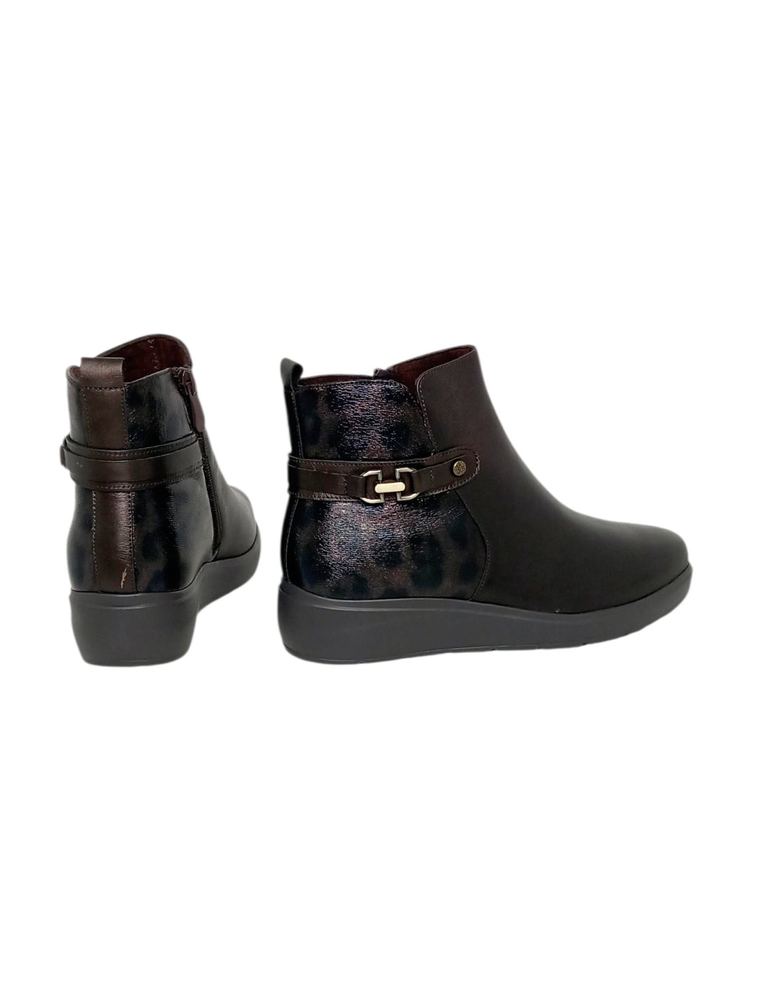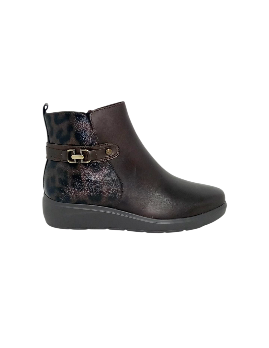 Botín fabricado en piel de color marrón con hebilla en el lateral y parte trasera en piel charol con estampado sutil de animal print de leopardo.