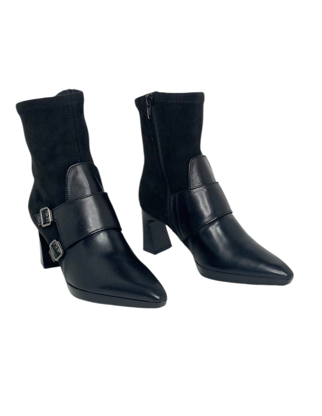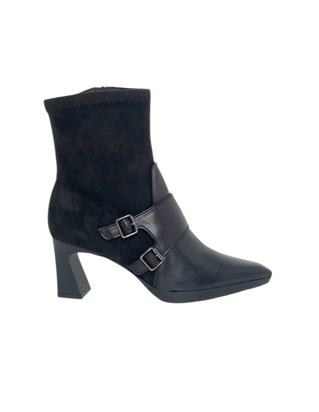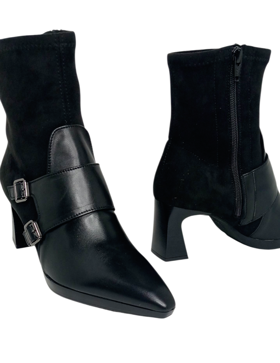 Botín monk strap con puntera afilada para mujer de la marca Hispanitas en dos combinaciones de color, negro y taupe.