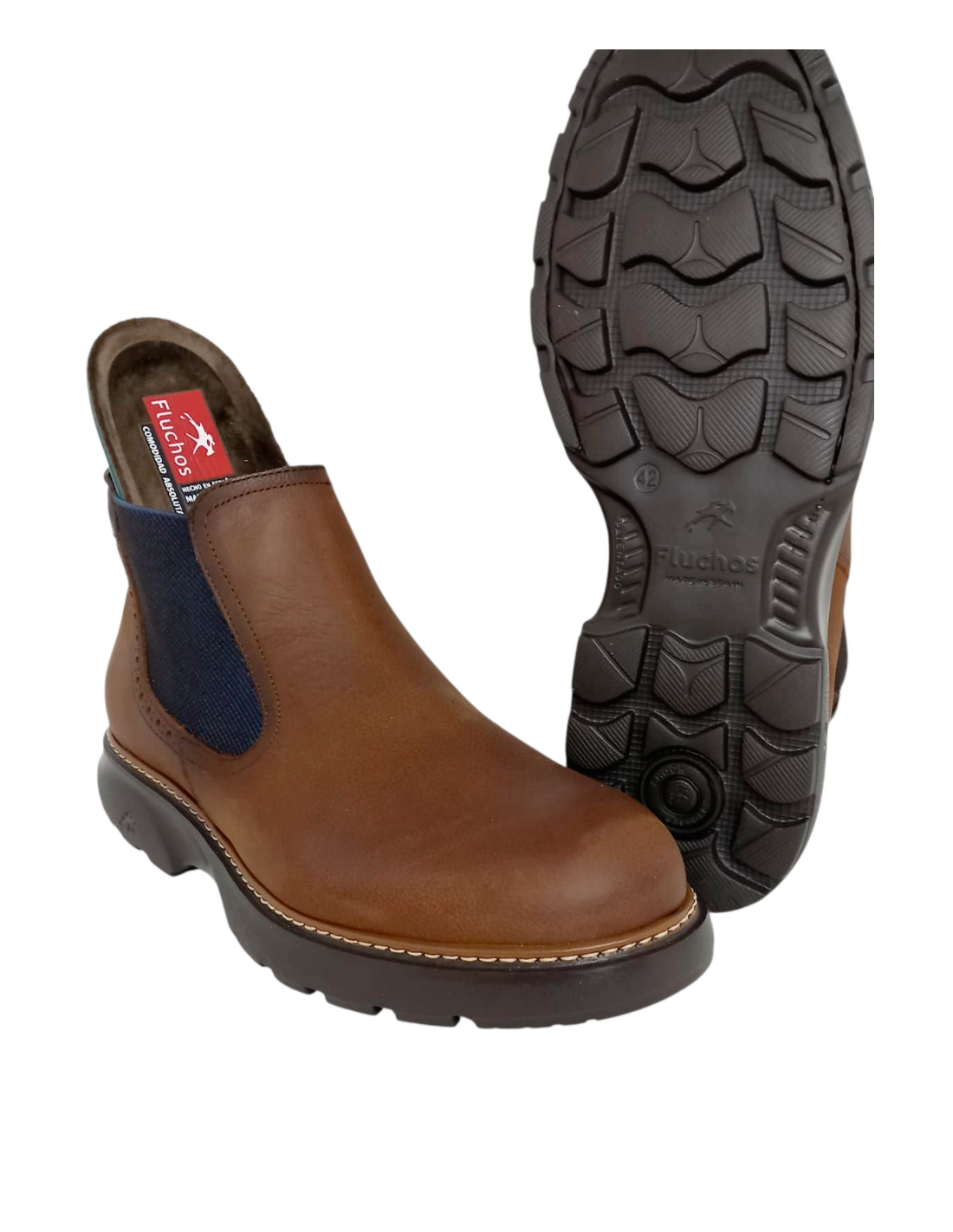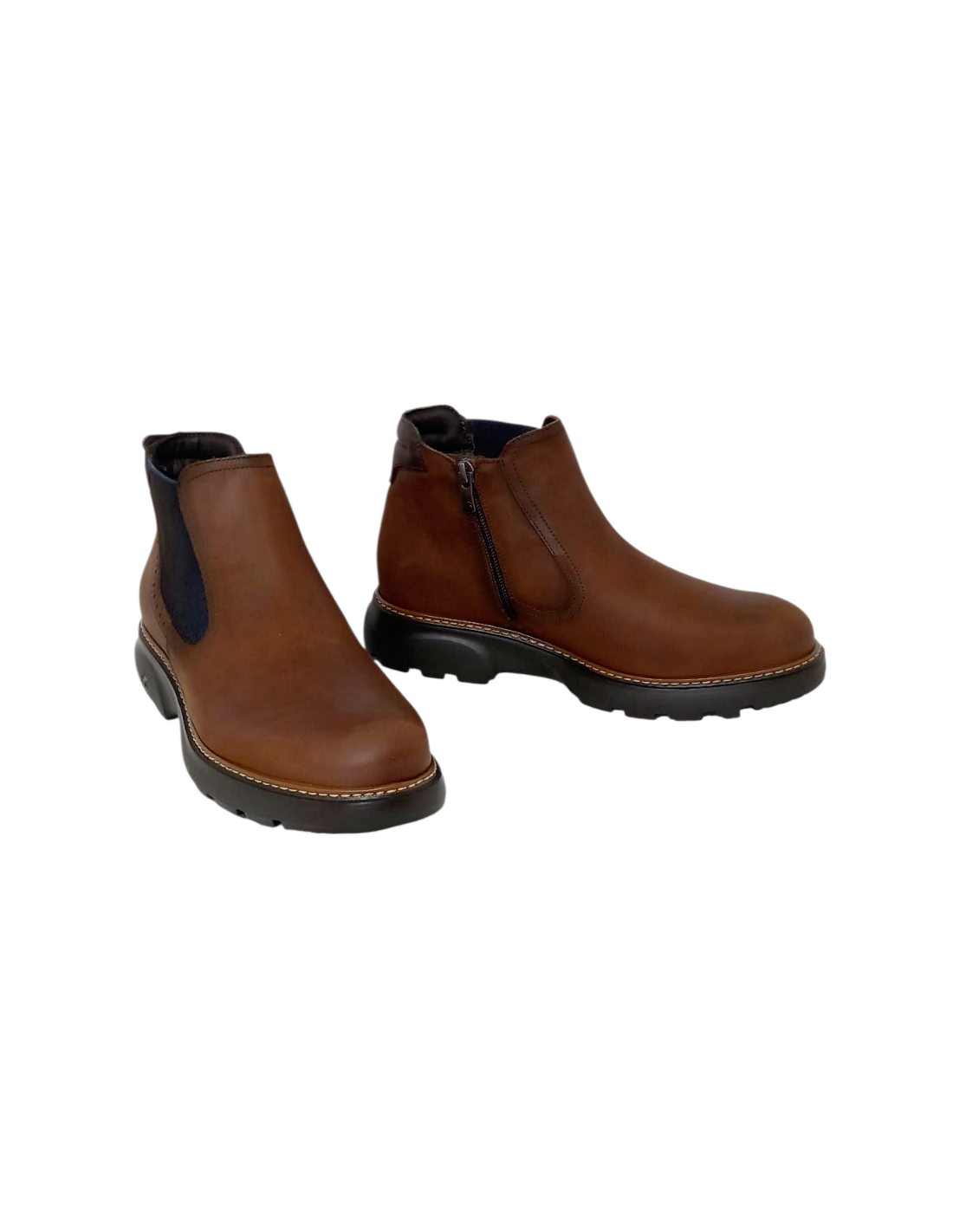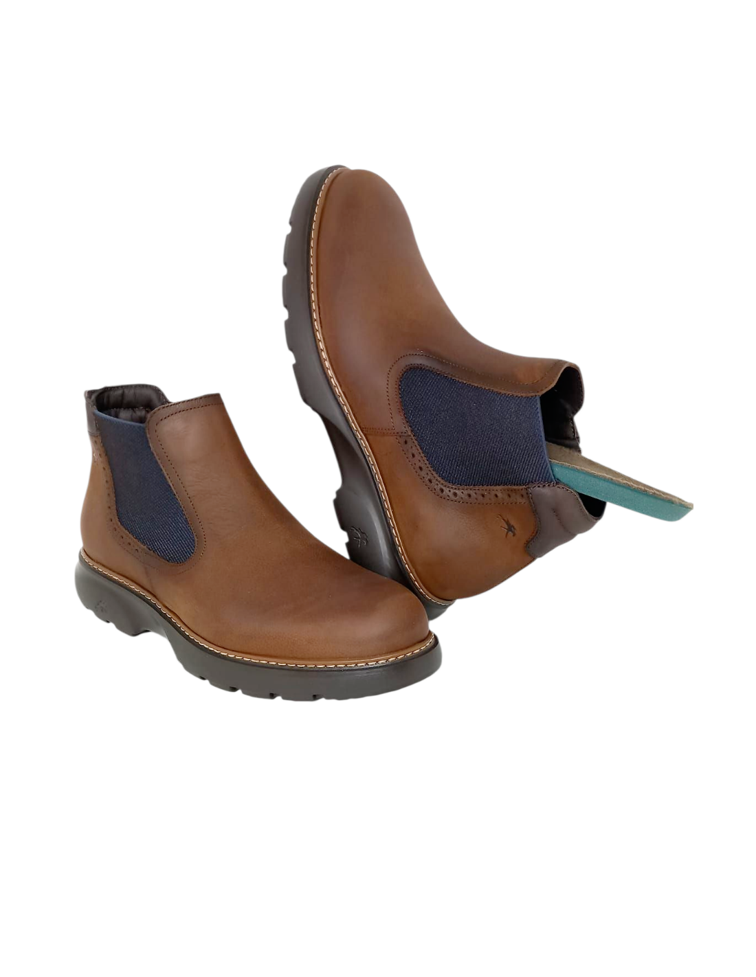 Botín fabricado en piel de primera calidad en color cuero, con un fino contraste de color azul.
