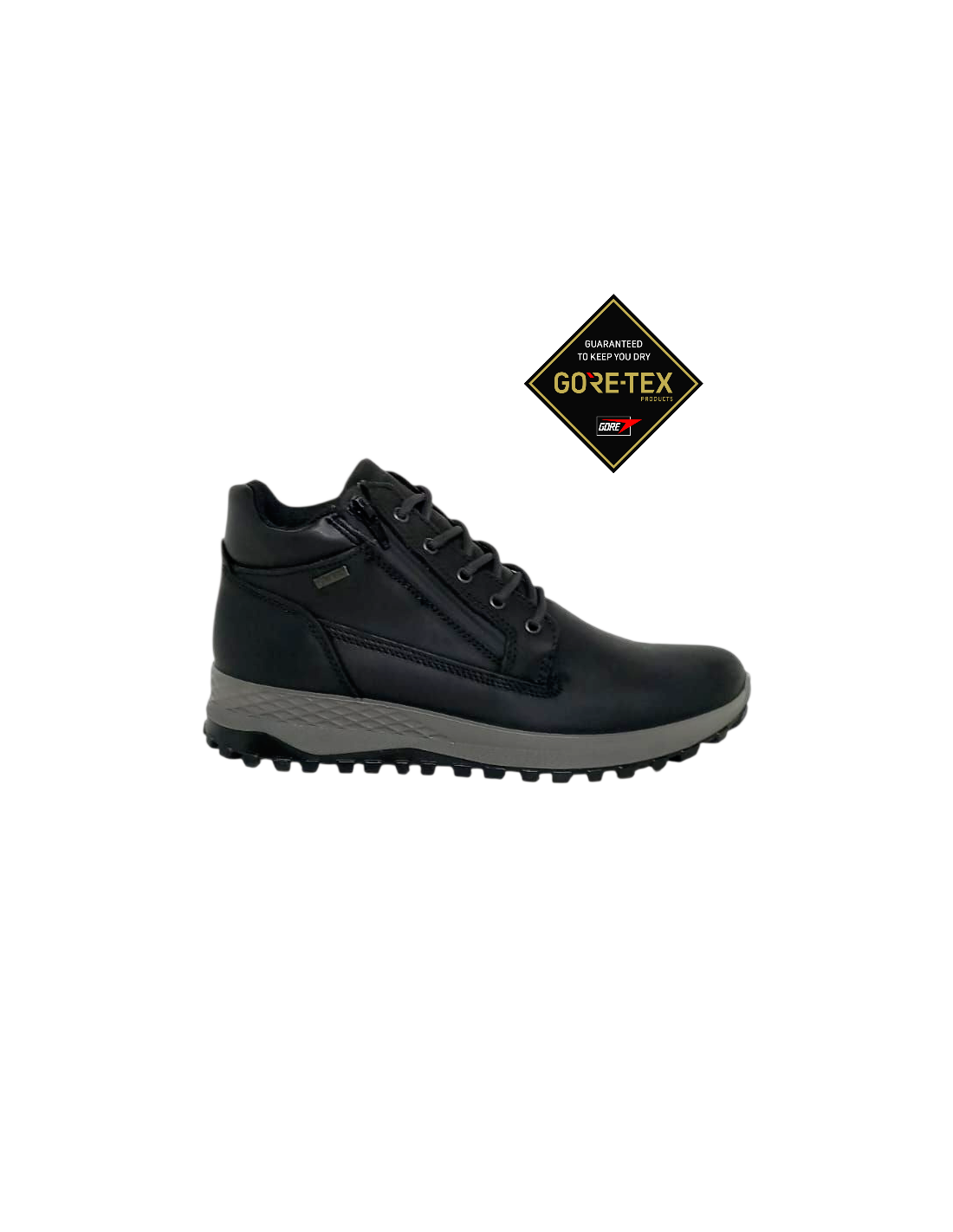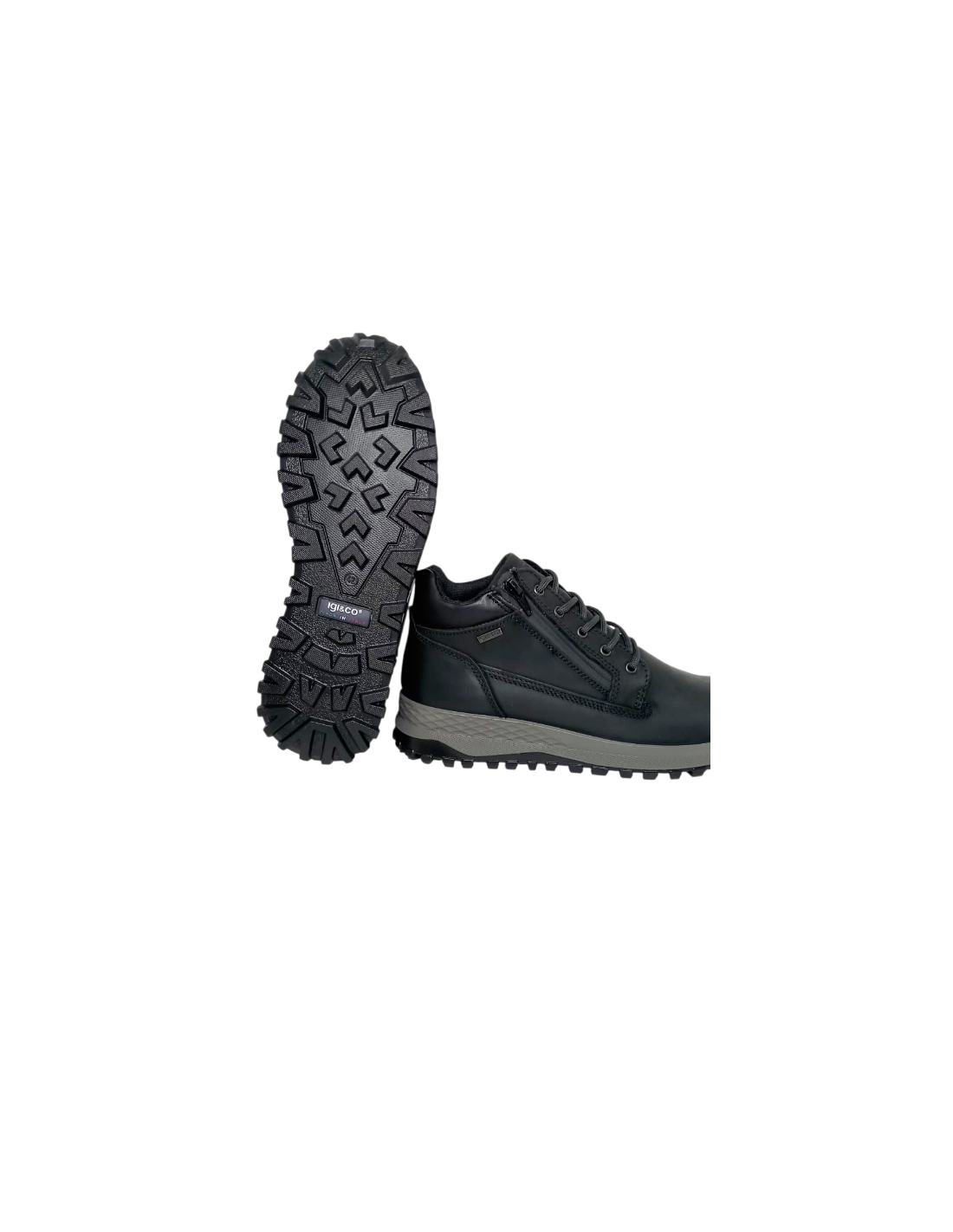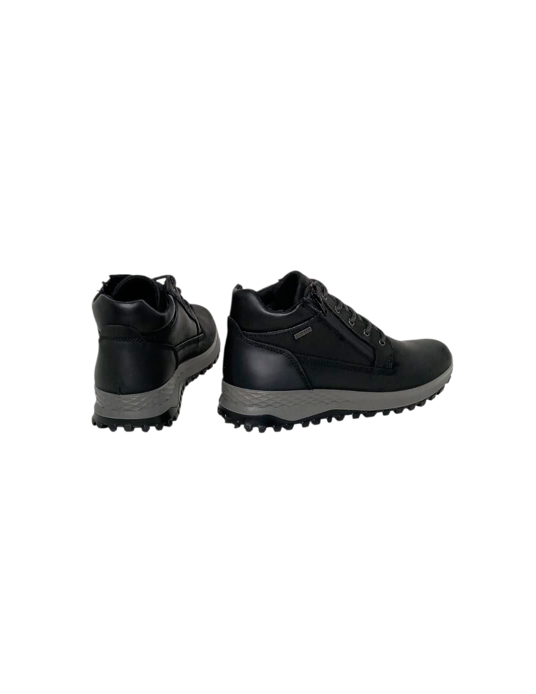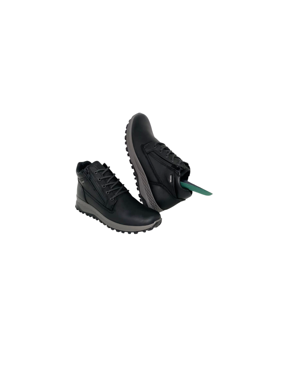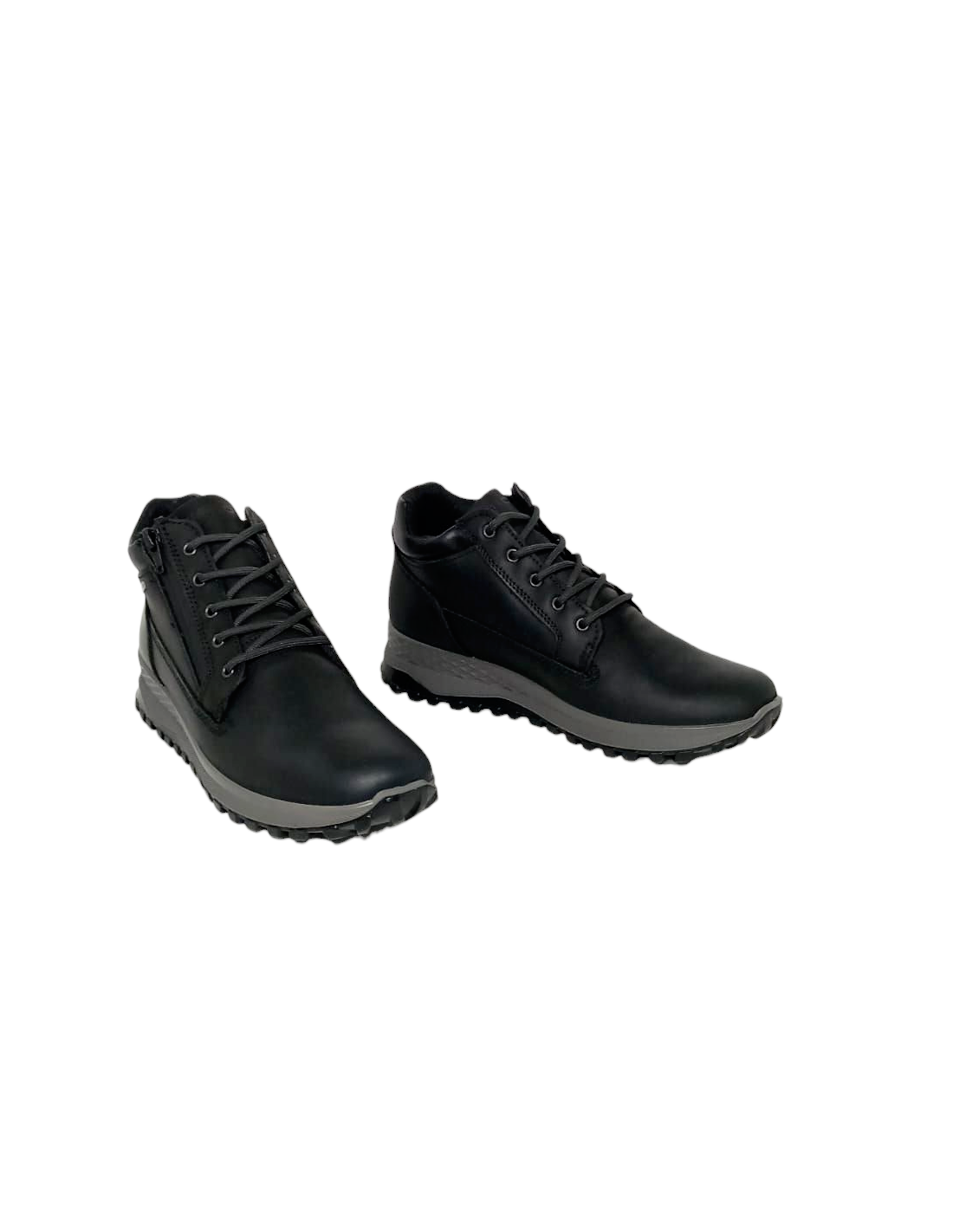 Botín fabricado en piel nobuck engrasada de color negro, con cierre de cordones y cremallera, lo que permitirá un gran ajuste a cualquier tipo de pie sin necesidad de tener que atar y desatar en cada puesta.