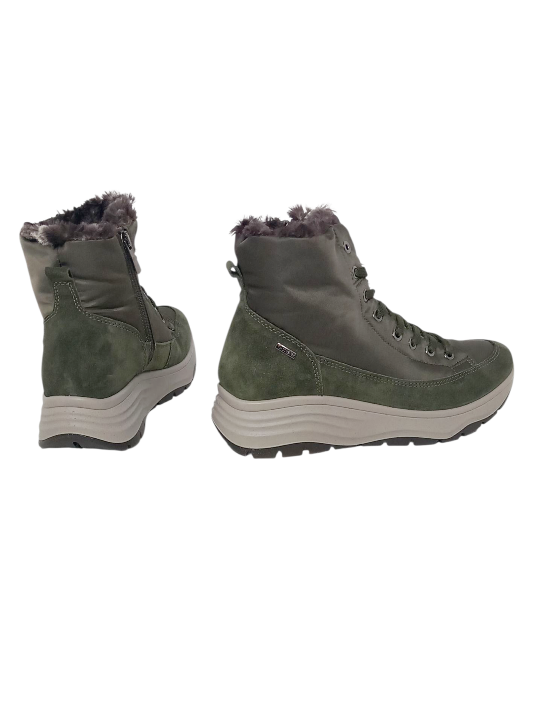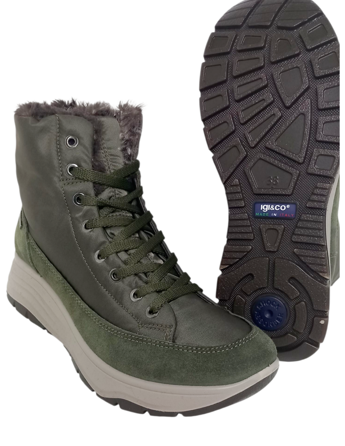 Botín combinado fabricado en piel serraje y nylon de primera calidad en color kakhi.