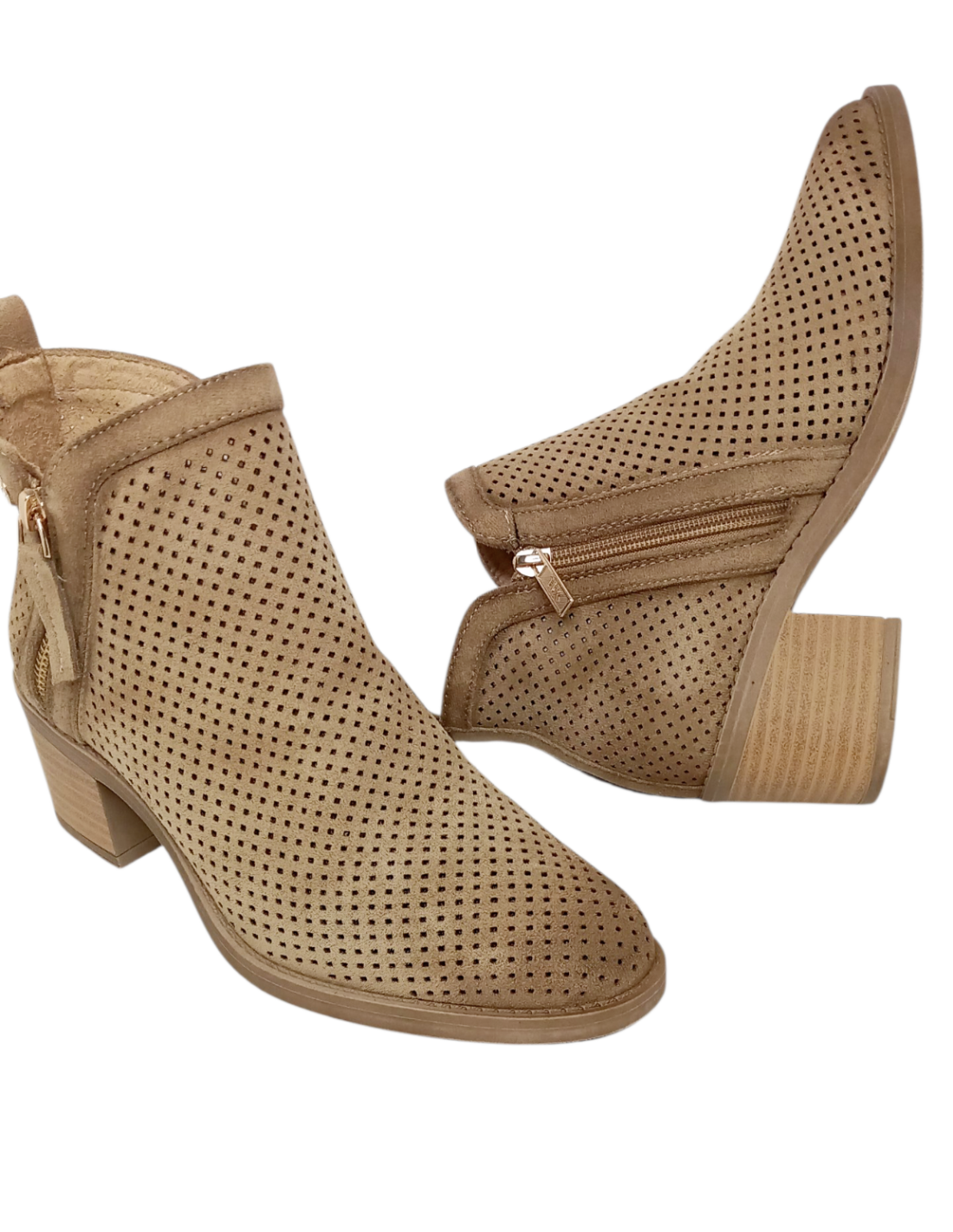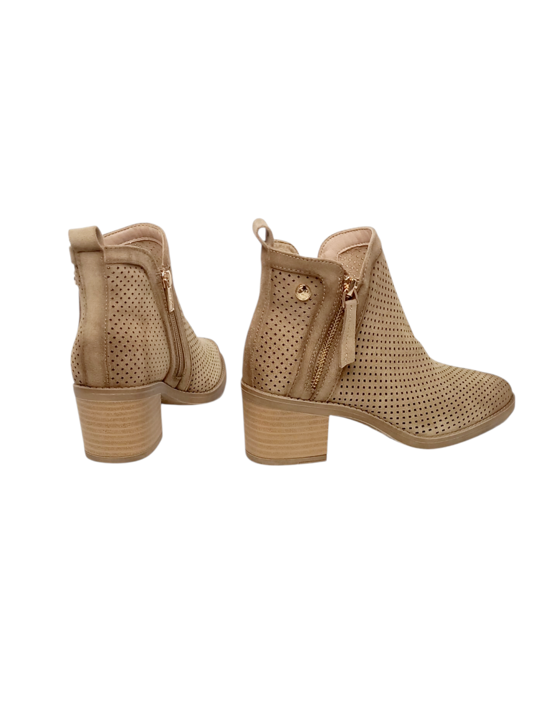 Botín estilo campero fabricado en una suave antelina con diseño troquelado en colores topo y cuero.