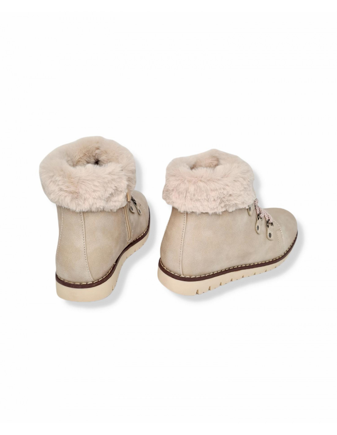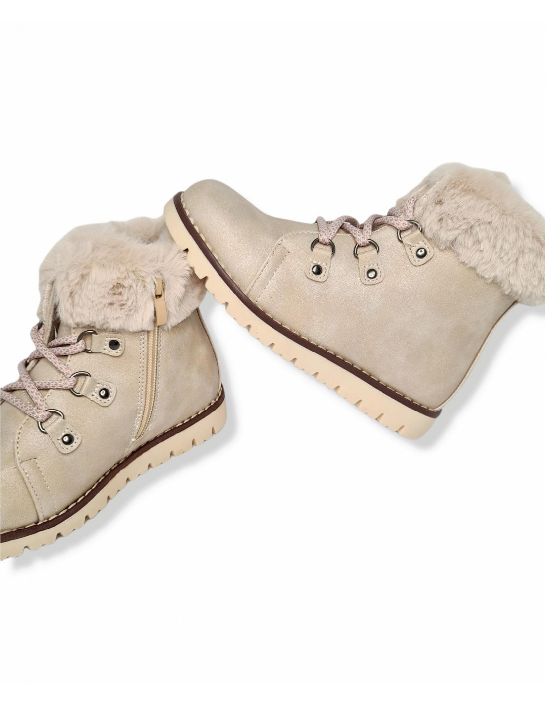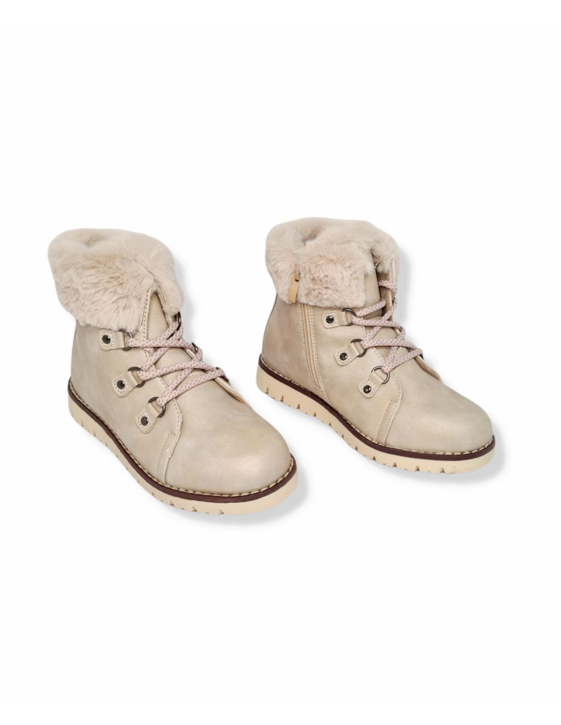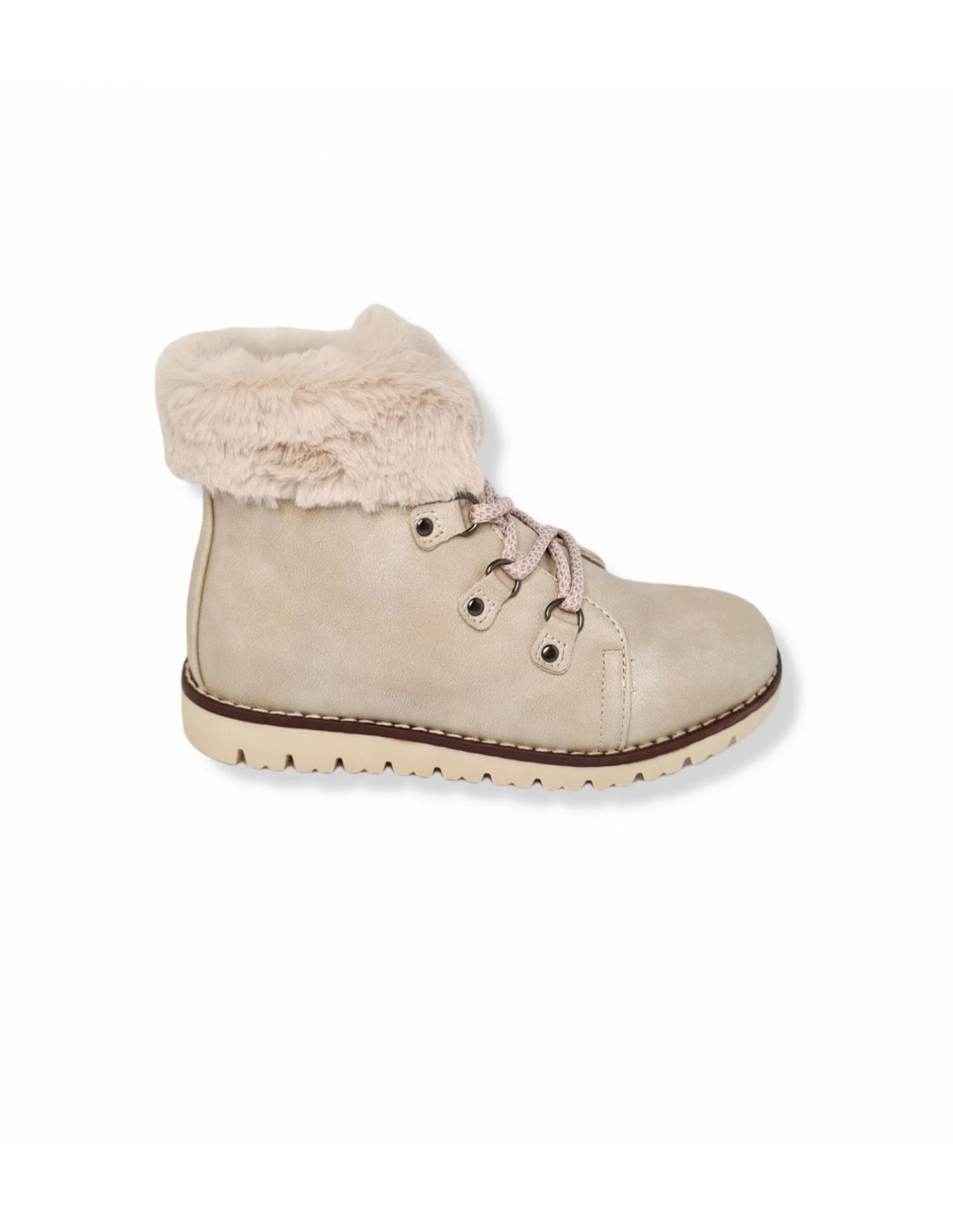 Botín estilo militar, con borreguillo por la parte superior, en color beige. Cierre mediante cordón y cremallera interior, para una buena sujeción del pie. Forro y plantilla en textil, con suela de goma. Unas monaditas para las princesitas de la casa.