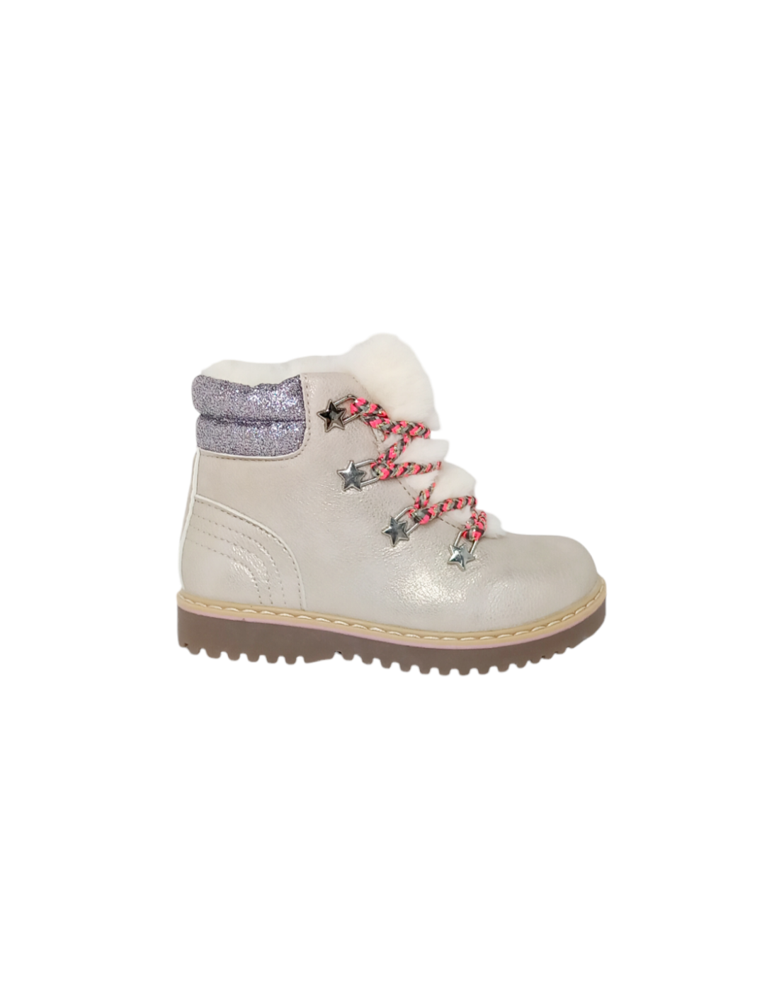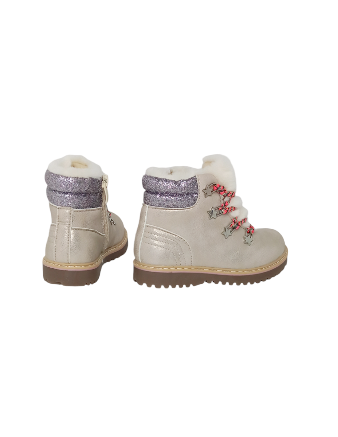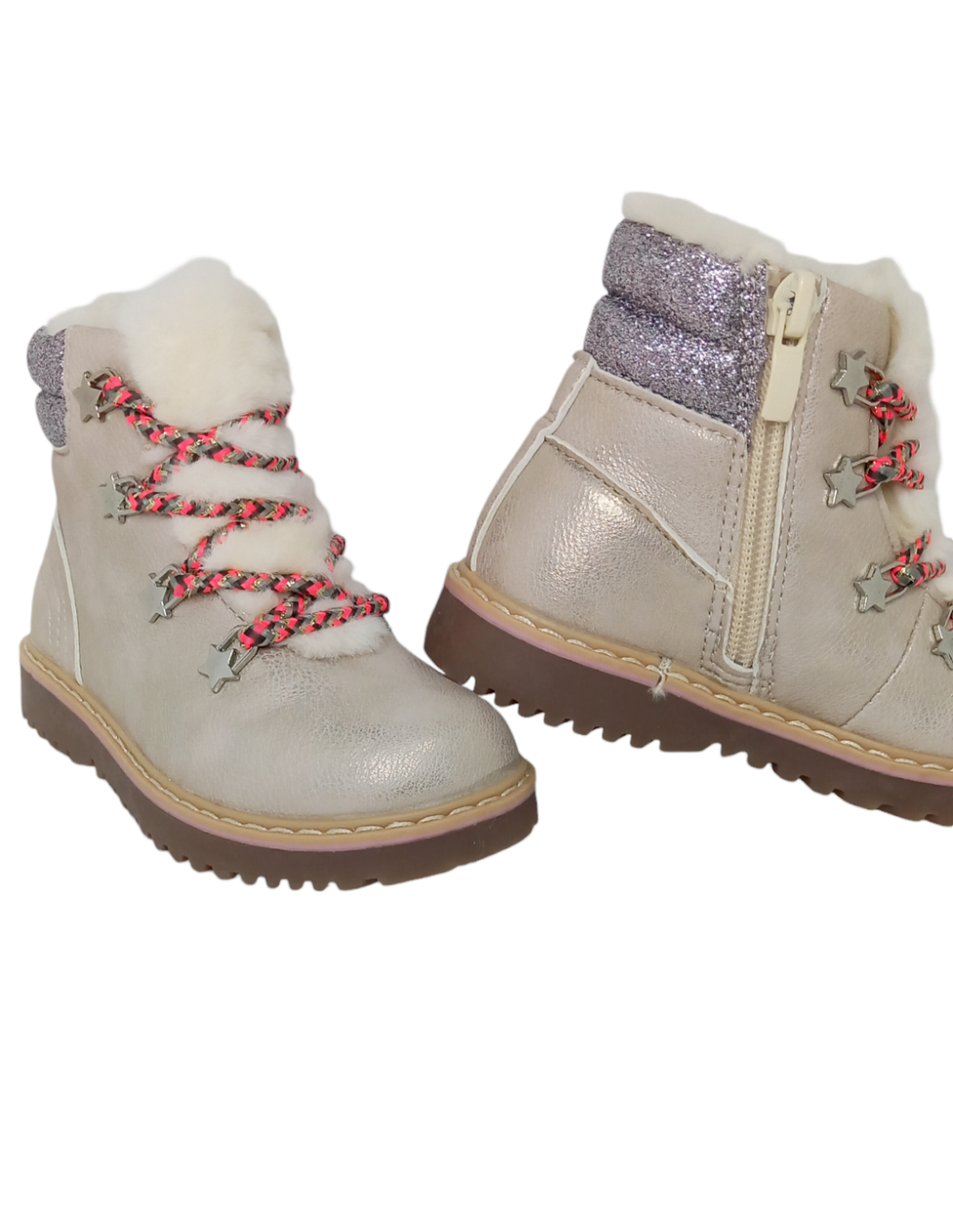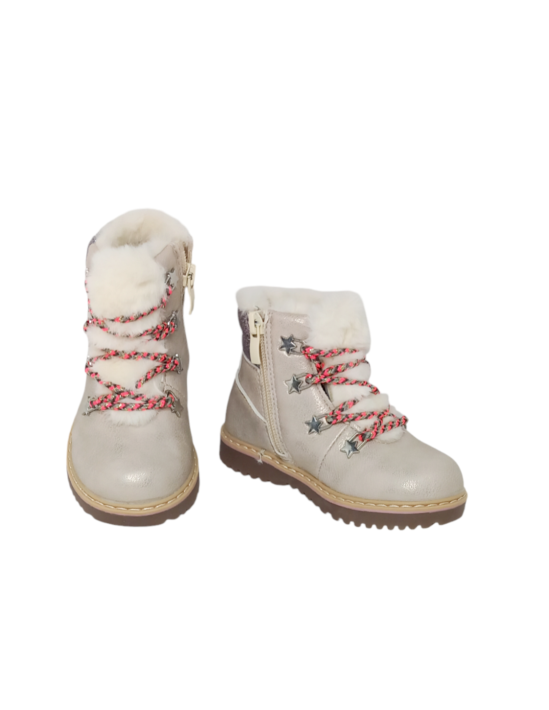 Cuenta con un cierre de lazada rosado que permite un ajuste perfecto. Además también presenta una cremallera lateral interior y un diseño de pelo sintético en su exterior en la zona de la lengüeta y reborde.