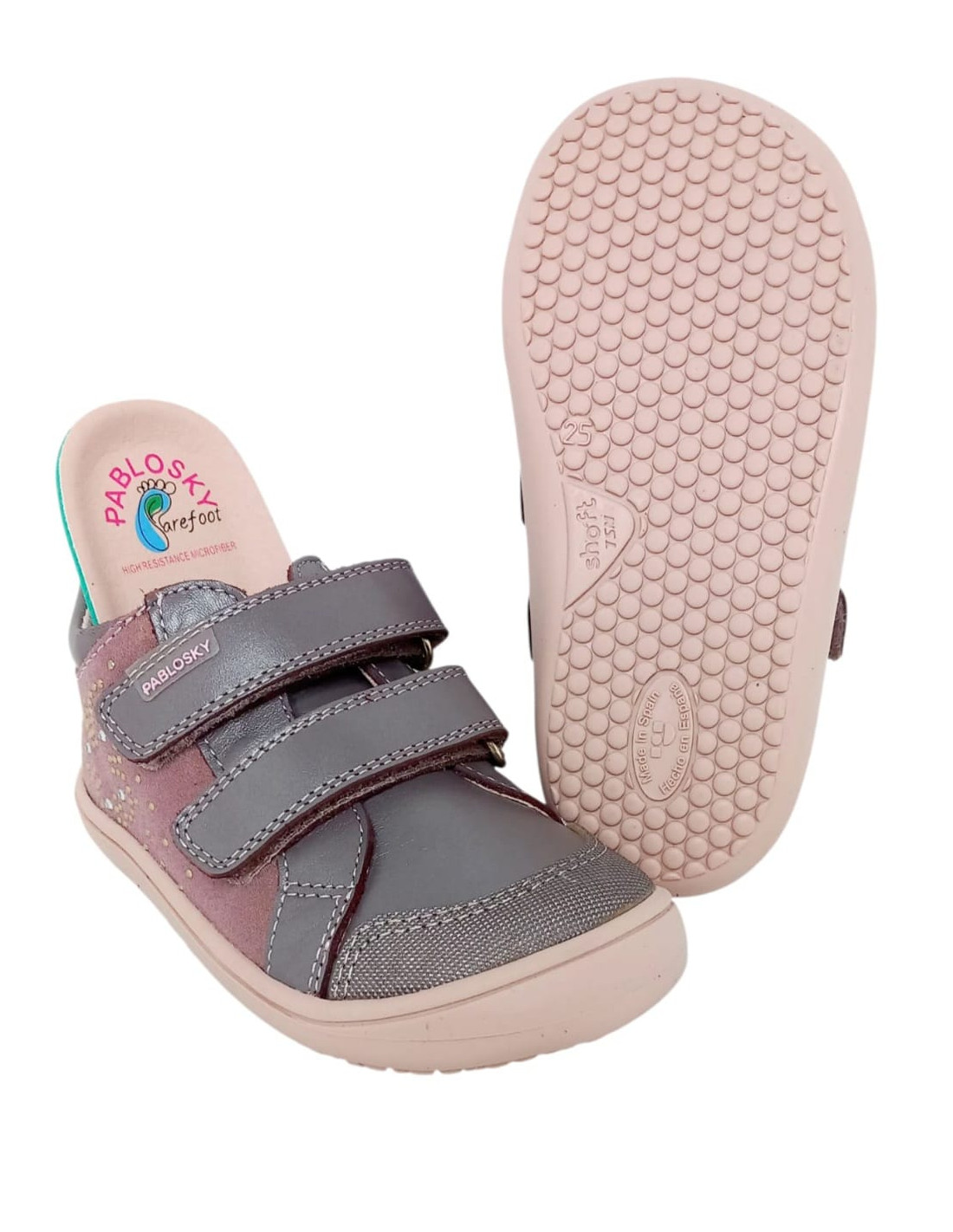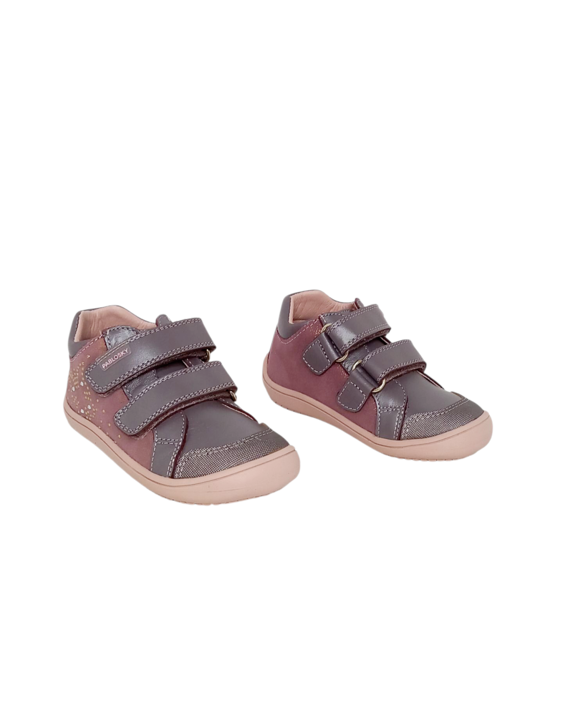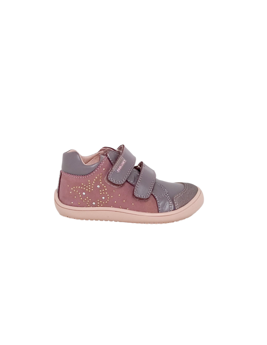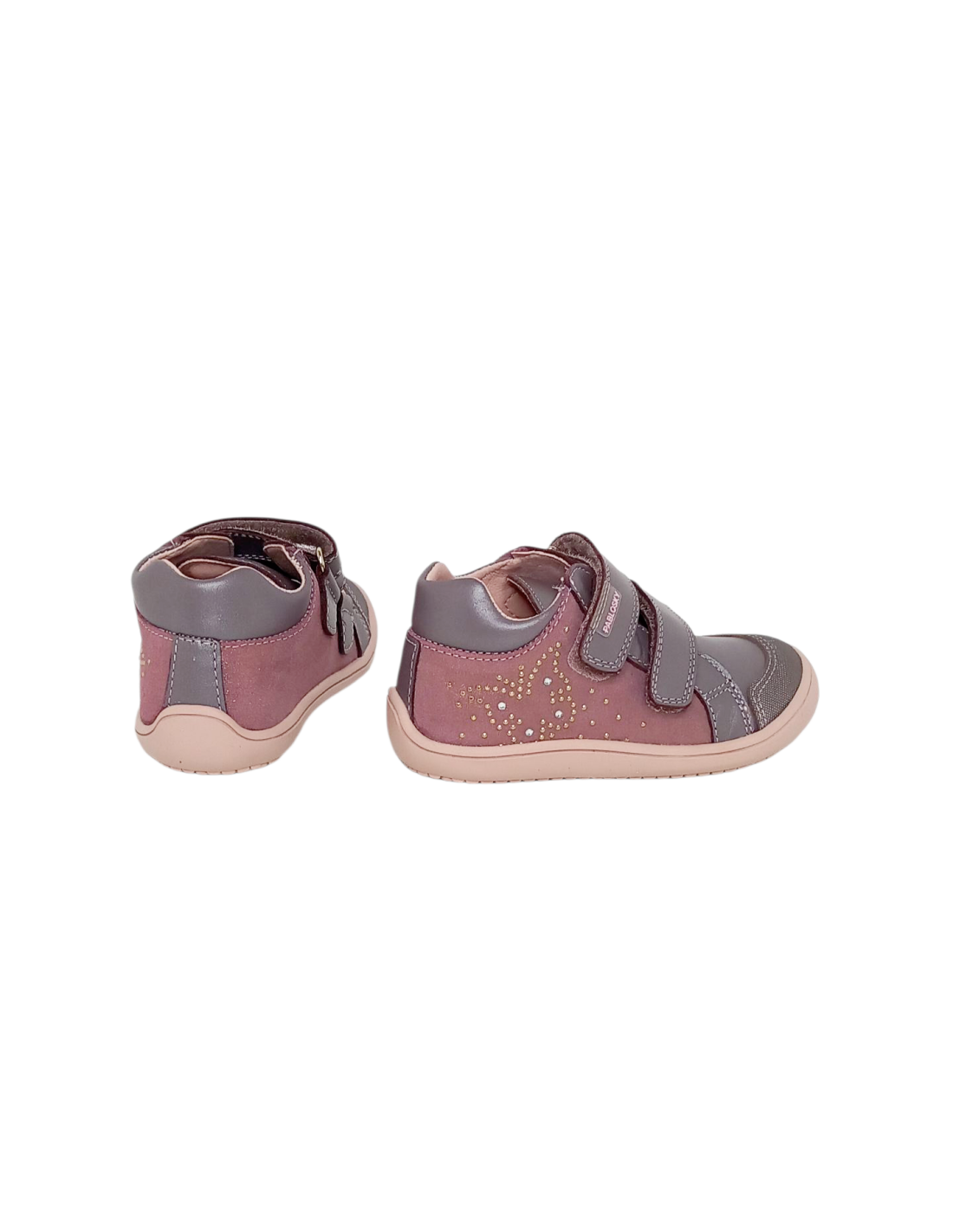 Botín de color malva/rosado con detalle en el lateral de una preciosa mariposa de tachitas doradas y plateadas. Es un modelo súpero blandito para proporcionar el máximo confort a los pequeños de la casa durante este etapa tan importante de su crecimiento, pero lo suficientemente resistente para aguantarles el ritmo. Calzado respetuoso, también llamado "Barefoot".