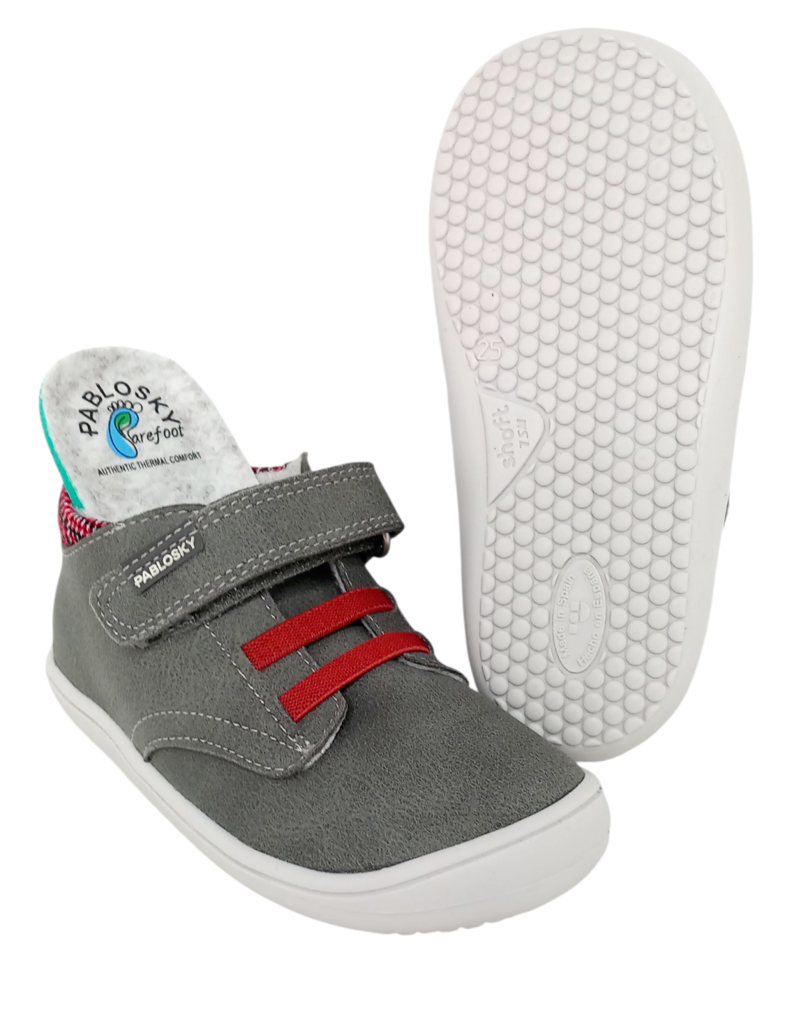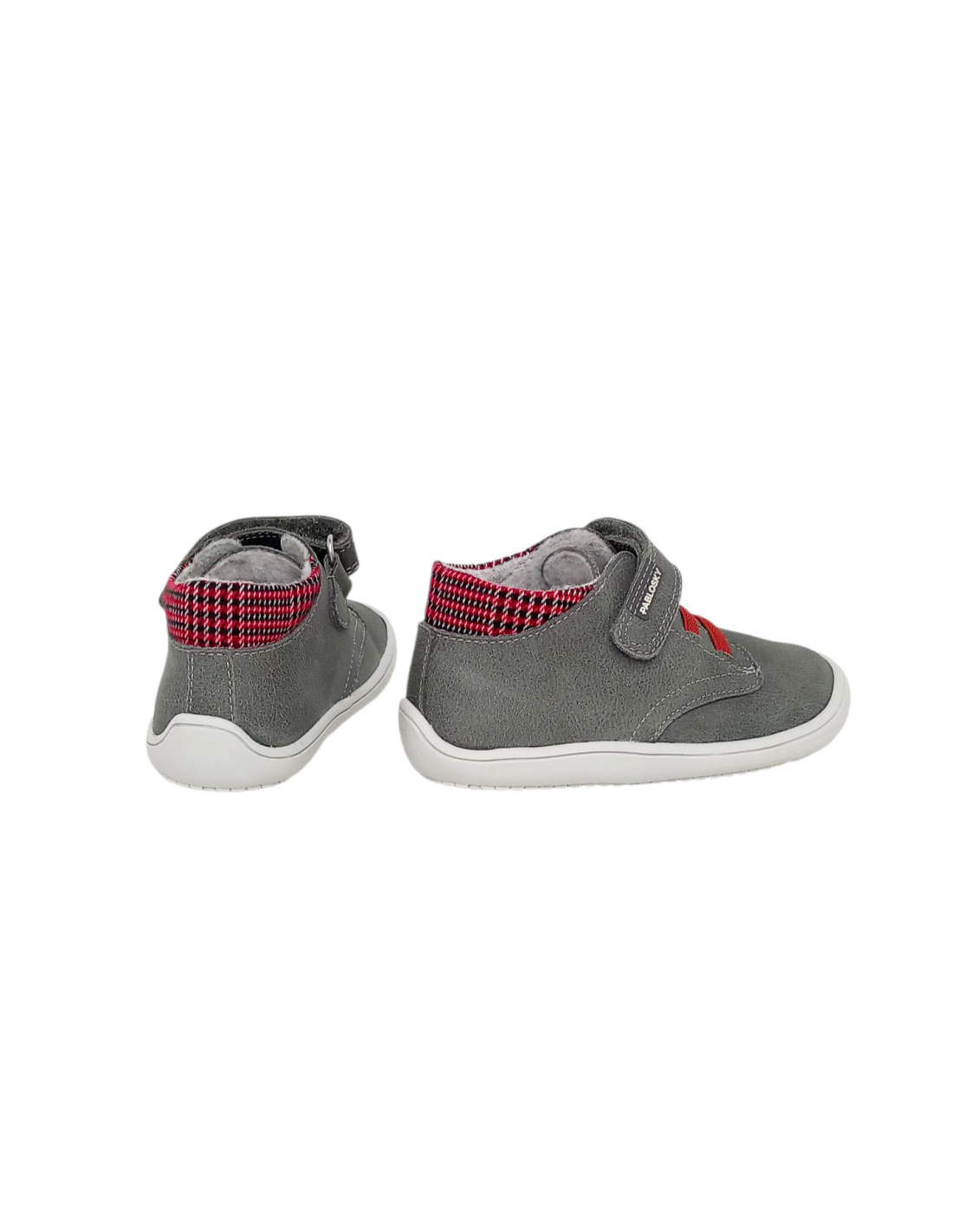 Botín de color gris con un divertido diseño de cuadritos de colores a juego con la cordonera de gomas en color rojo. Es un modelo súpero blandito para proporcionar el máximo confort a los pequeños de la casa durante este etapa tan importante de su crecimiento, pero lo suficientemente resistente para aguantarles el ritmo. Calzado respetuoso, también llamado "Barefoot".