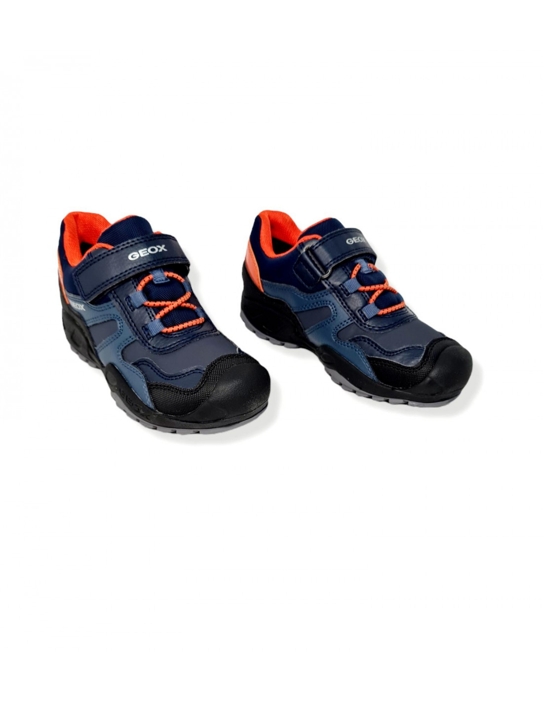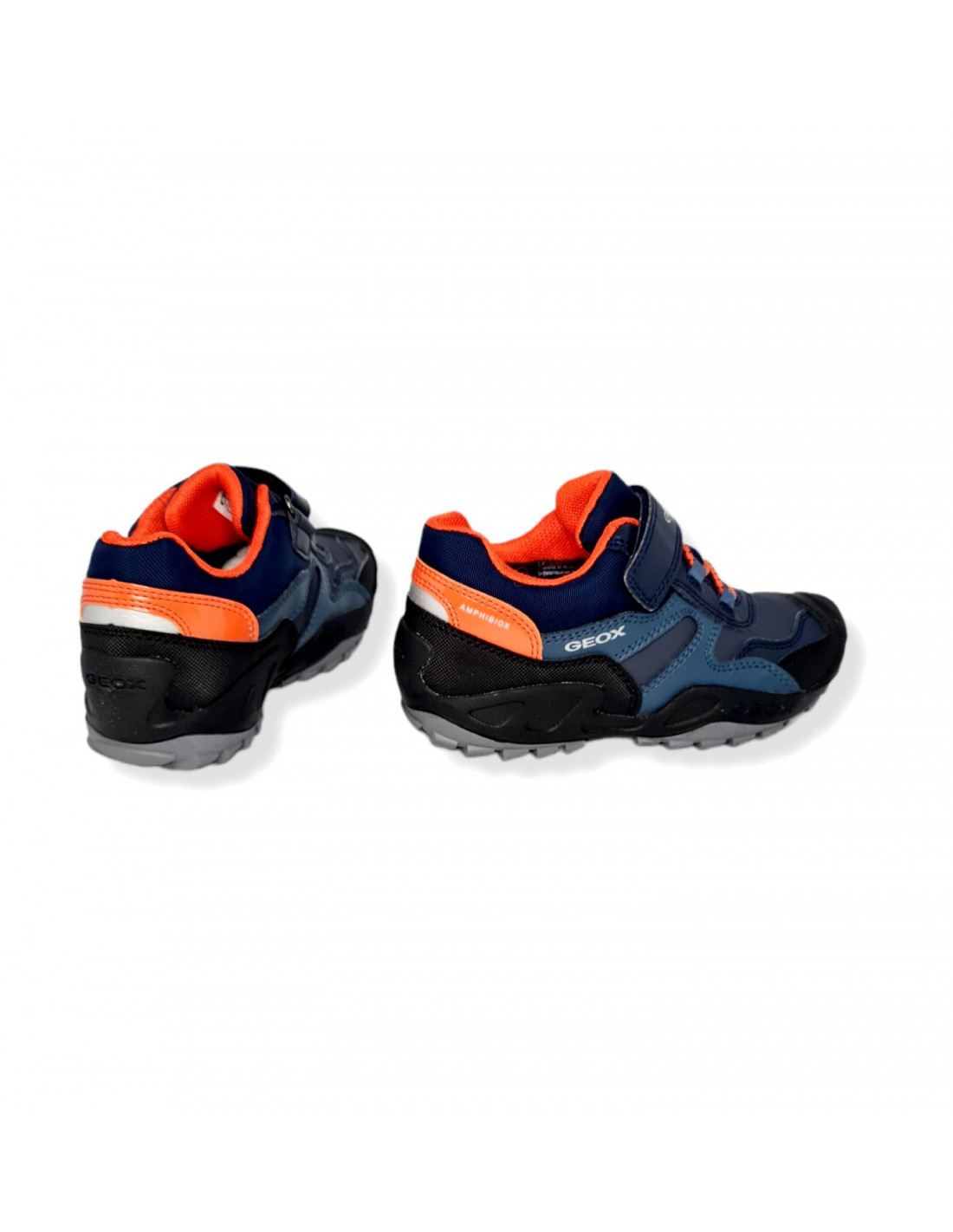Deportivo para los peques de la casa que combina los colores azul, negro con toques en naranja, con refuerzo en la puntera y talonera