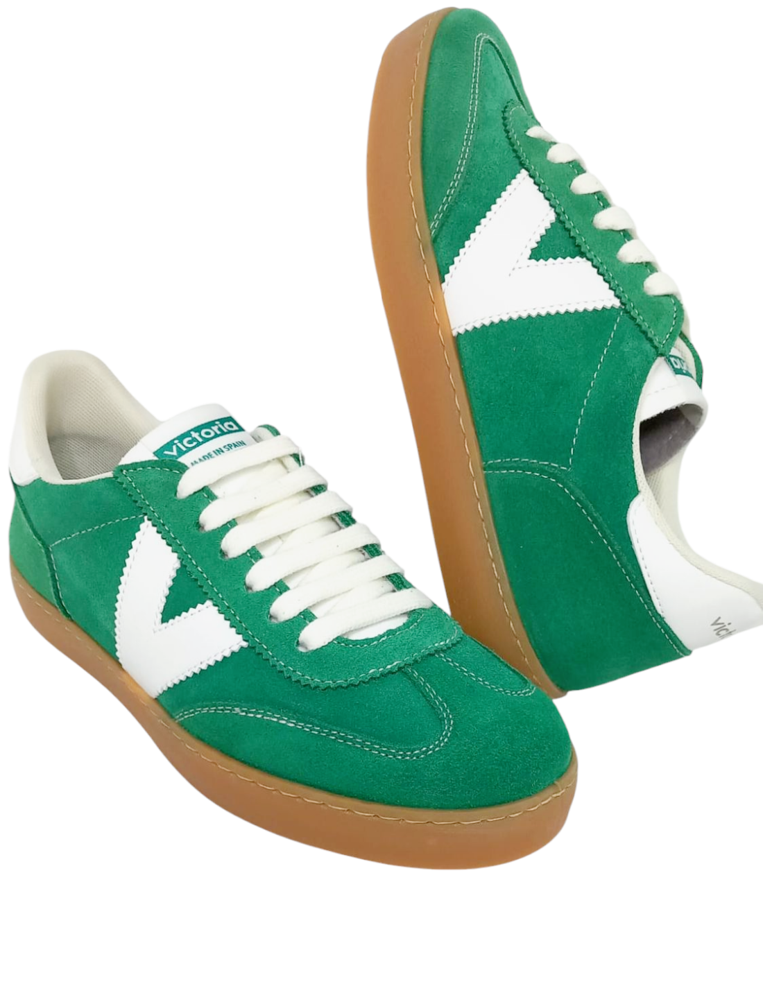 Zapatilla de estilo casual fabricada en serraje color verde combinado con partes de material efecto piel de color blanco, además de la suela en color caramelo.