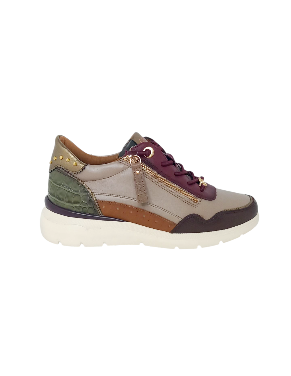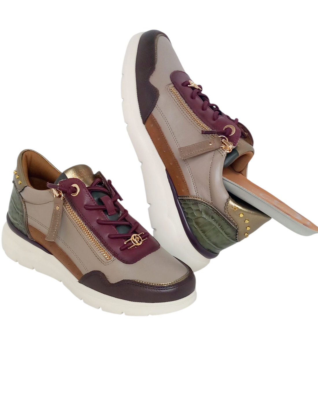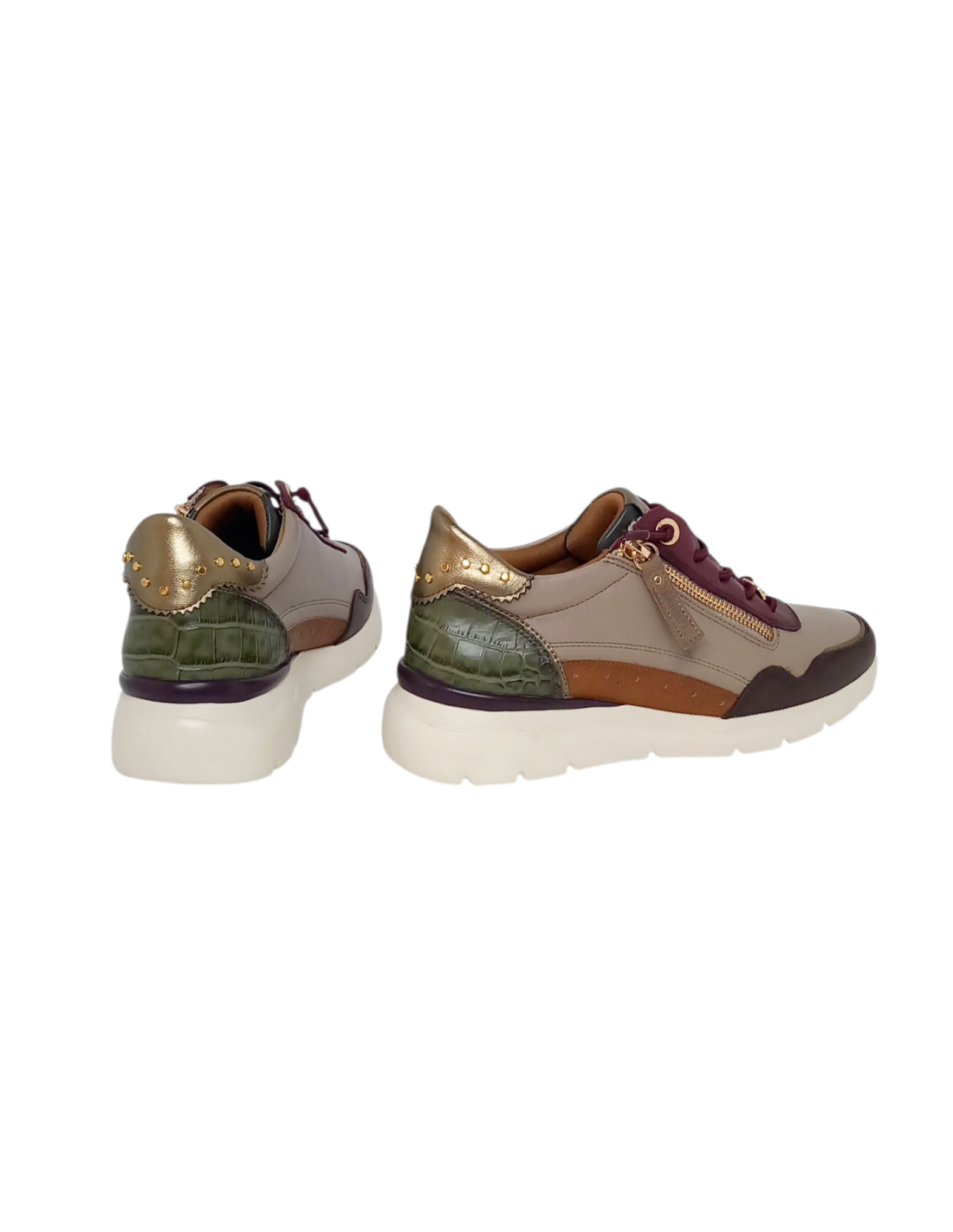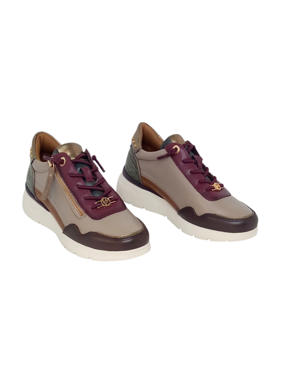 Zapatilla deportiva fabricada en piel y una original combinación de colores: taupe, burdeos, marrón, kakhi, dorado y cuero, además de pequeñas tachuelas doradas que adornan tanto el lateral como el talón.