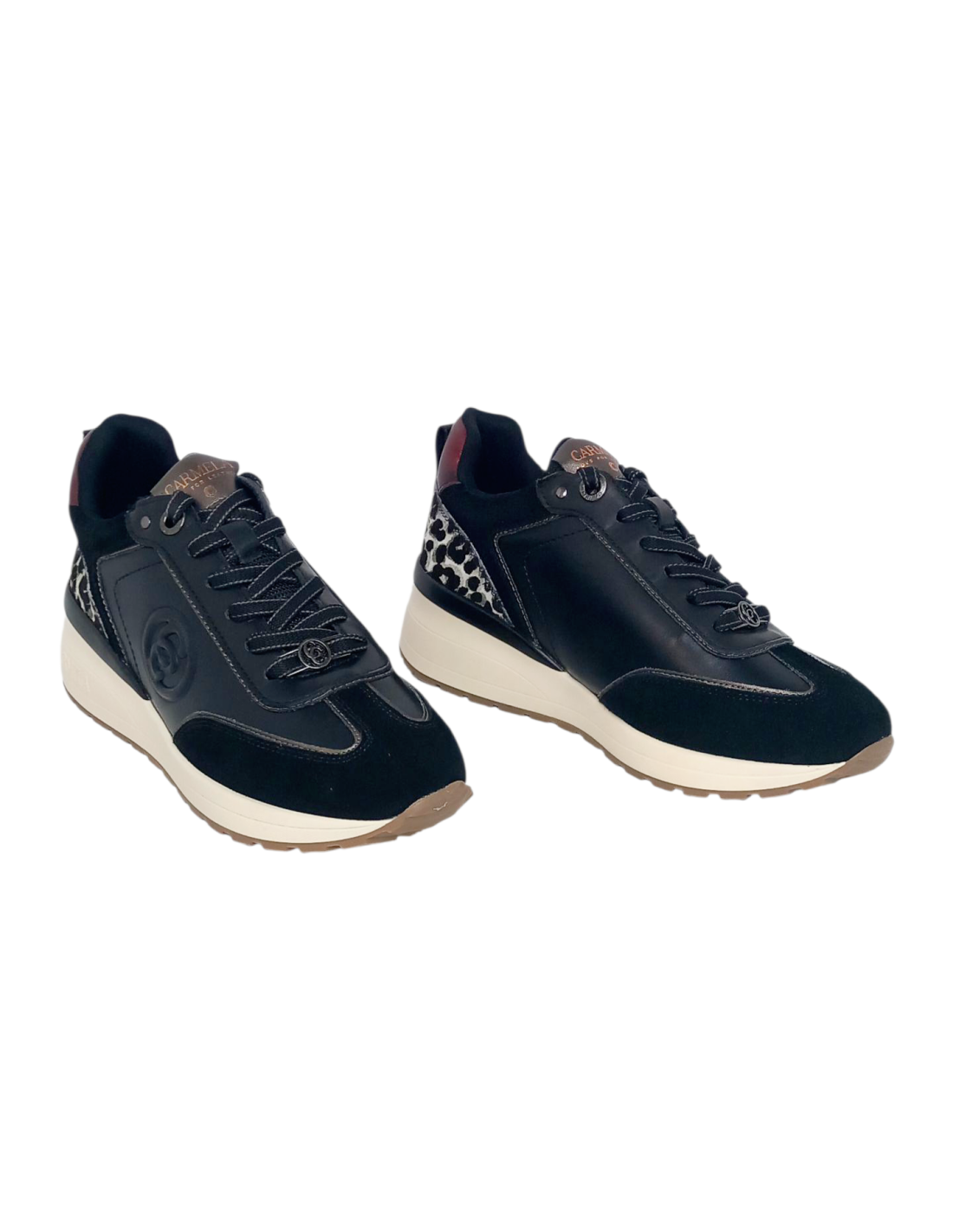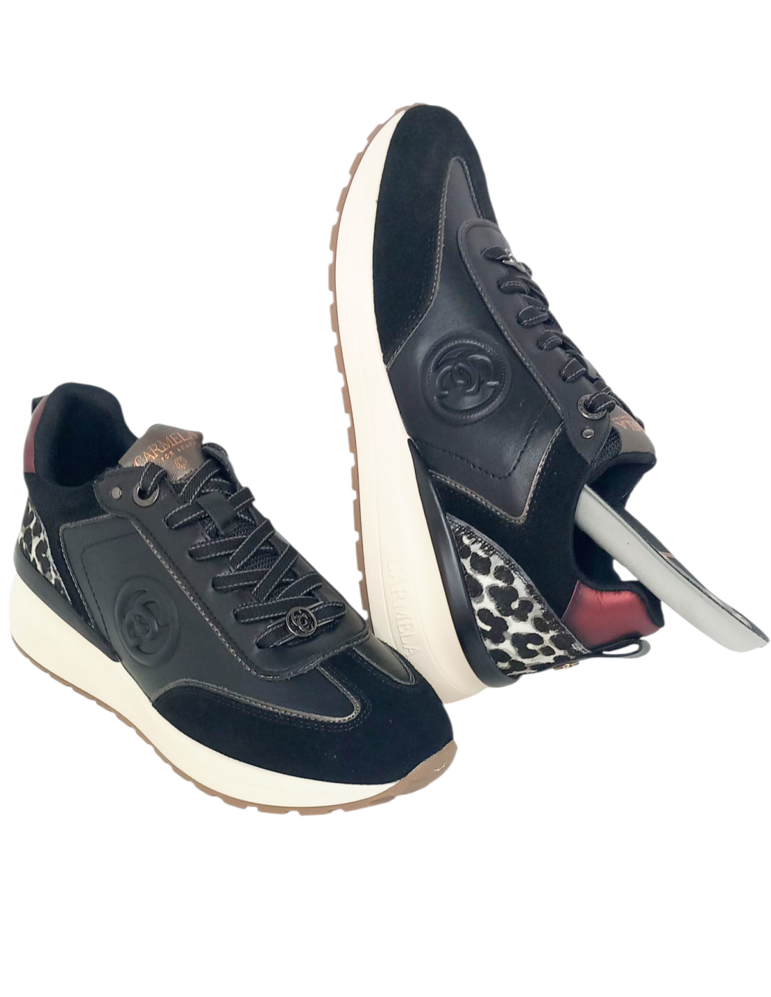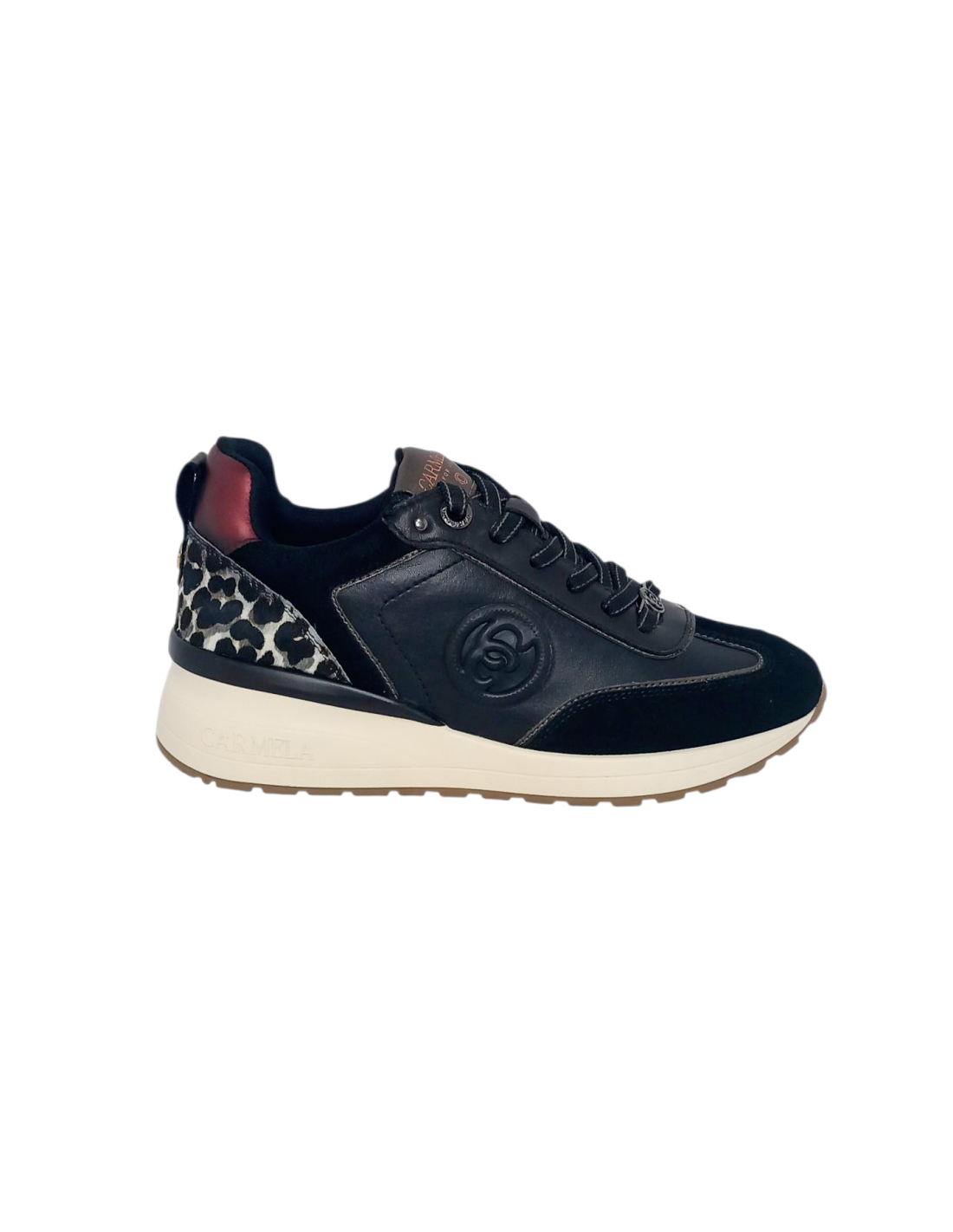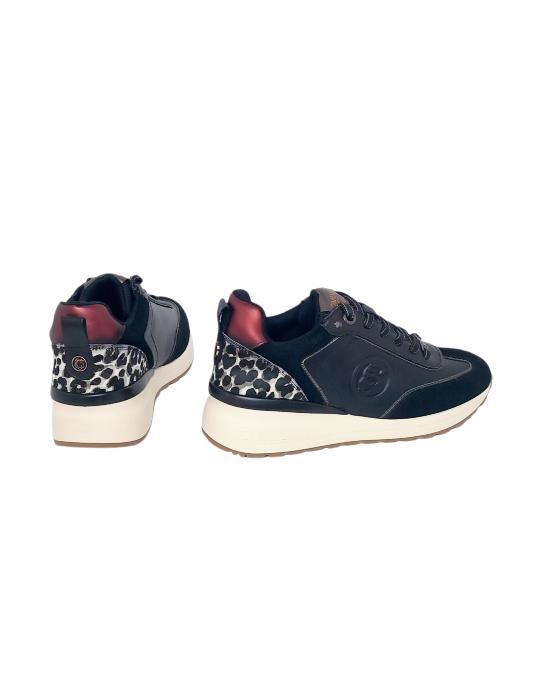 Zapatilla deportiva fabricada en piel de diferentes texturas donde predomina el color negro con detalles en animal print de leopardo, burdeos y moka.
