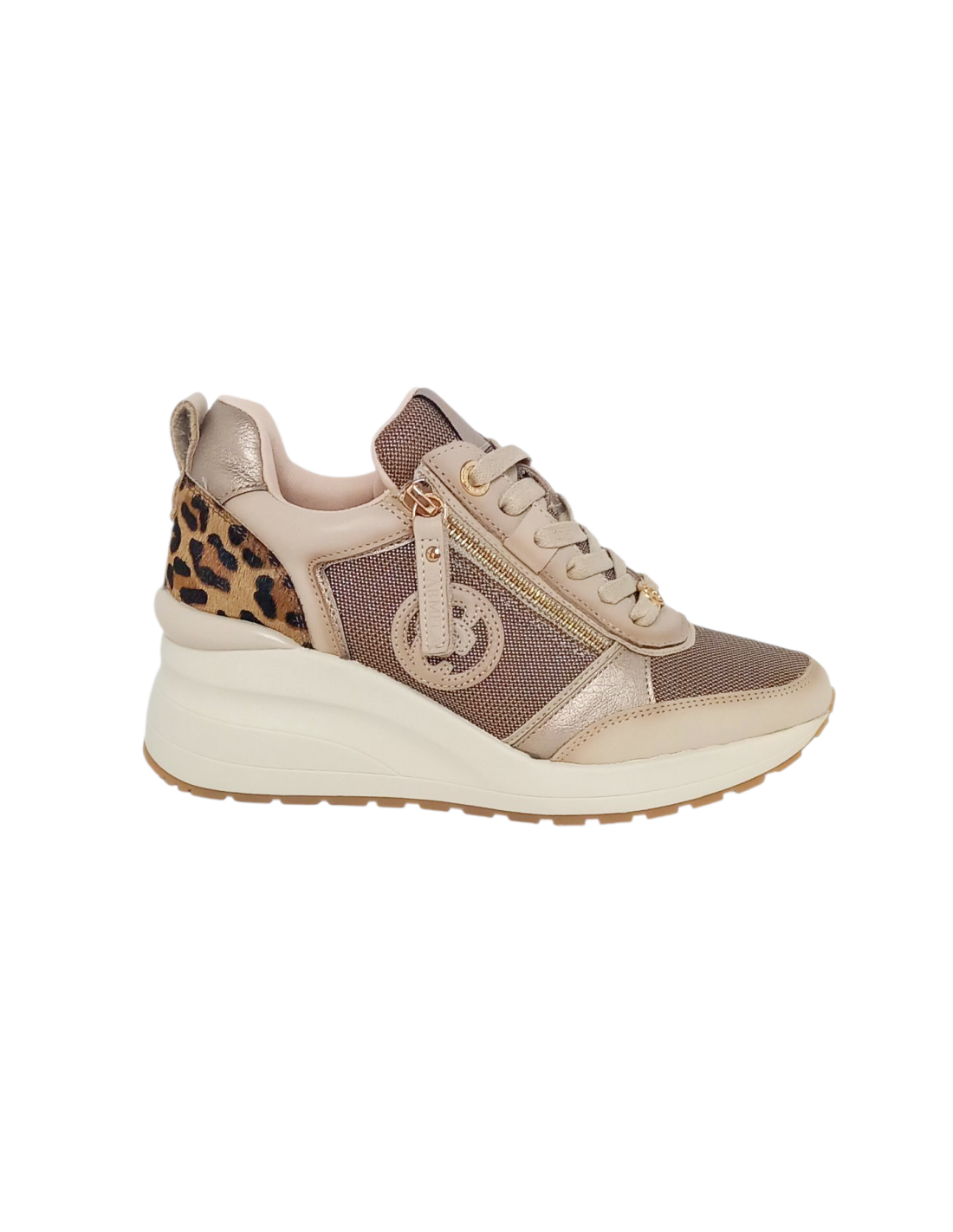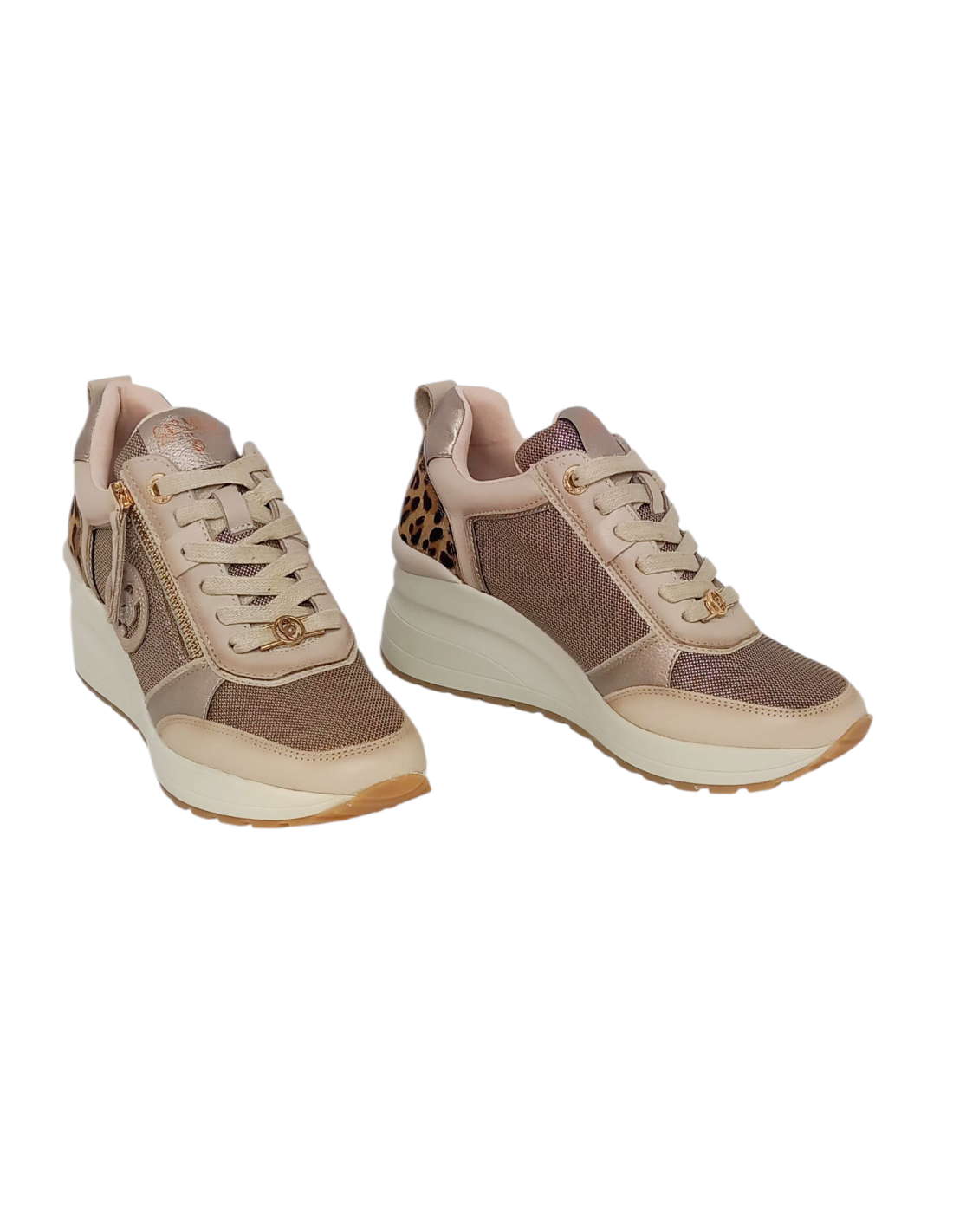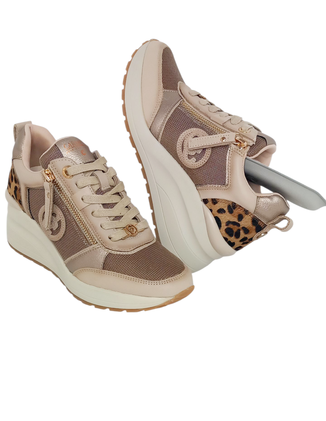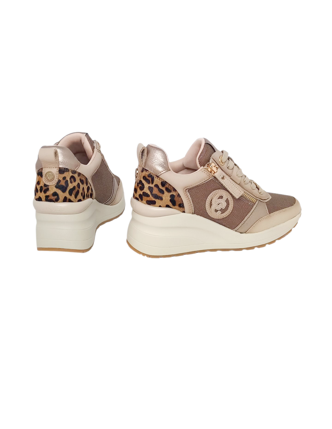 Zapatilla deportiva fabricada en una combinación de texturas como la piel y el nylon metalizado con brillo en tonos beige, bronce y detalle de animal print de leopardo en el talón.