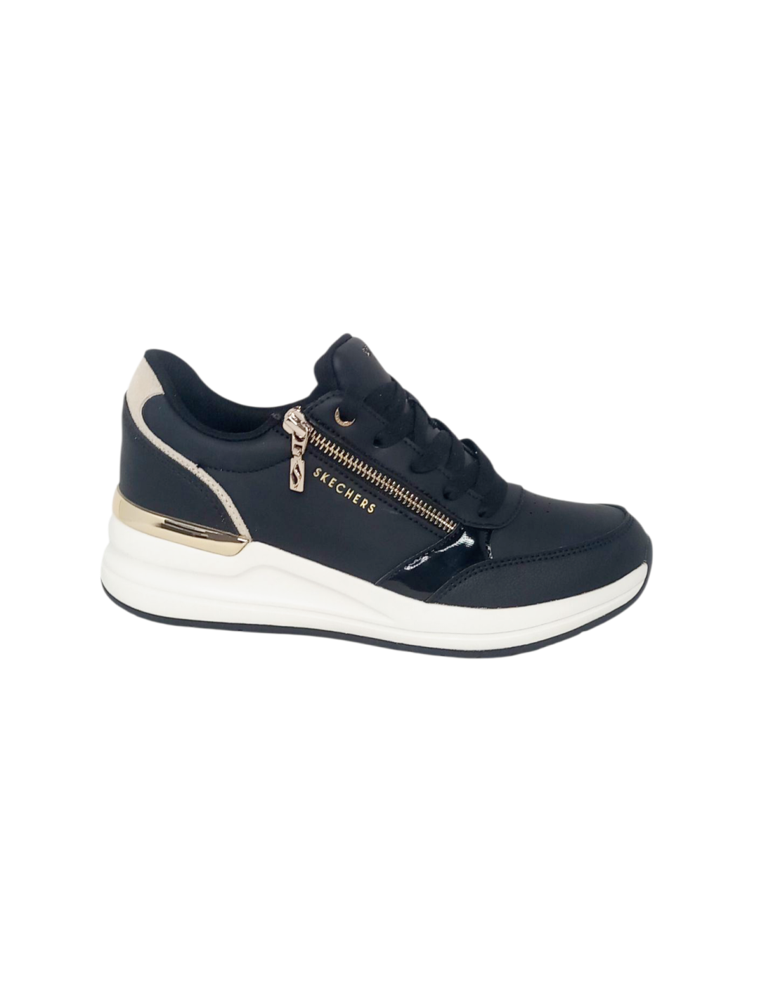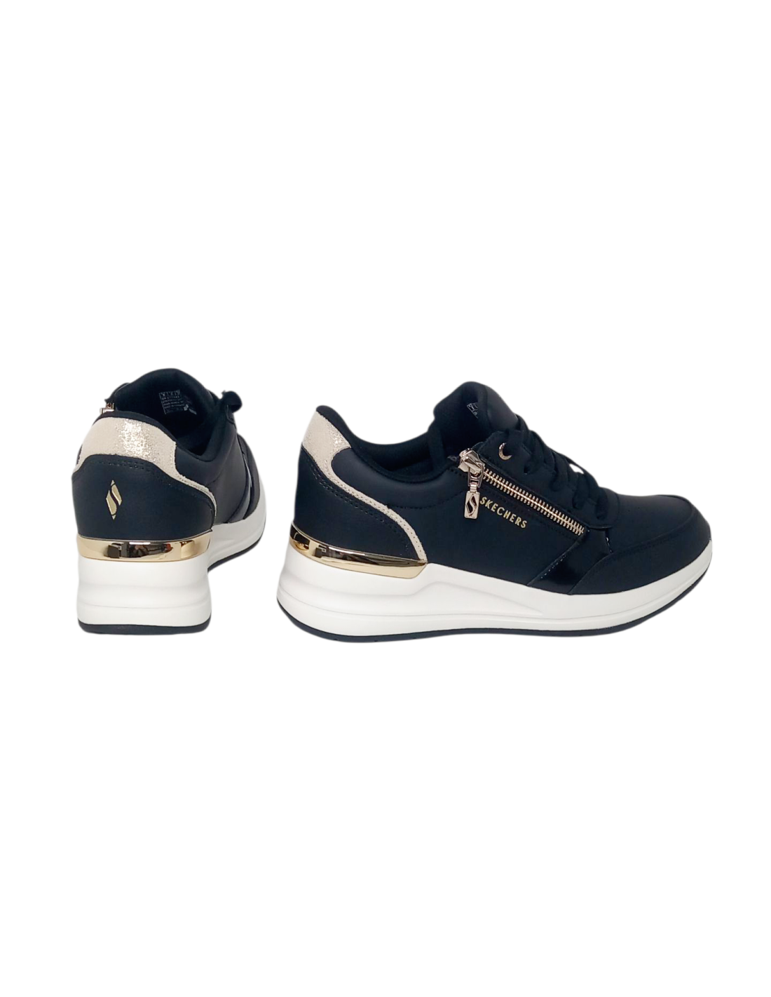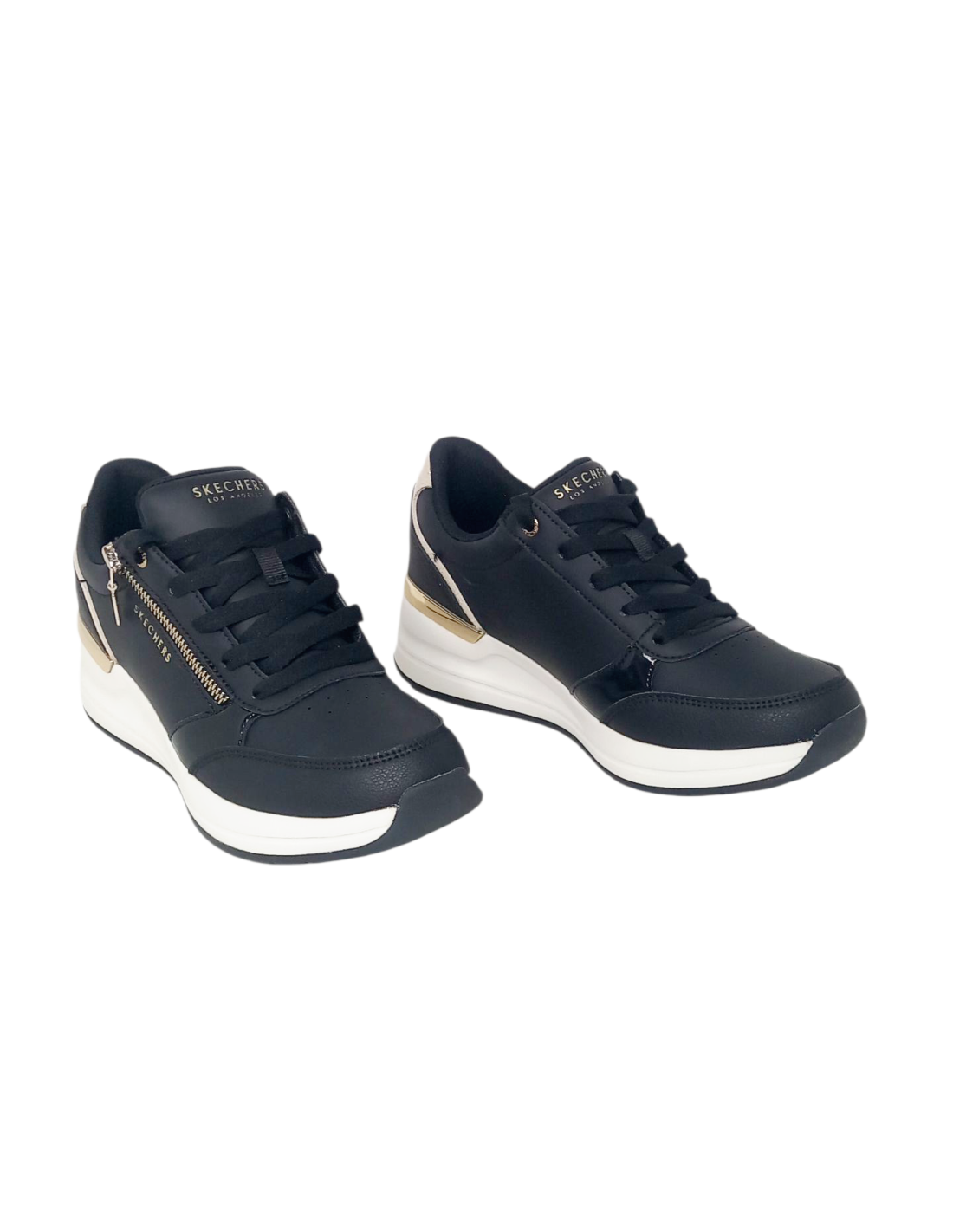 Deportivo con parte superior fabricada en piel vegana de color negro con detalles dorados.