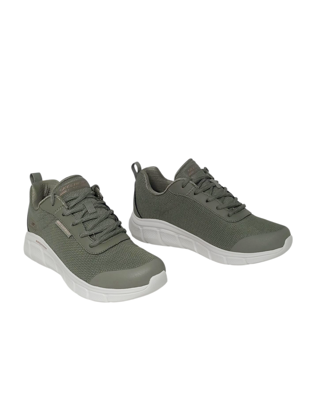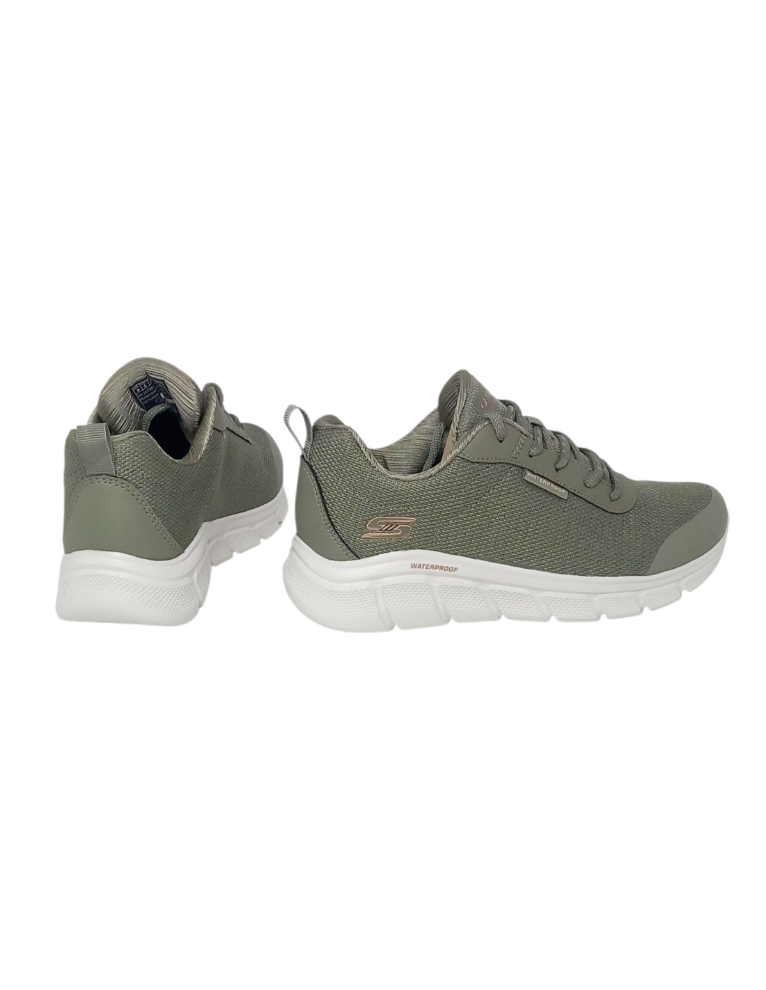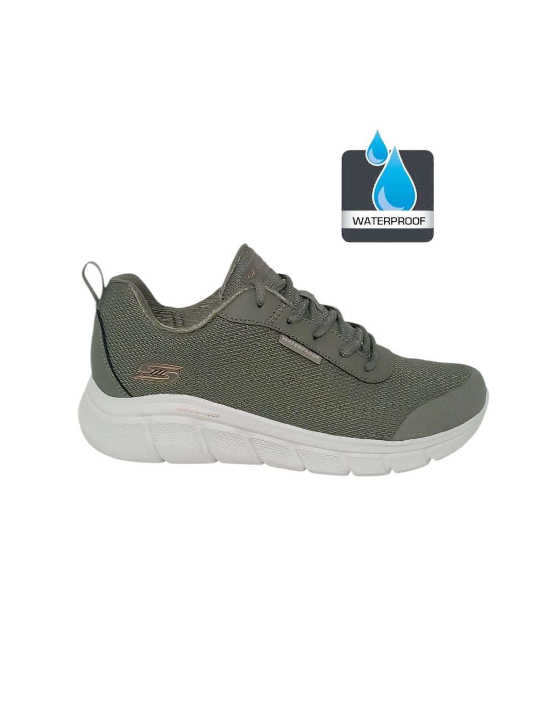 Deportivo Skechers BOBS Sport™ B Flex con sistema WATERPROOF en color verde kakhi, fabricado con materiales 100% veganos, conla parte superior de malla impermeable y costuras selladas.
