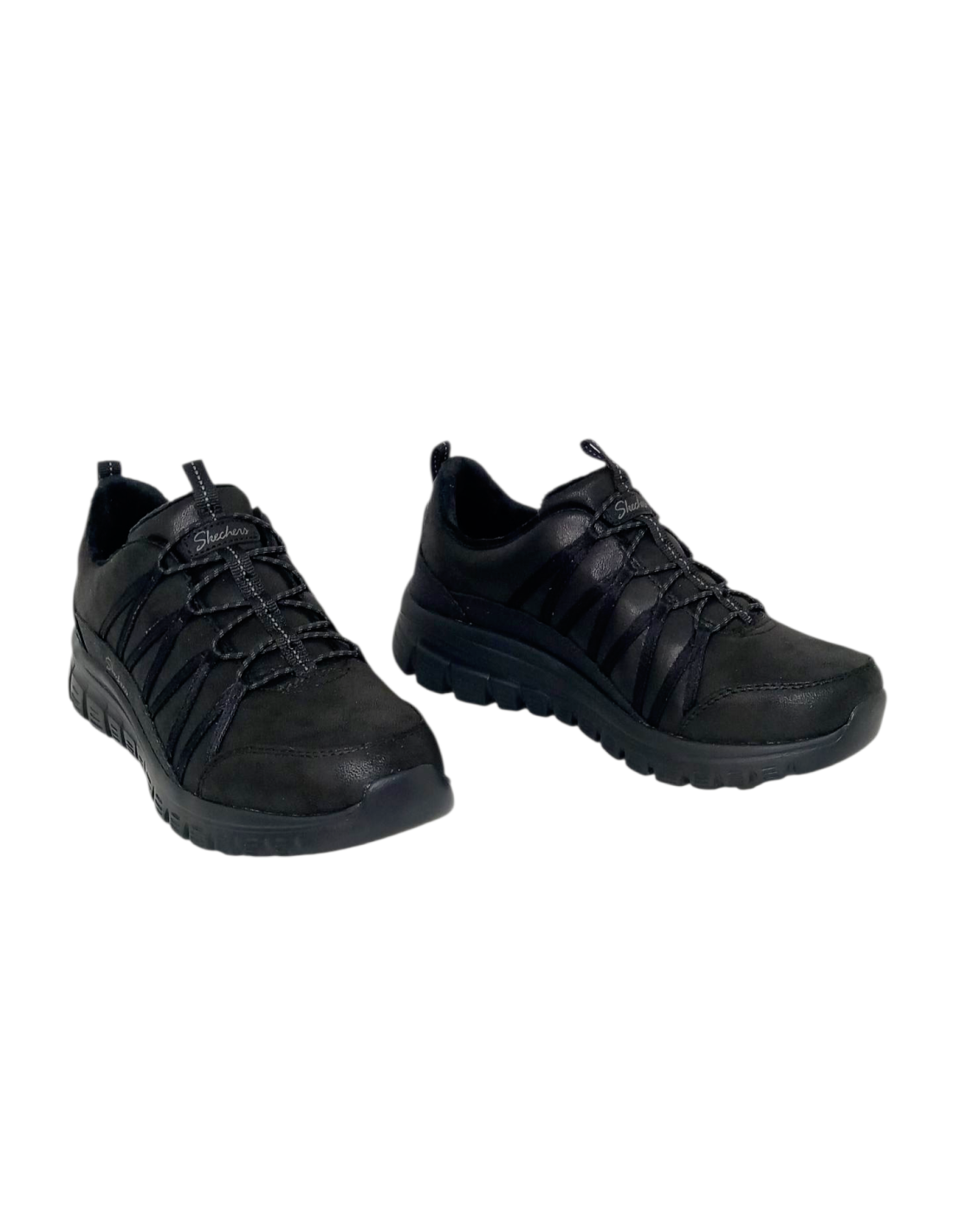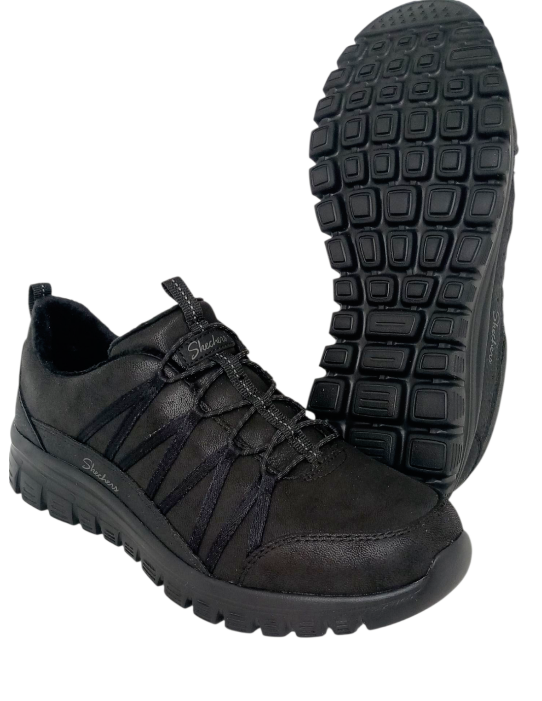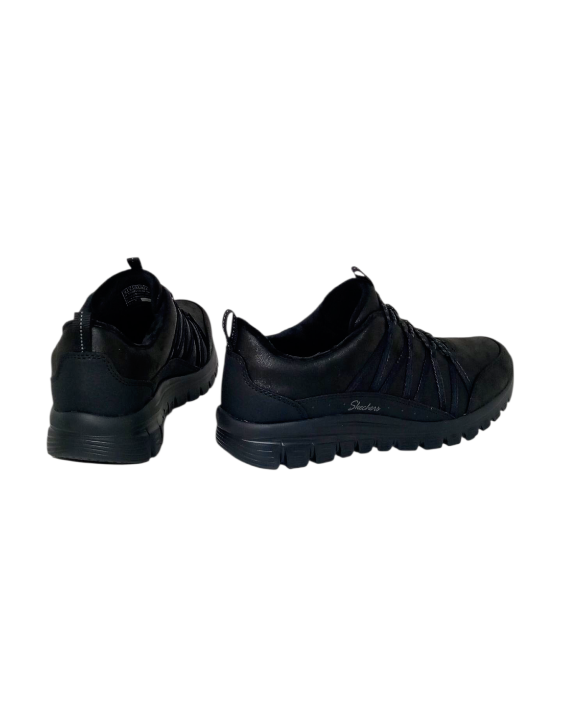 Zapatilla deportiva de Skechers fabricada con materiales veganos. La parte superior es de malla knit suave de color negro y cuenta con un forro textil tipo felpa que aporta una sensación de calidez y confort a los pies más frioleros.