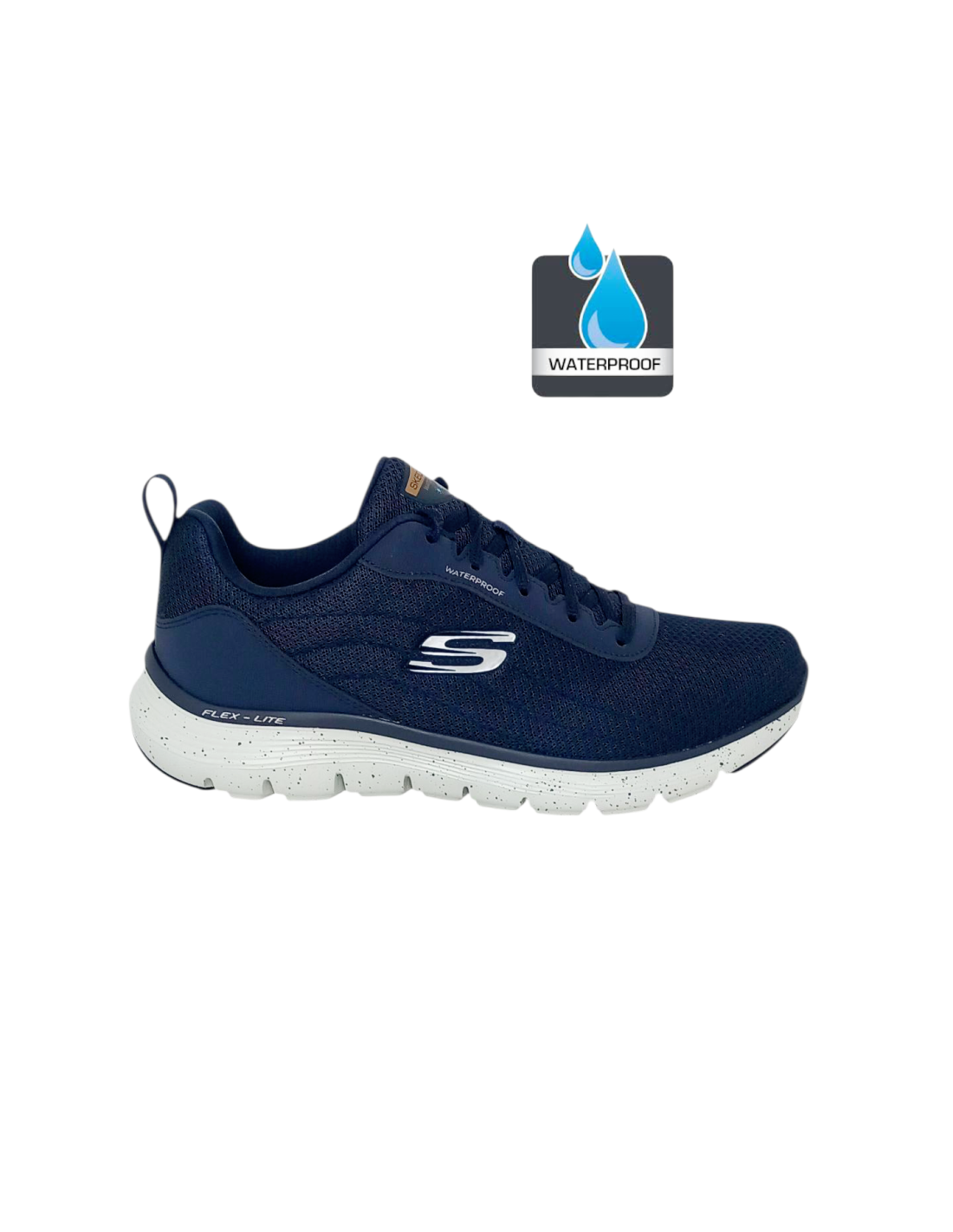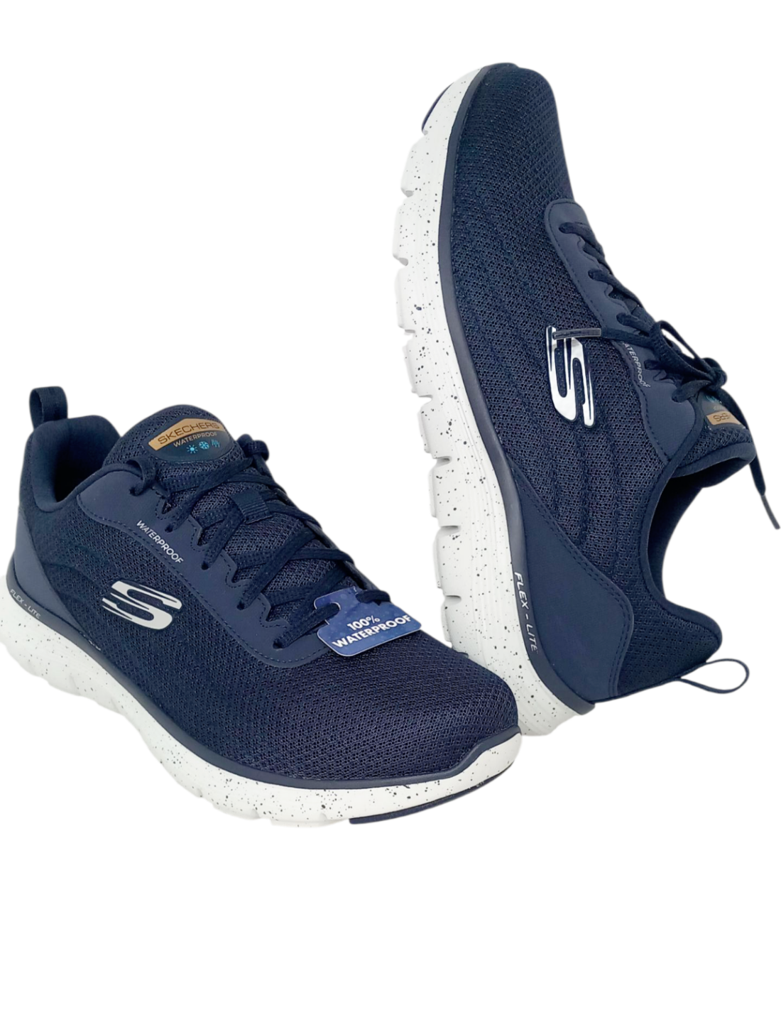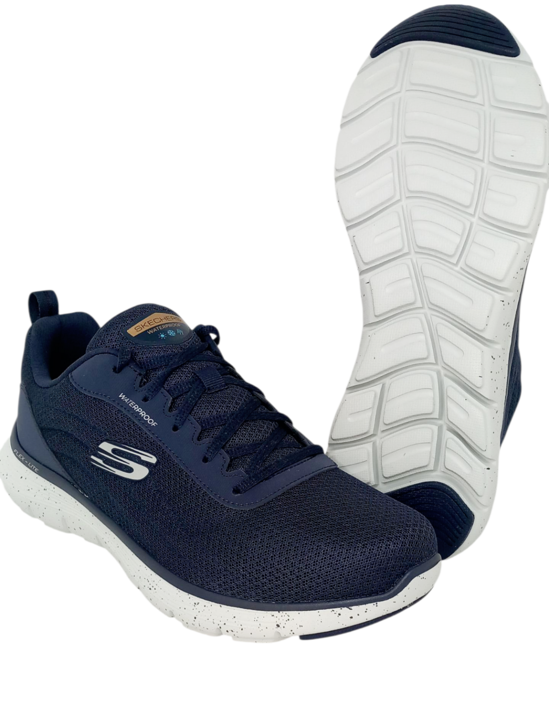 Deportivo Skechers con sistema WATERPROOF en color azul marino, fabricado con materiales 100% veganos, con la parte superior de malla impermeable y transpirable con las costuras selladas. Lleva refuerzos tanto en la puntera como en el talón para aumentar su durabilidad.