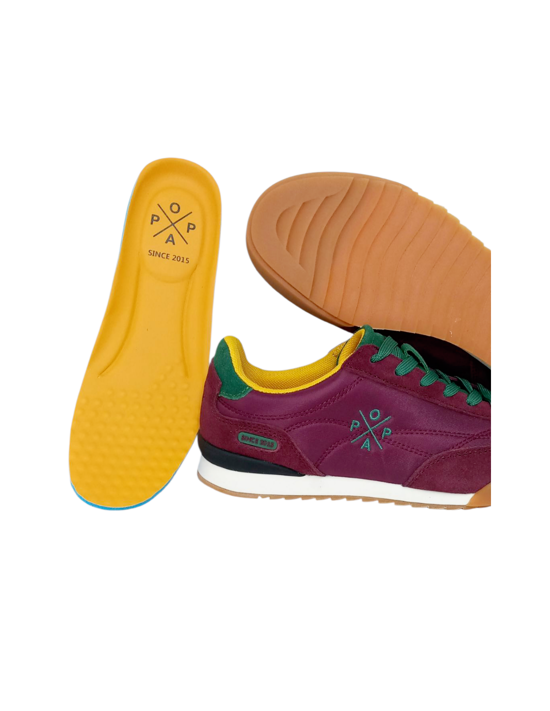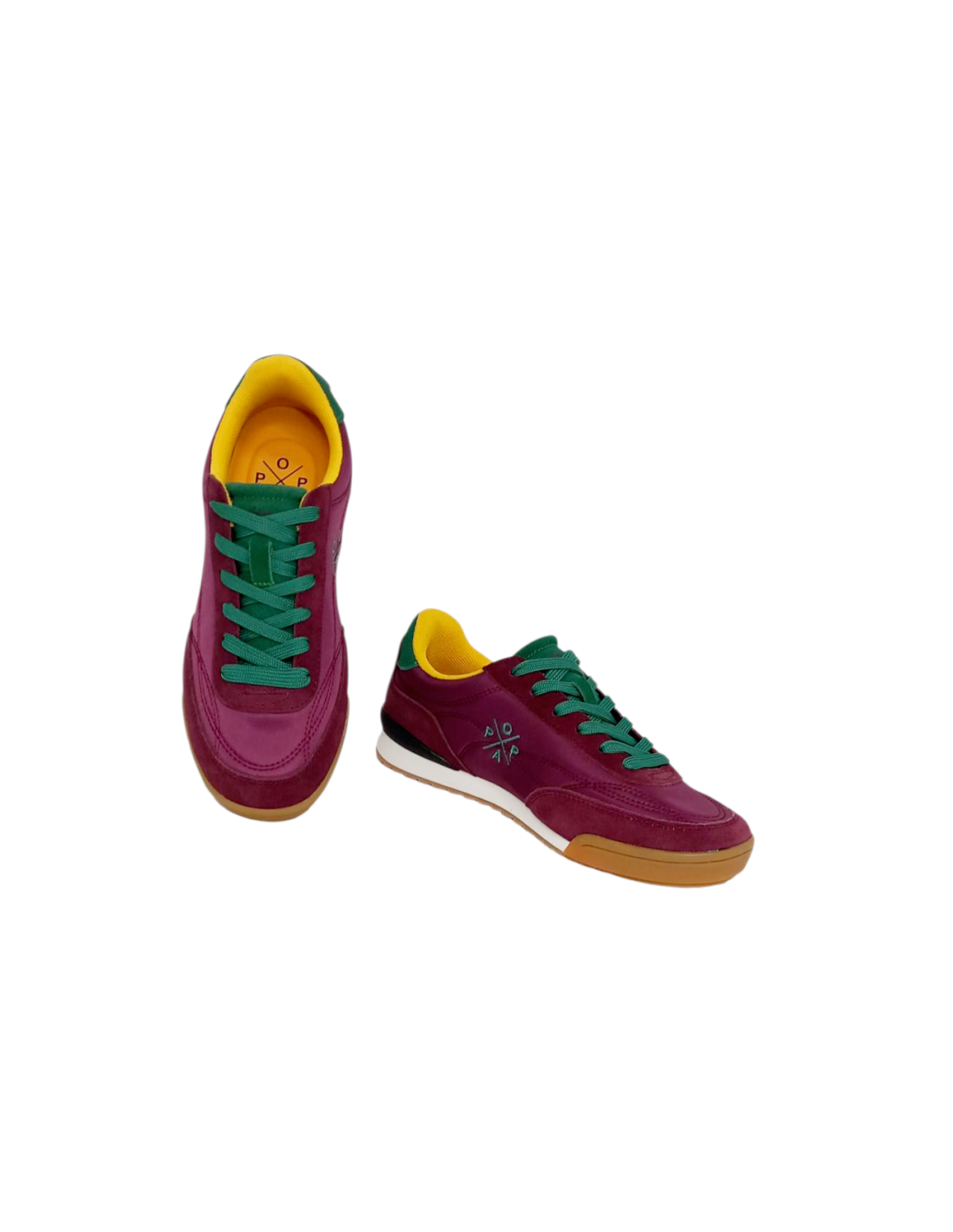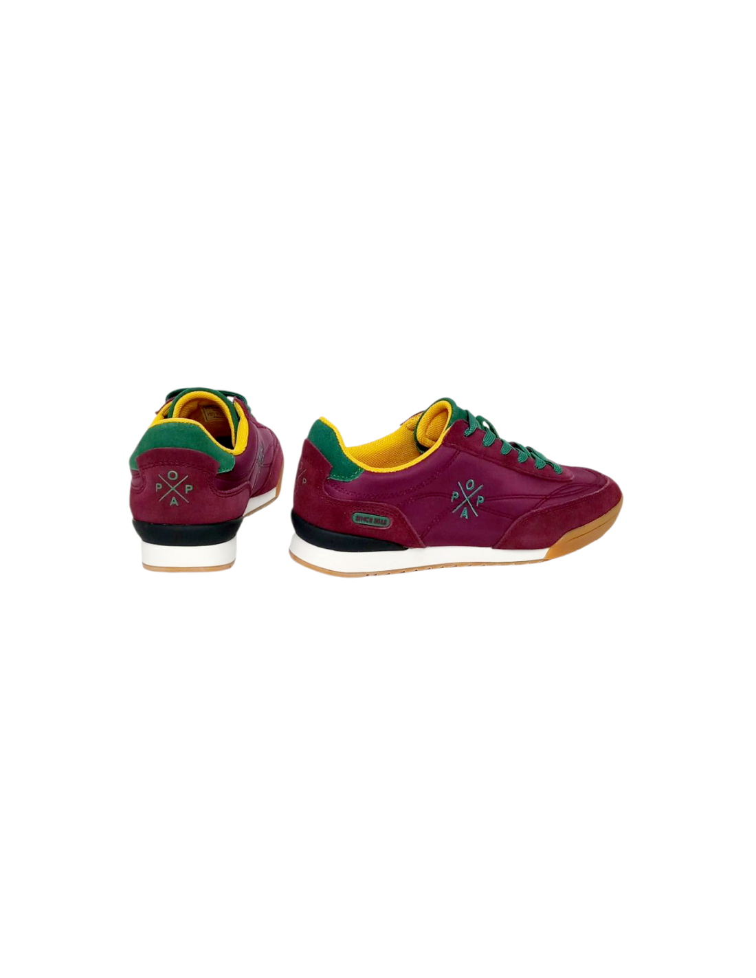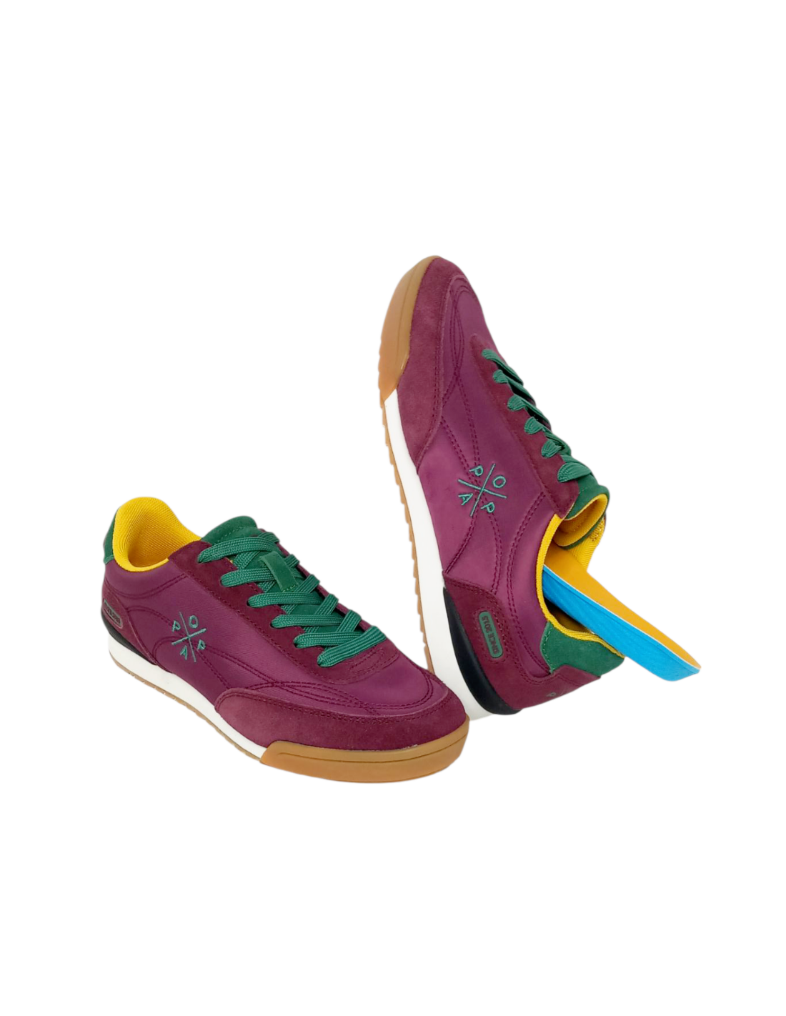 Zapatilla estilo casual fabricada combinando piel serraje con nylon en color burdeos con detalles en verde.