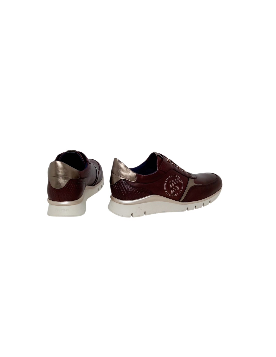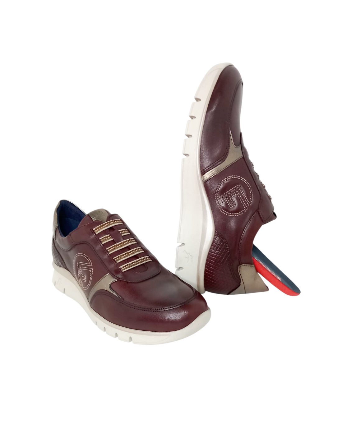 Zapato deportivo de mujer en combinación de color burdeos con detalles en dorado.