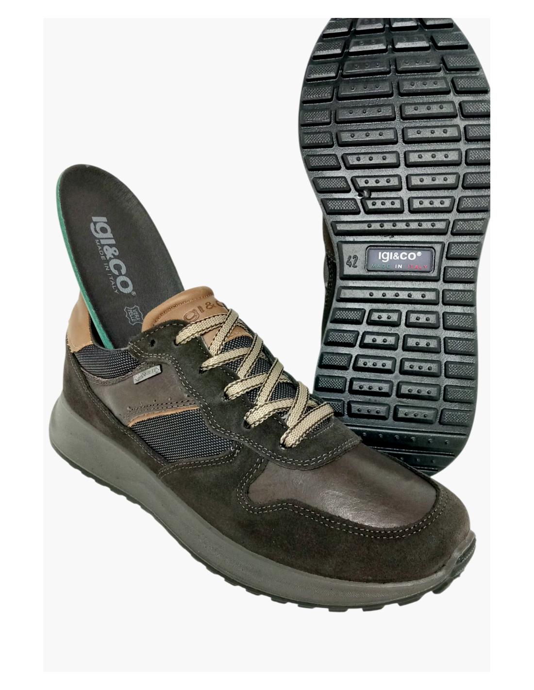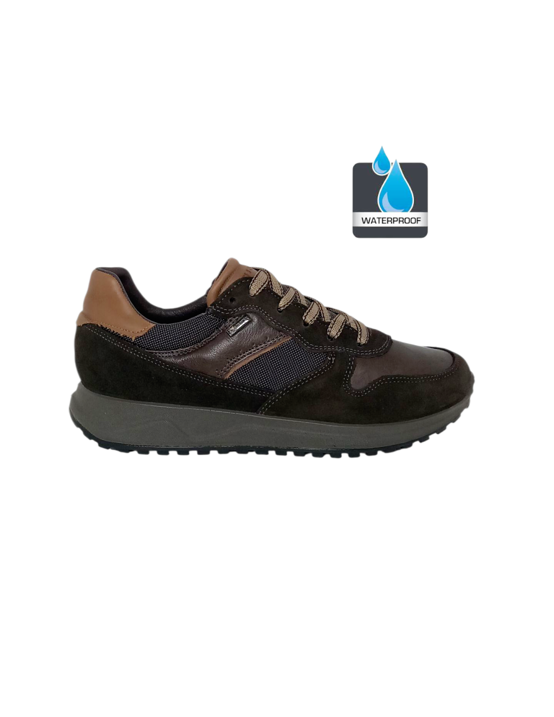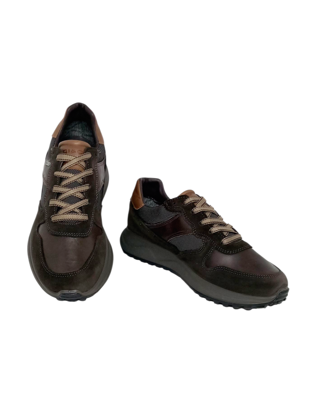 Zapato deportivo fabricado en piel de color marrón en diferentes texturas.