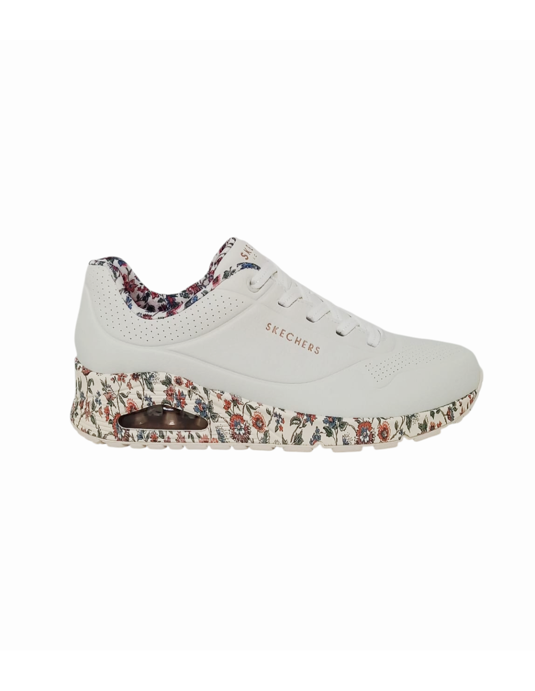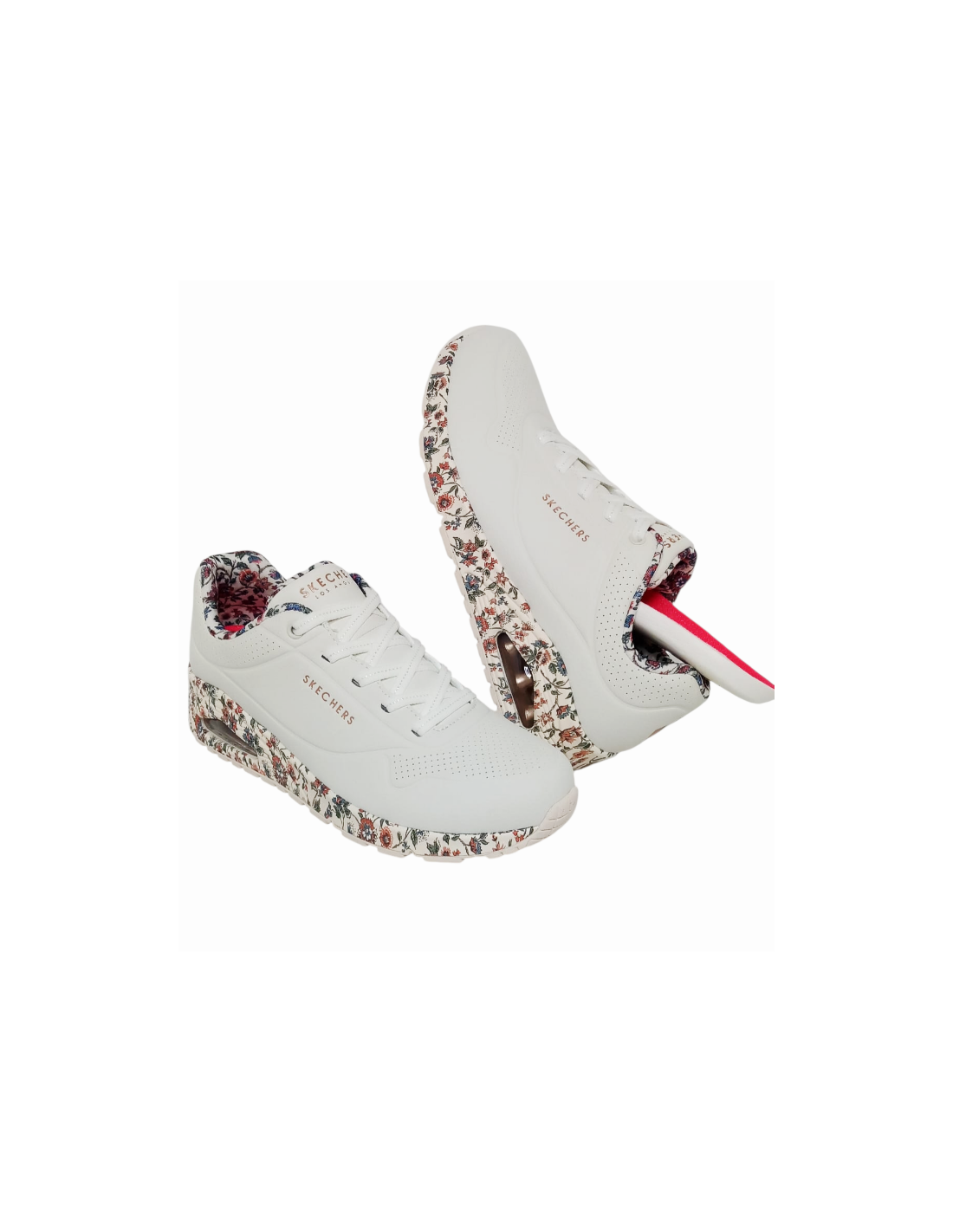 Zapatilla deportiva Skechers Street™ Uno - Safari Time. Esta modelo es muy original gracias al estampado floral de la suela en una bonita combinación de tonos coral y verde, que combina a la perfección con el color blanco roto de la zapatilla.