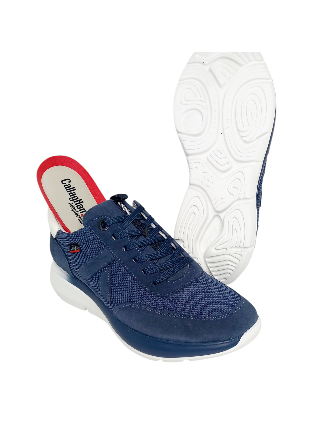 Zapato de la línea deportiva ALGORITMO de colores azul denim y beige.