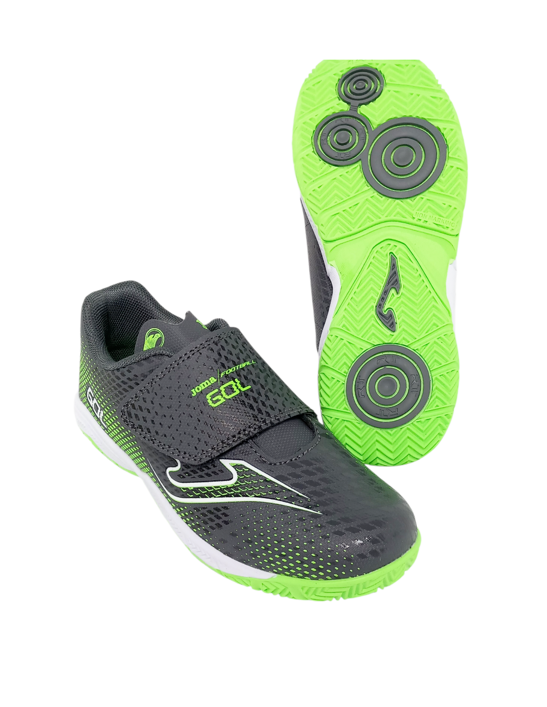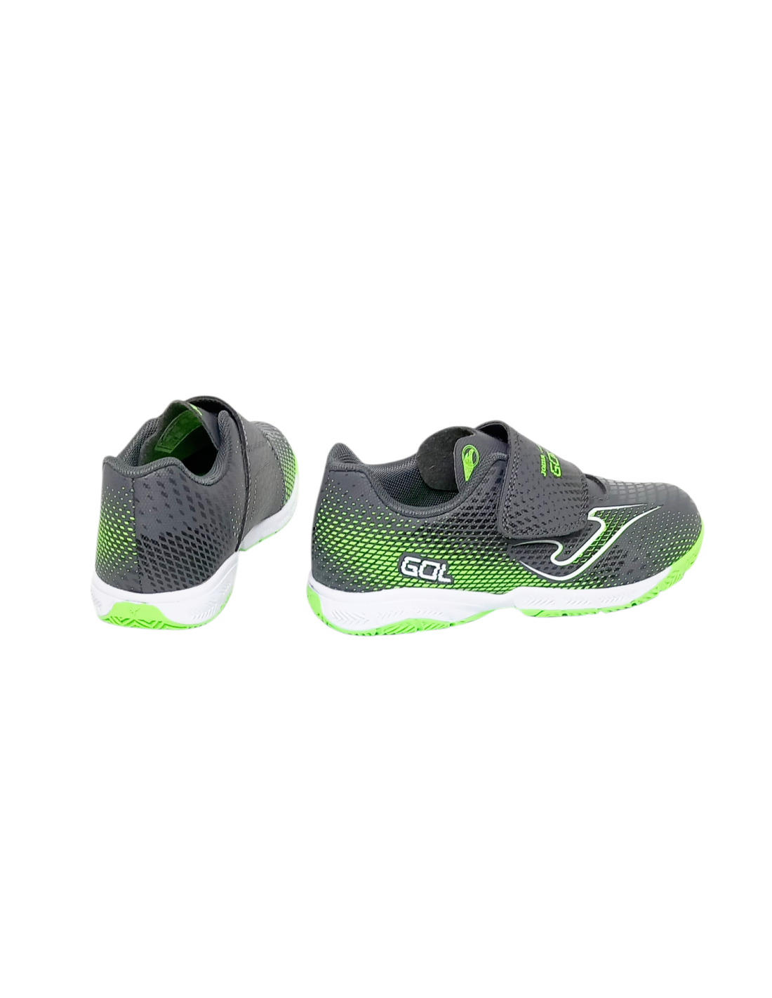 Deportivo de niñ@ de la marca Joma en color gris ceniza/verde lima, especialmente diseñado para aquellos que practican fútbol sala en entornos deportivos.
