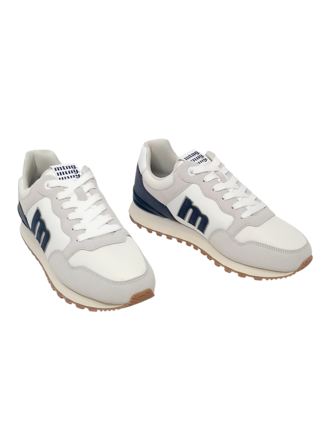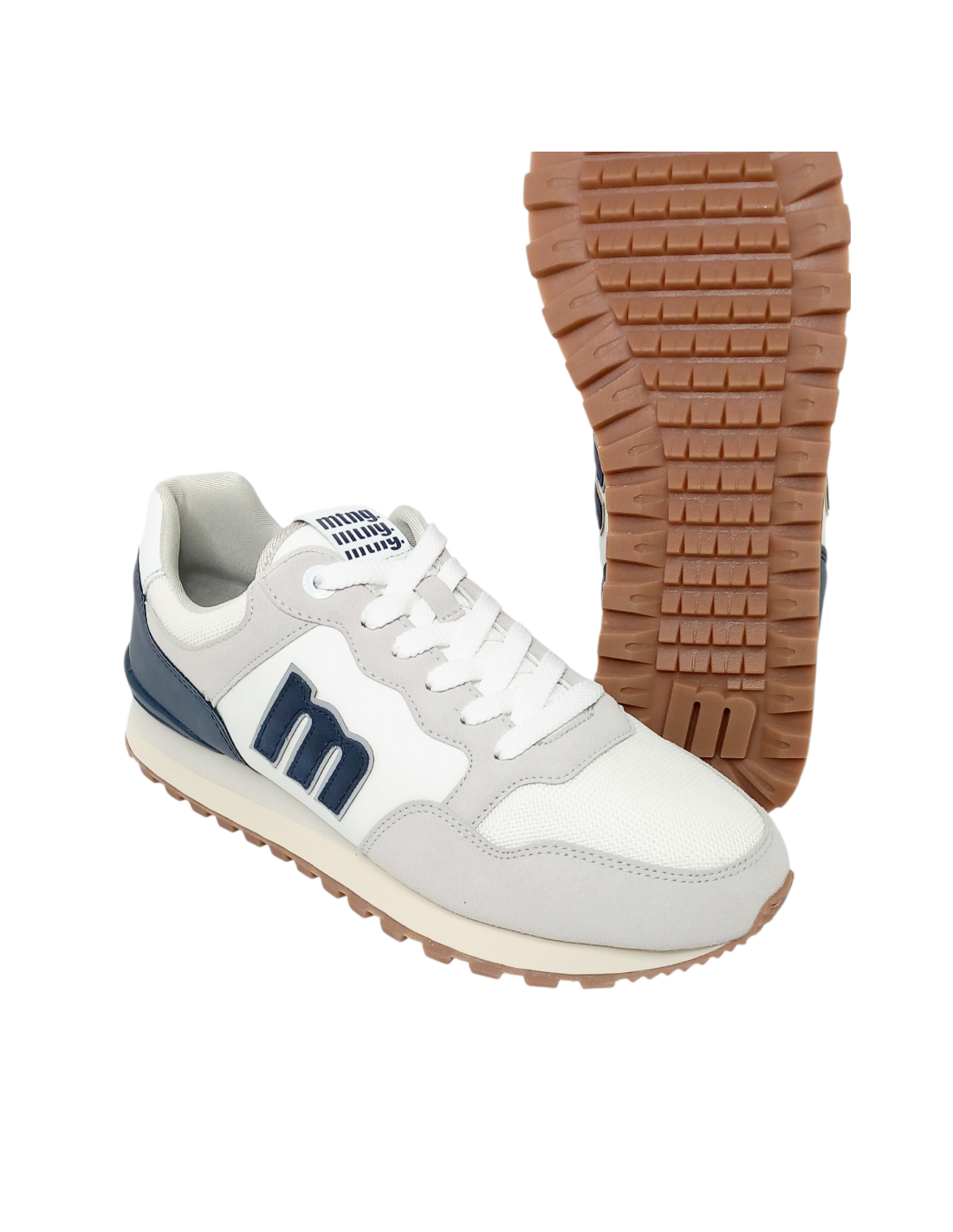 Zapatilla deportiva de estilo retro en color blanco, gris y detalles en azul marino. Confeccionado en materiales sintéticos con paneles de diferentes texturas.