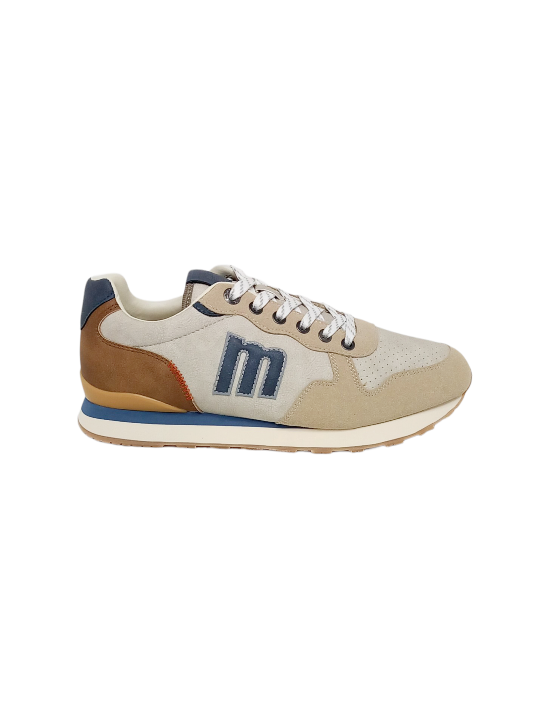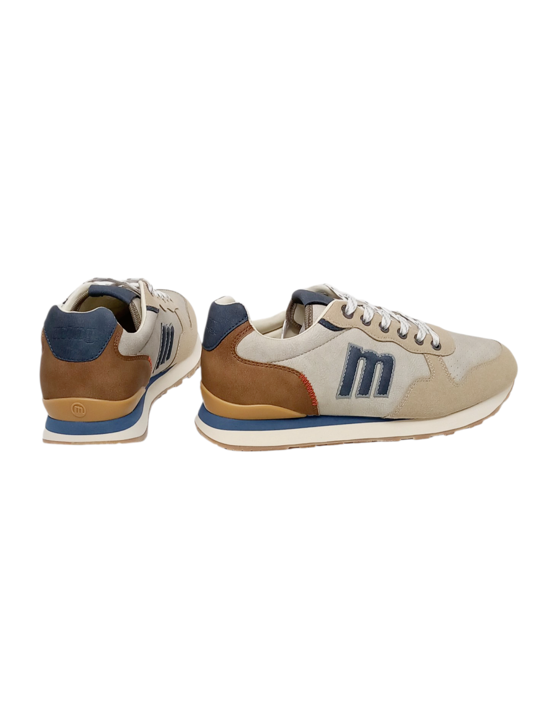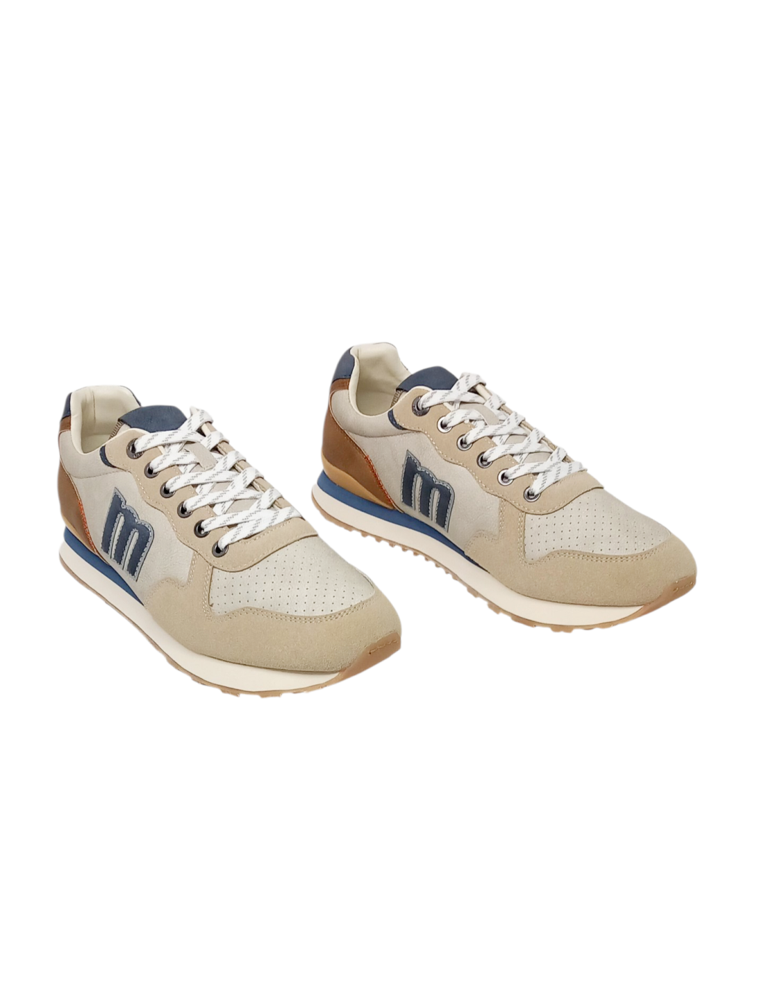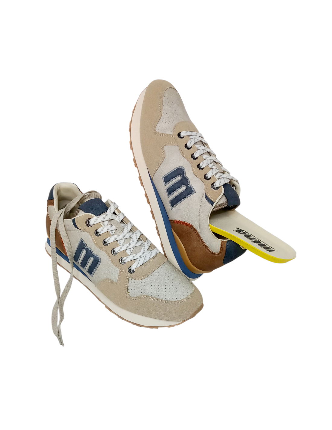 Zapatilla deportiva de color beige y detalles en azul marino y marrón. Confeccionado en materiales sintéticos símil napa y serraje.