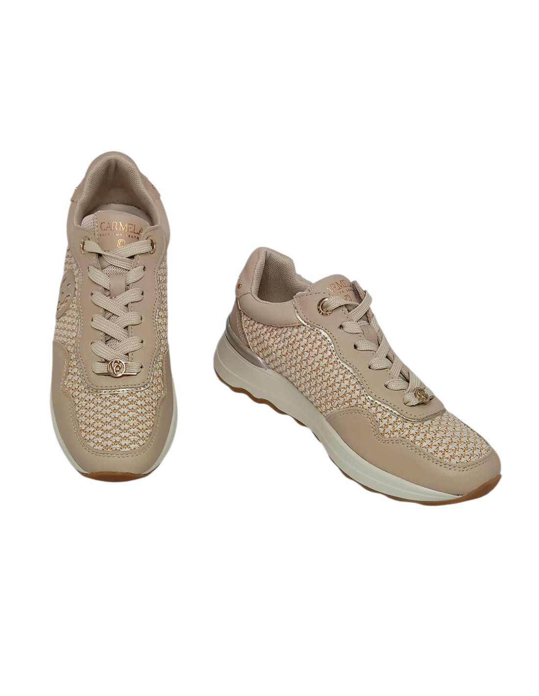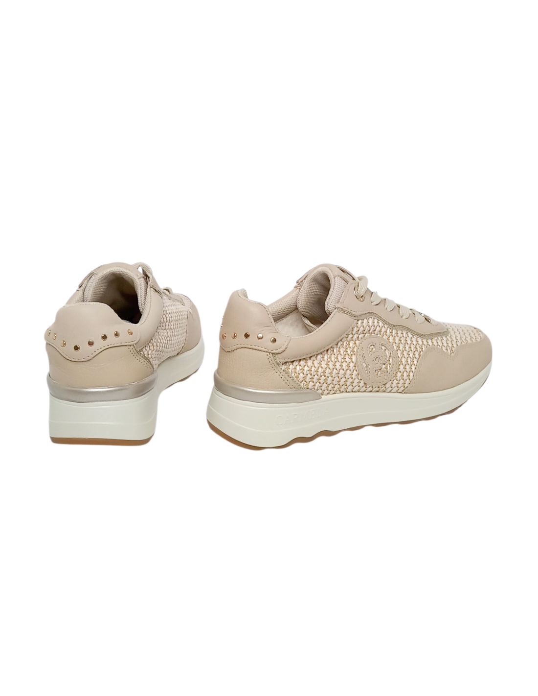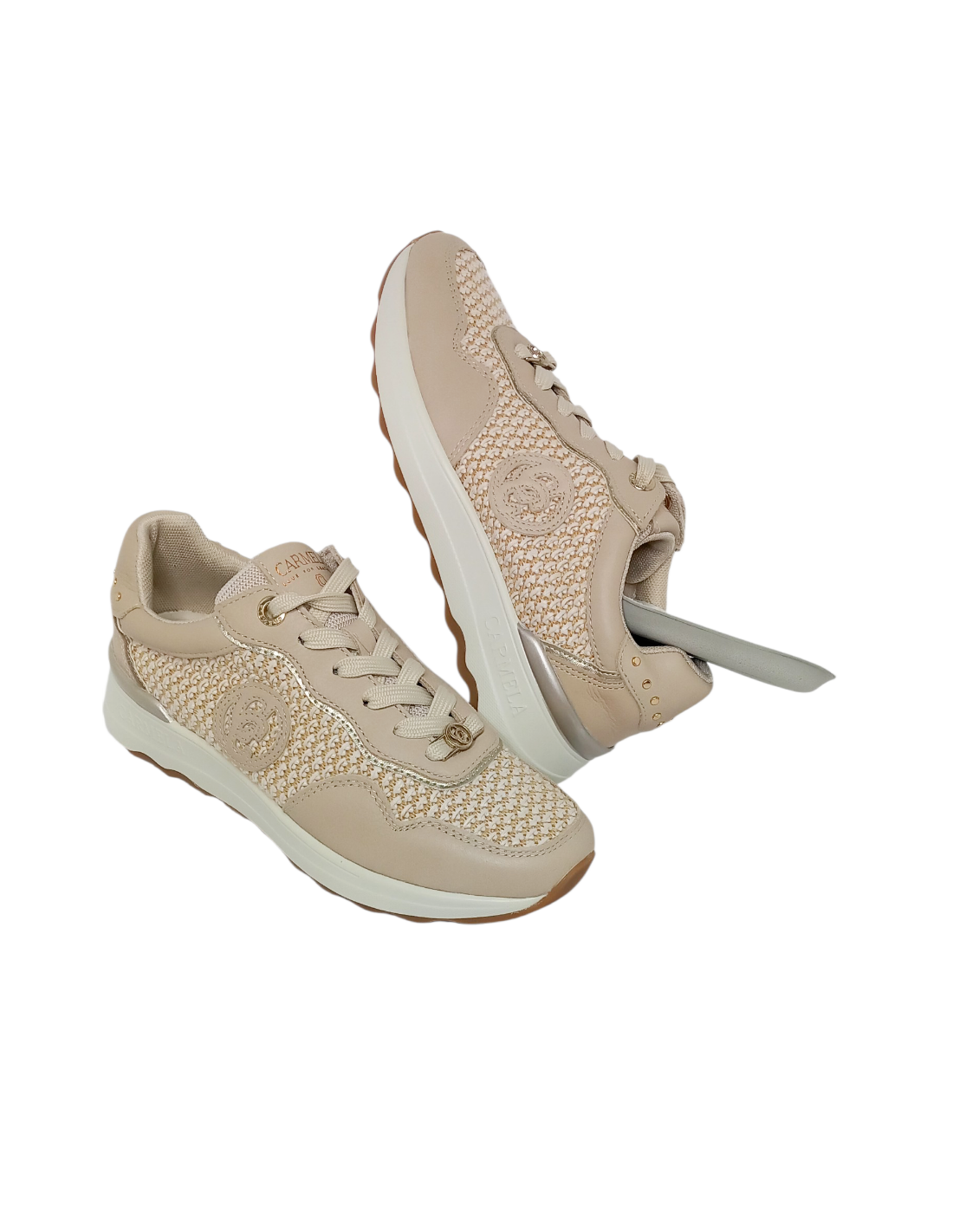 Zapatilla deportiva fabricada en piel en combinación de color beige, blanco y oro, para aquellas que le gustan los tonos más neutros. Incorpora diferentes texturas como tejido tipo rafia y combinaciones en piel.