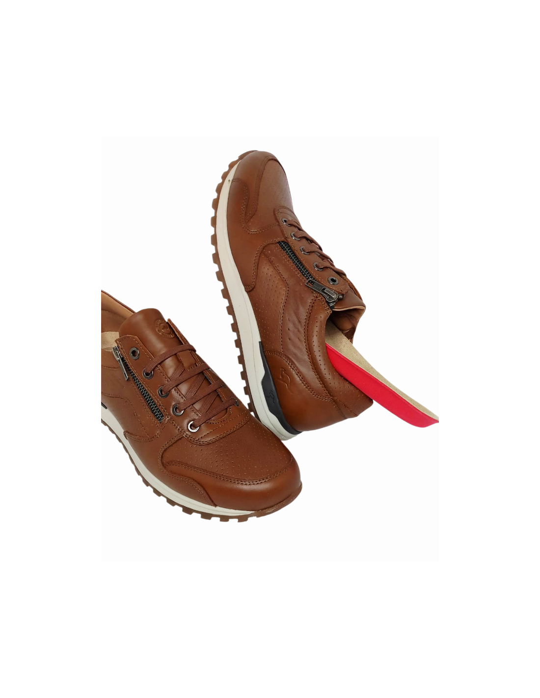Zapato estilo deportivo fabricado en piel de primera calidad de color cuero, con micro-perforaciones para una mejor transpiración del pie en verano, e interior con combinación de piel y textil.
