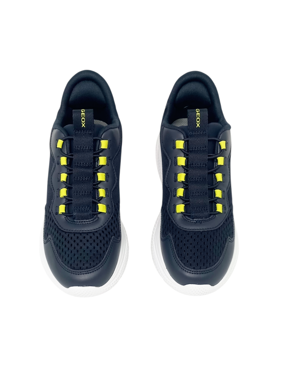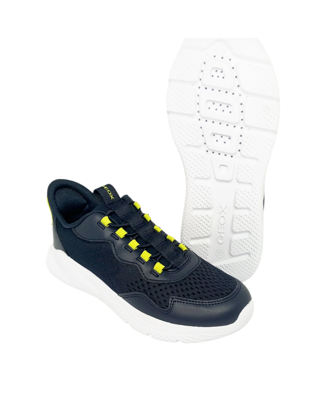 Sneakers para niño de la marca Geox, ligero fabricado en tejido efecto malla y combinado en piel de color azul marino con detalles en verde lima que le dan un aire más divertido y casual.