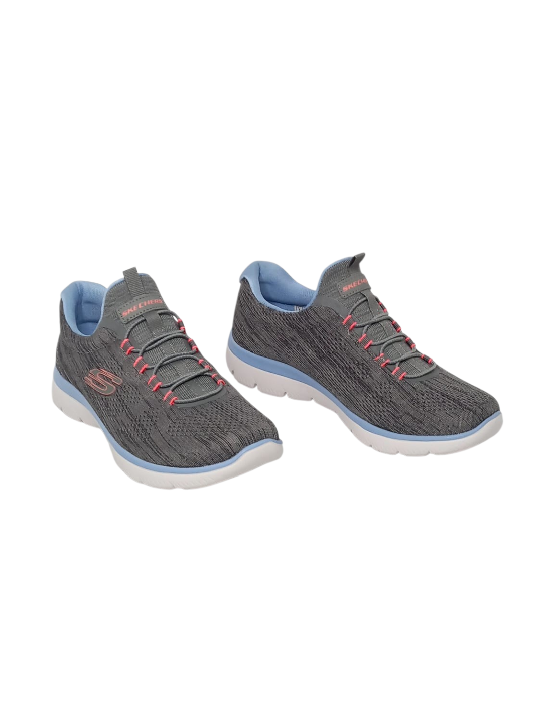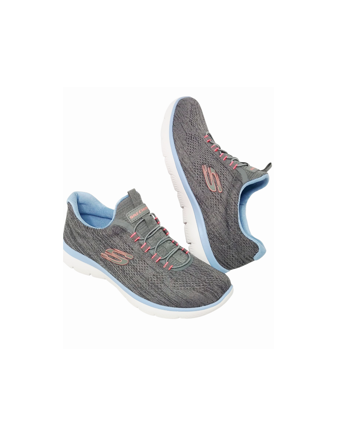 Deportivo para mujer de la marca Skechers Summits Fun Flaire. Material exterior de malla técnica en color gris jaspeado, con sistema de cierre engomado.