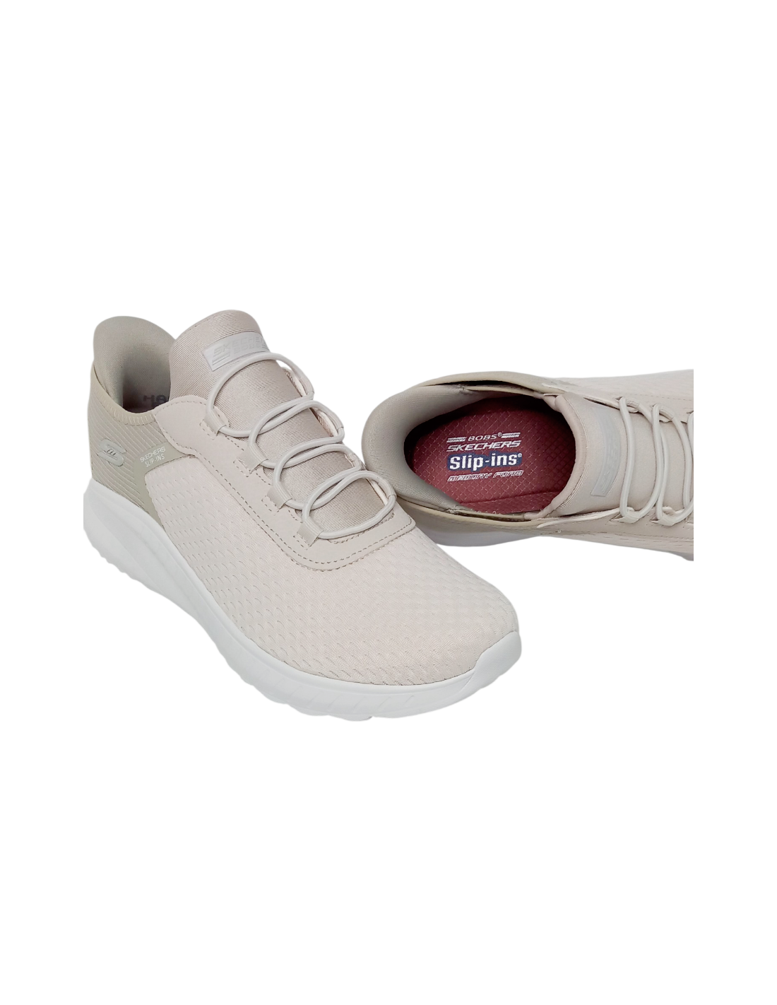 Deportivo para mujer de la marca Skechers Hands Free Slip-ins®: BOBS Sport™ Squad Chaos en color beige. Este modelo permite calzarse las zapatillas fácilmente sin usar las manos gracias a su Tecnología Hands Free Slip-ins®.