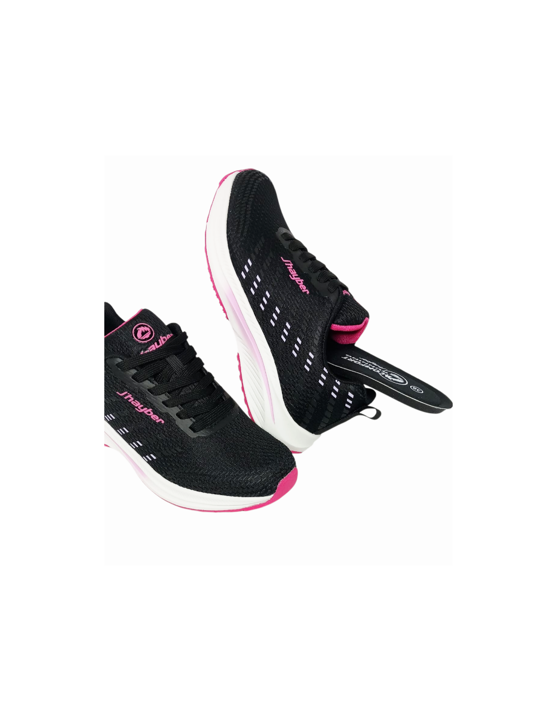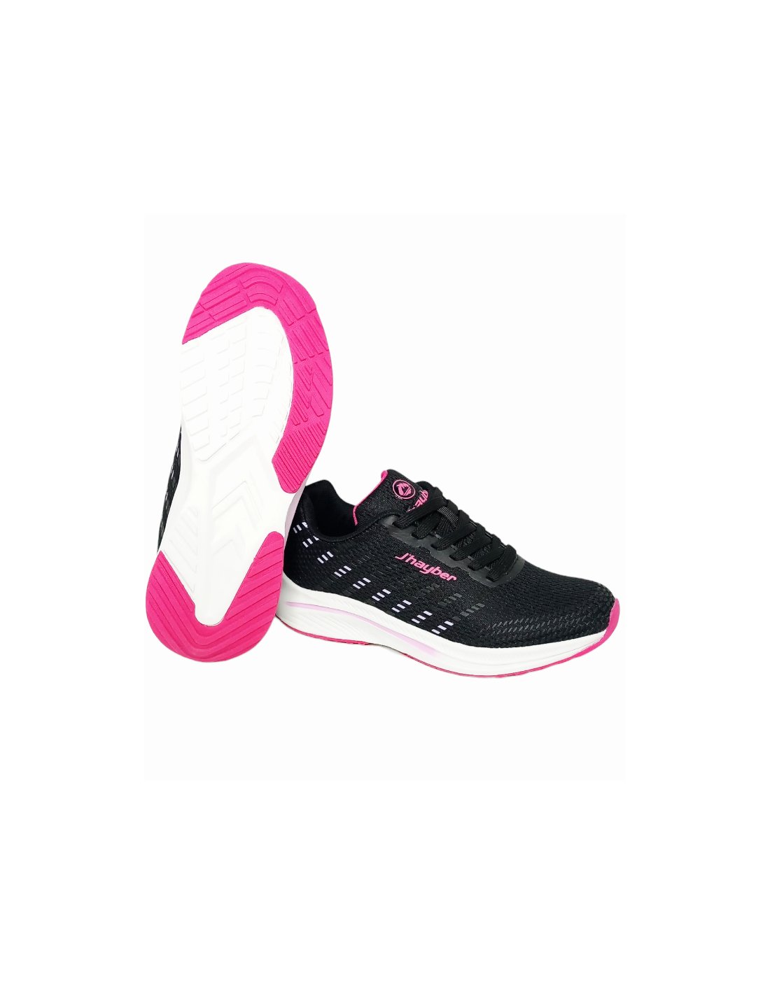Deportivo para mujer de la marca J´hayber en color negro, diseñada para el uso diario y actividades físicas ligeras, destacando por su ligereza y confort. Diseño moderno con detalles en color fuxia y piso en color blanco.