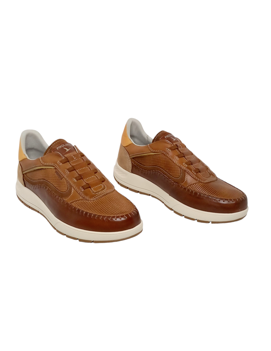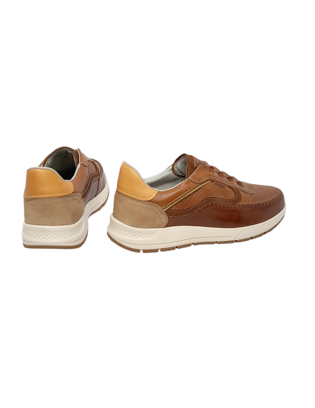 Zapato de estilo deportivo fabricado en piel de vacuno de primera calidad en colores azul y cuero, que busca el máximo confort.