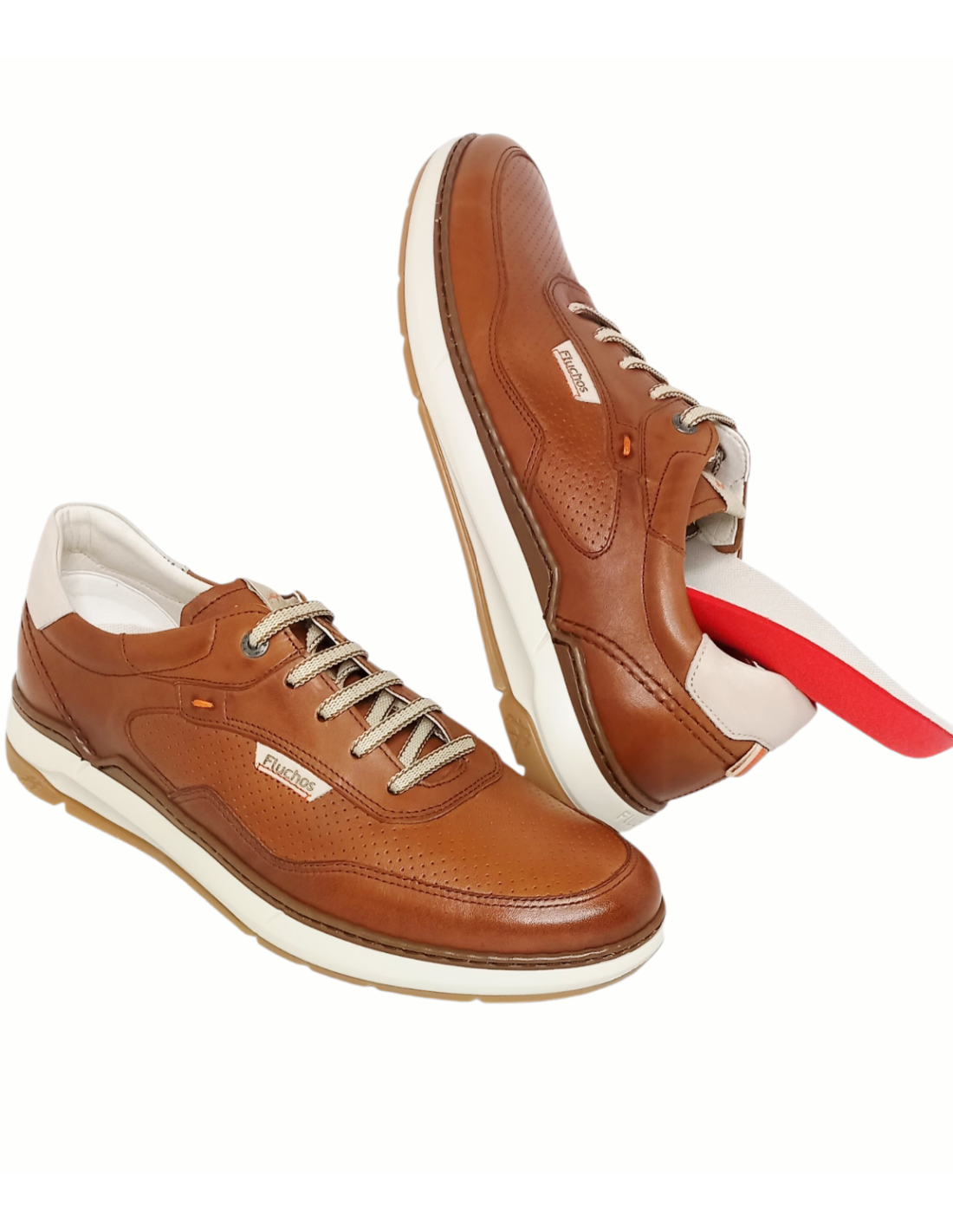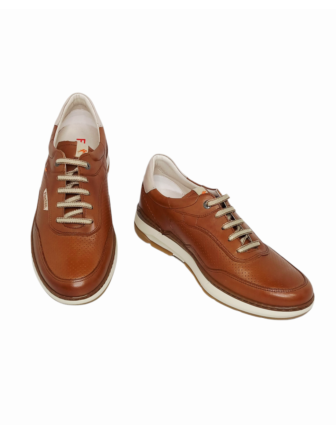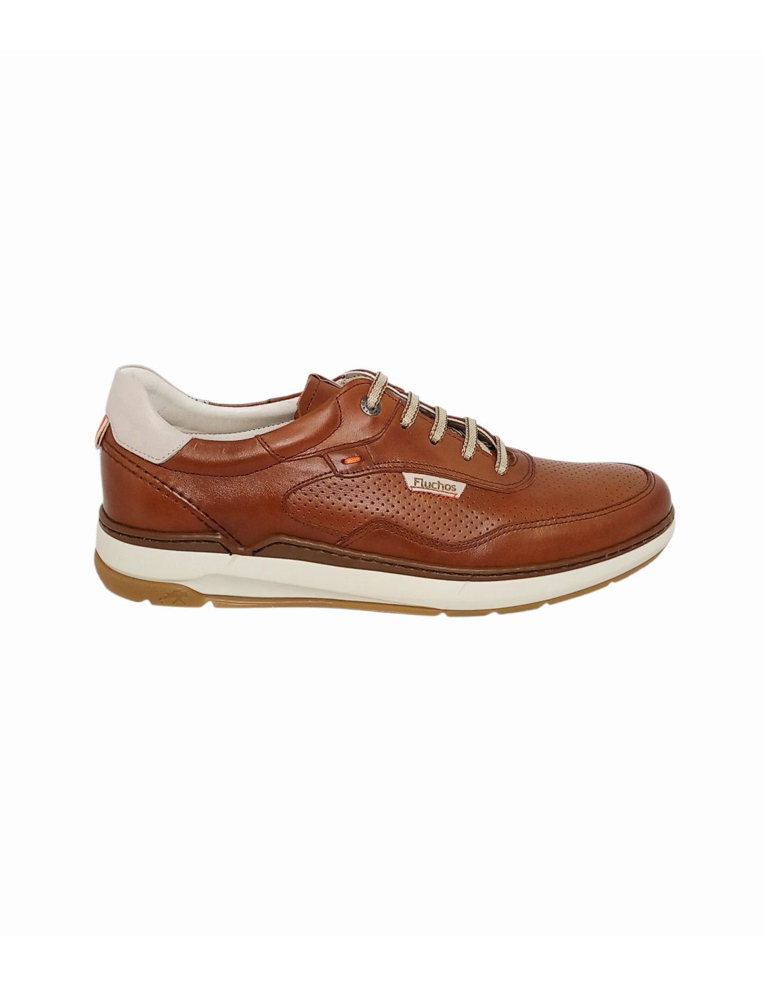 Zapato de estilo deportivo fabricado en piel de color cuero con detalles microperforados tanto en la parte frontal como lateral y talonera en blanco roto.