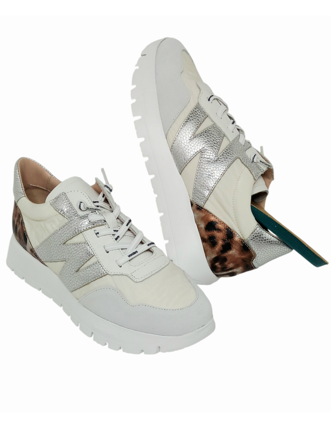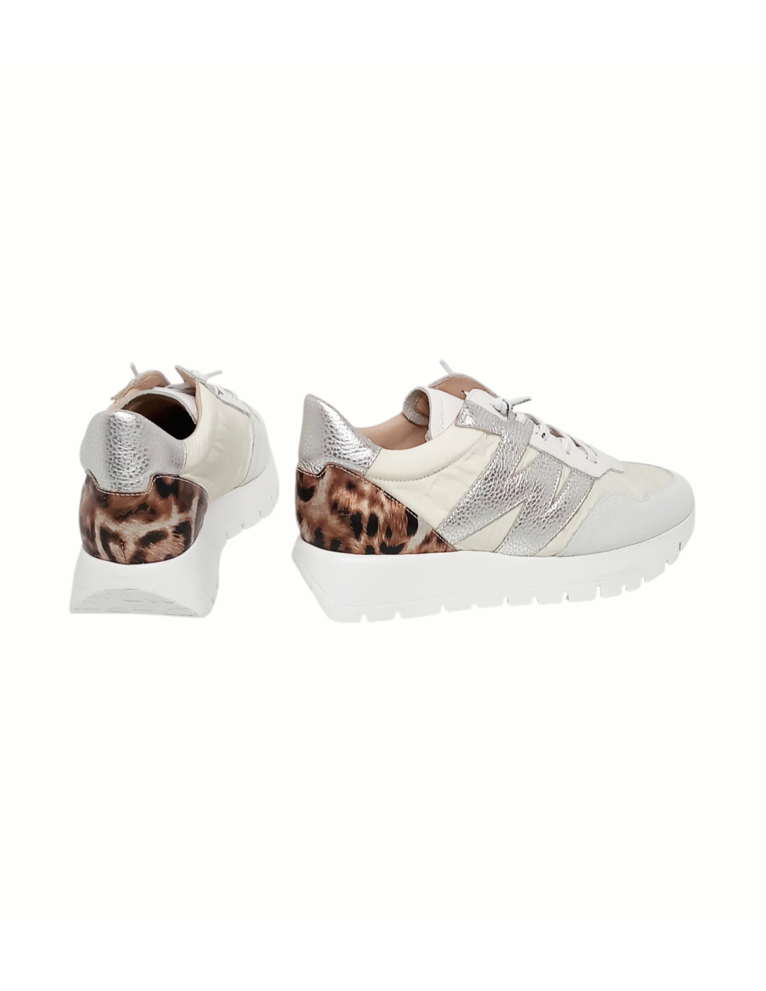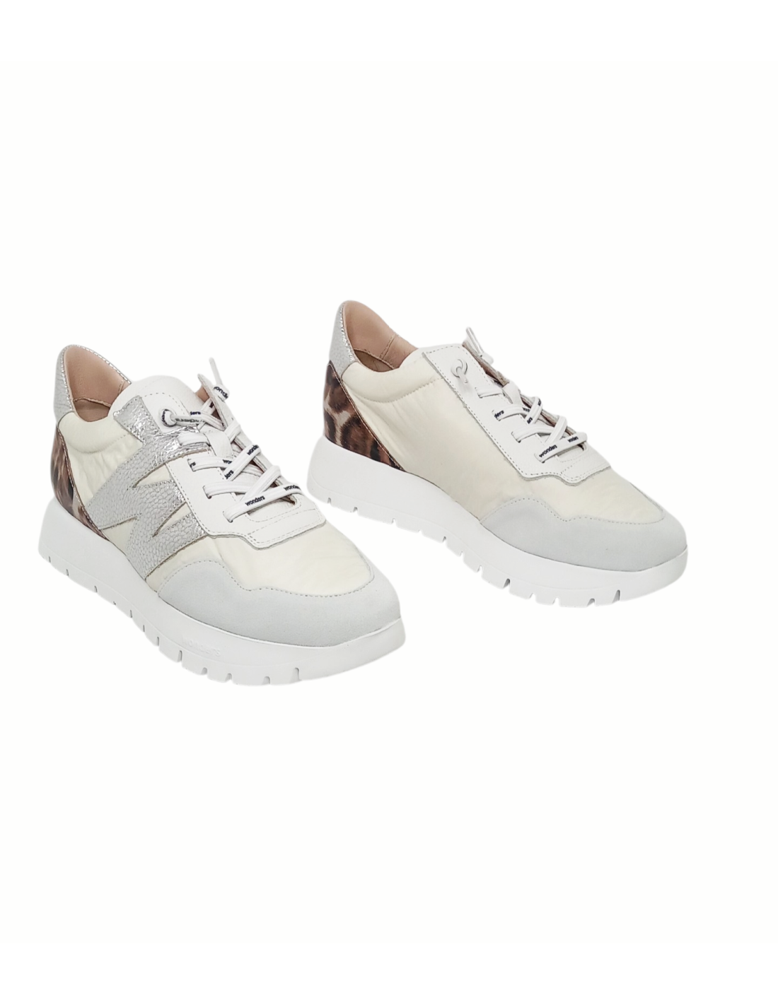 Zapato de estilo deportivo fabricado combinando piel y material textil en distintos tonos de blanco, adornado además en el lateral con la "W" típica de la marca metalizada y detalle de animal print de leopardo en la talonera.