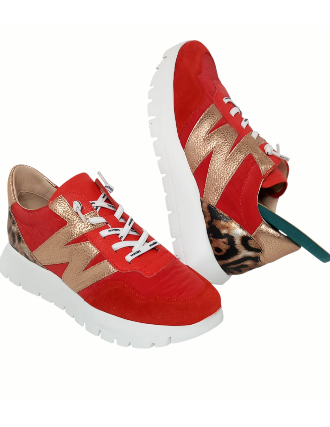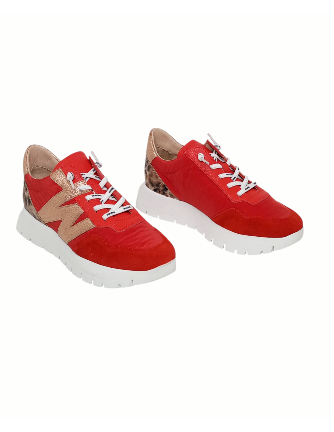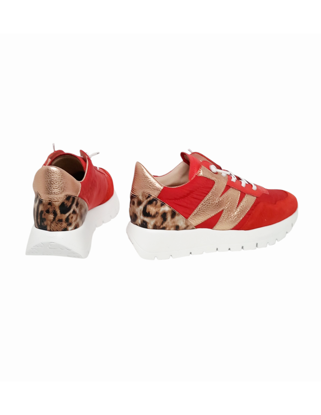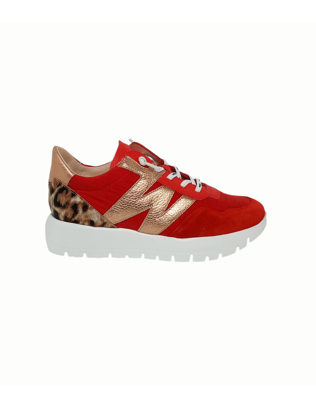 Zapato de estilo deportivo fabricado combinando piel y material textil de color rojo, adornado además en el lateral con la  "W" típica de la marca metalizada y detalle de animal print de leopardo en la talonera.