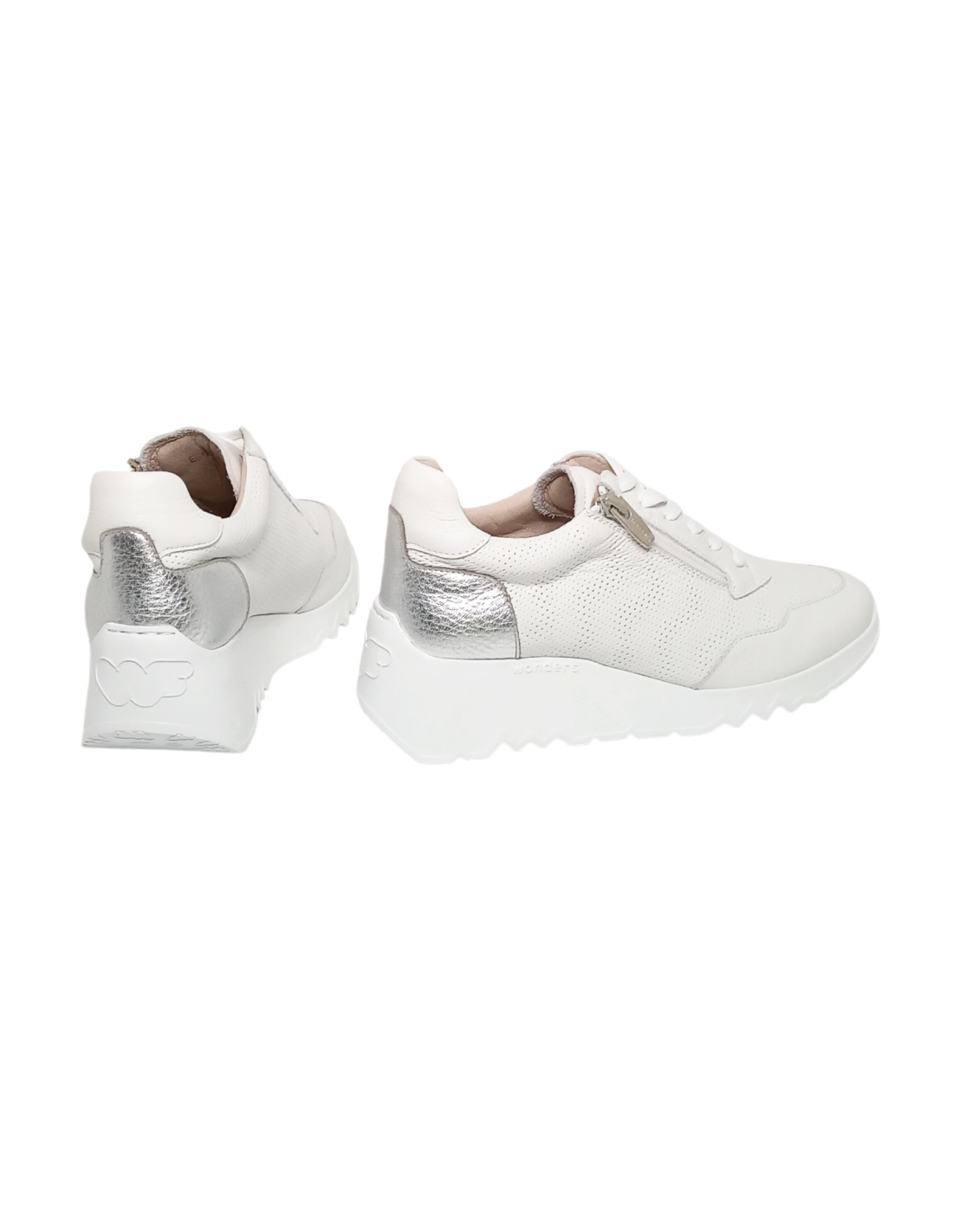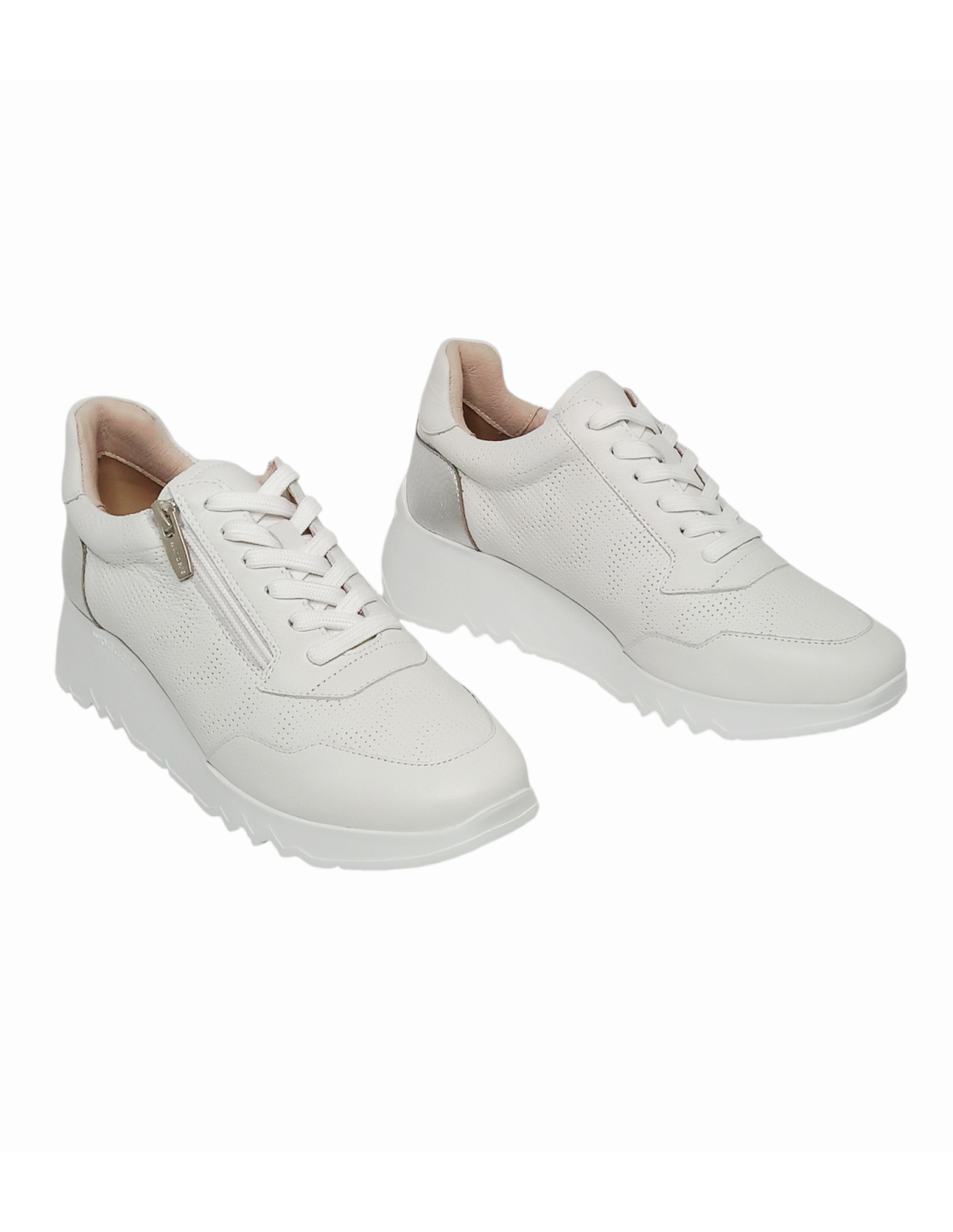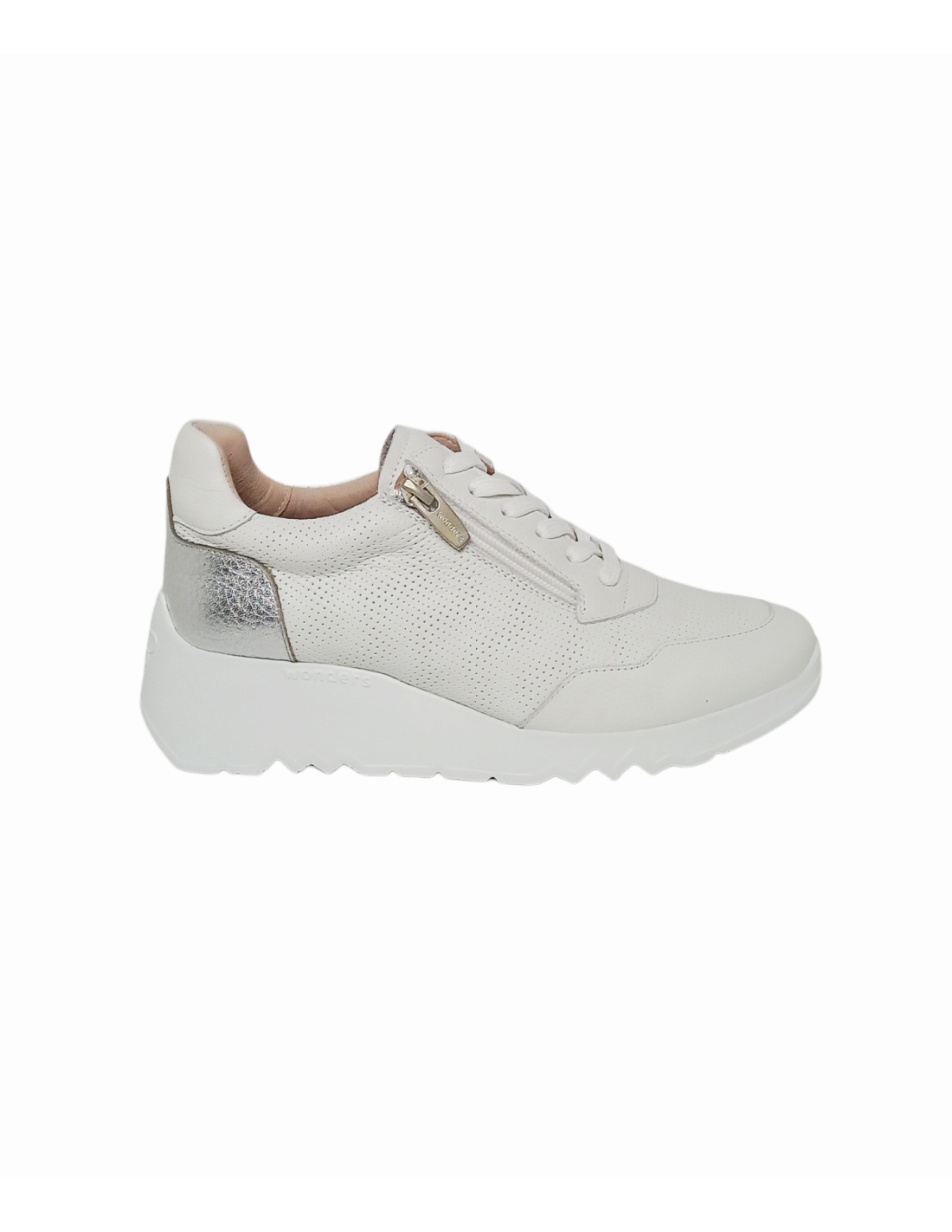 Zapato de estilo deportivo fabricado en piel de primera calidad de color blanco, microperforada en la parte delantera y los laterales y talonera plateada.