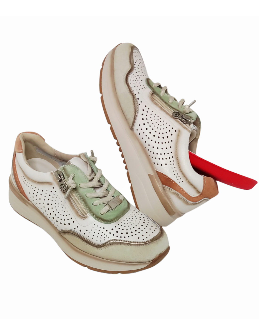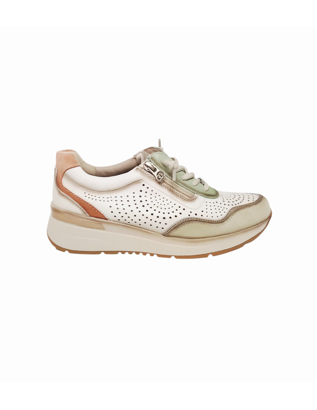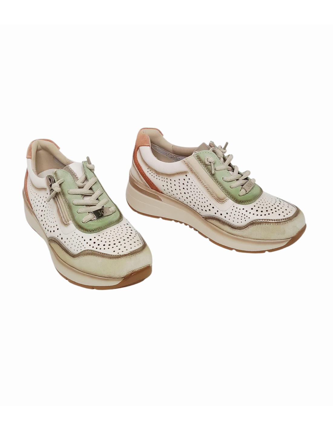 Zapato estilo deportivo de horma ancha fabricado en piel con diferentes texturas en color blanco roto combinado con detalles en verde, cuero y oro.