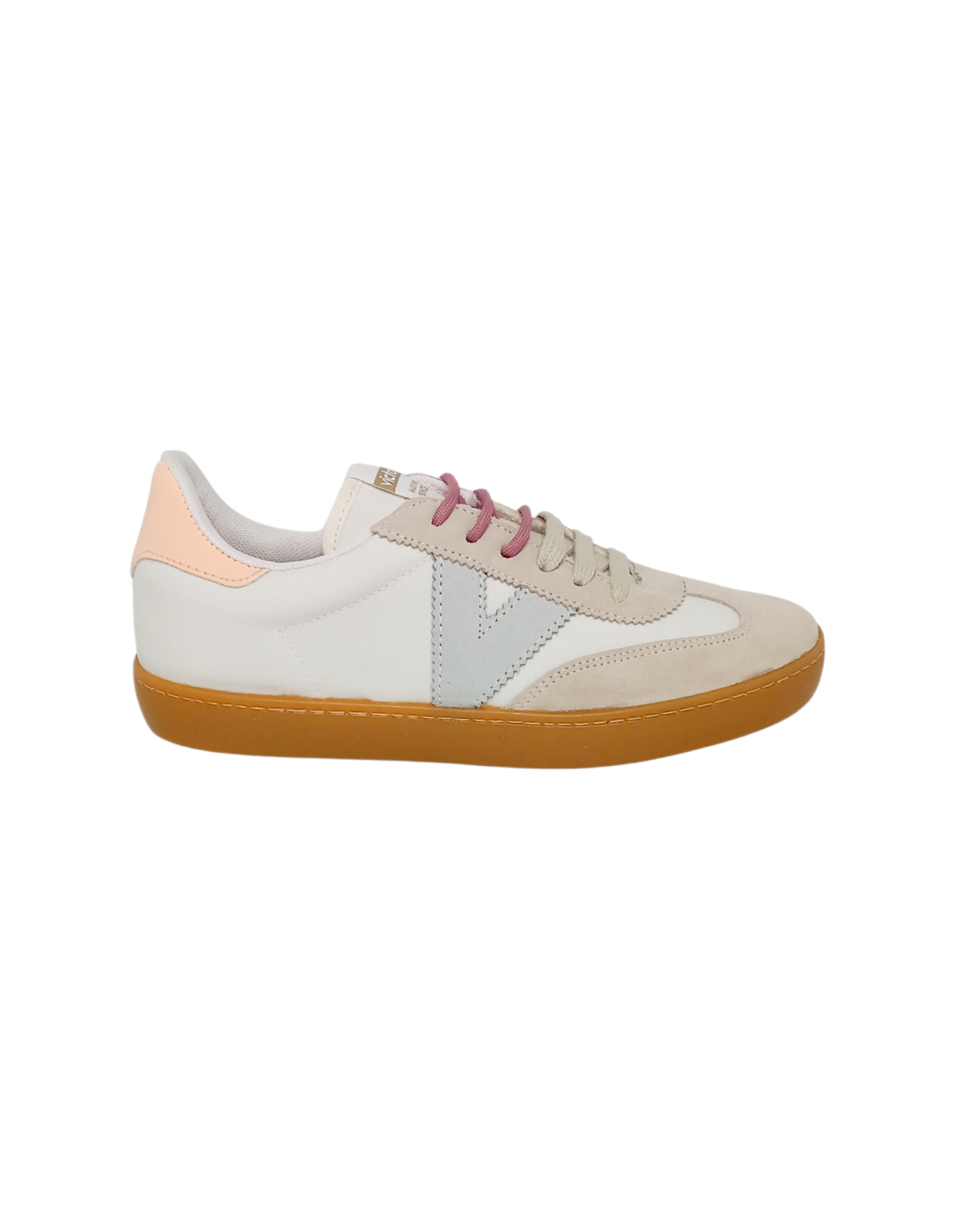Zapatilla casual fabricado en nylon color blanco con detalles de serraje en gris perla y talonera en color rosa ligeramente reflectante.
