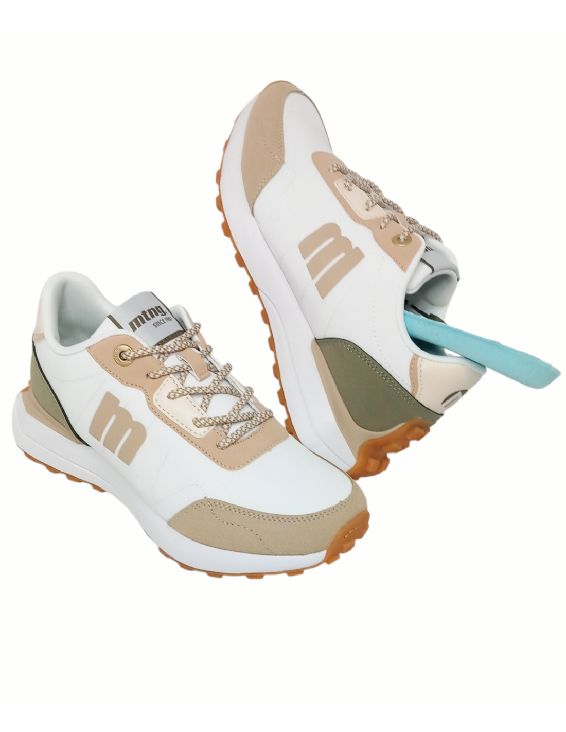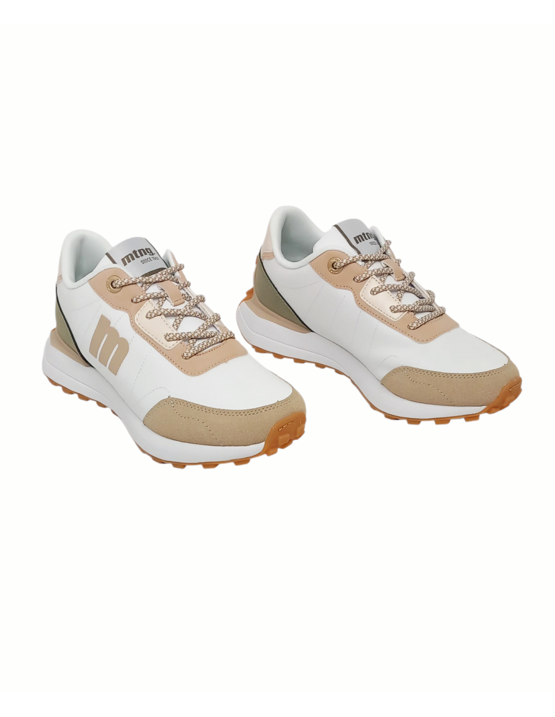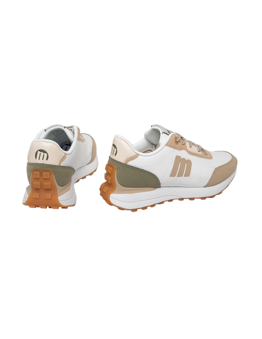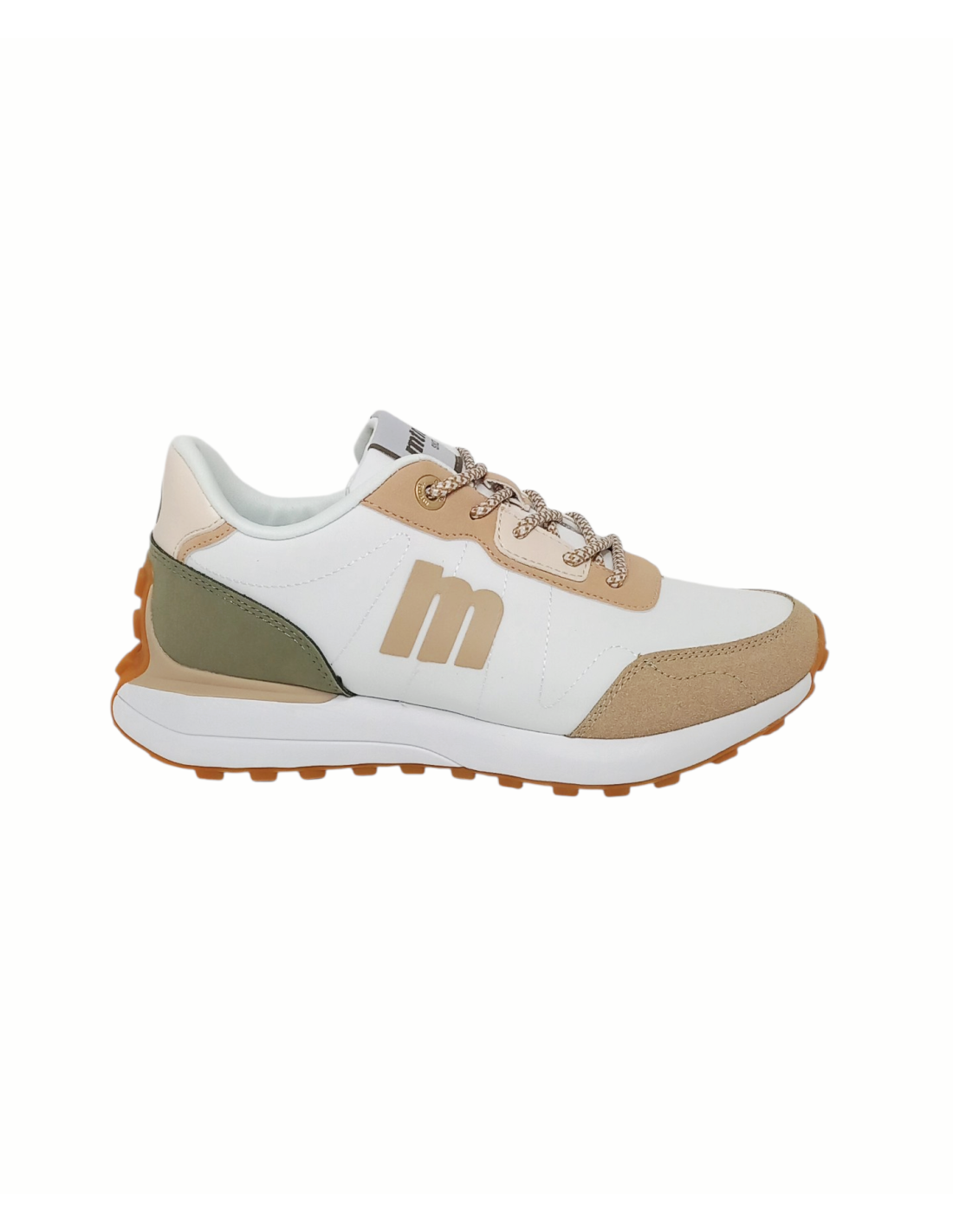 Zapatilla deportiva de estilo casual en color blanco con detalles en color beige y kakhi. Confeccionado en materiales sintéticos de diferentes texturas.