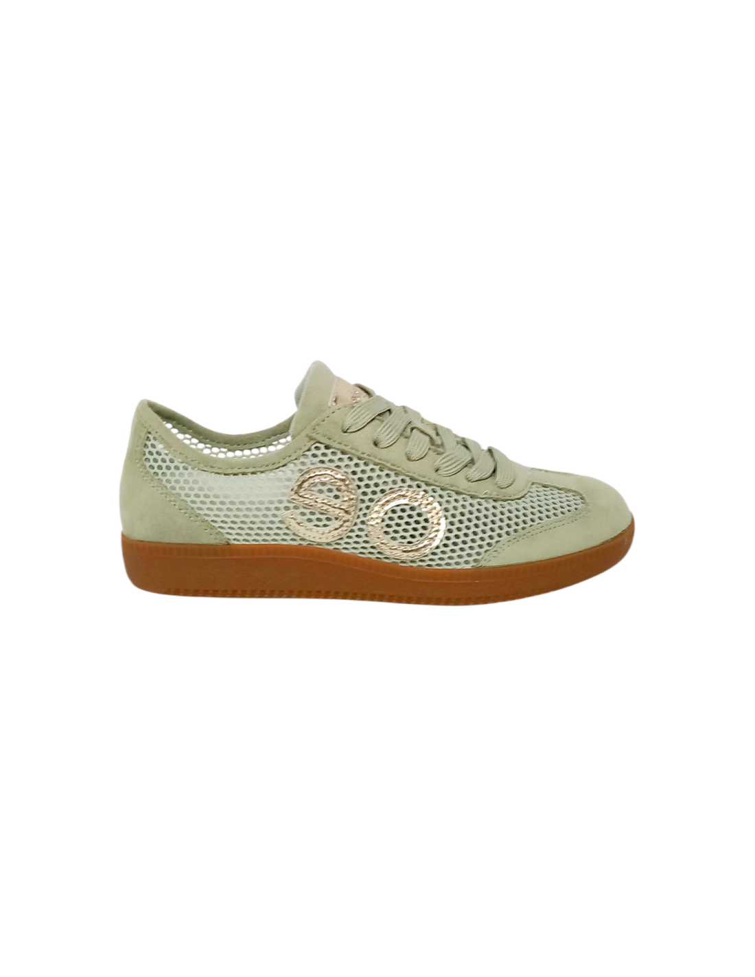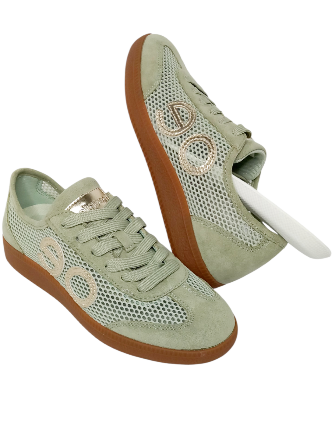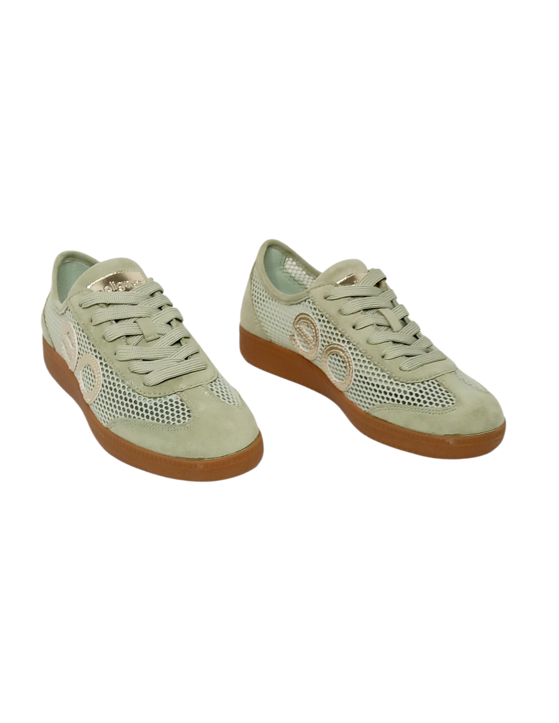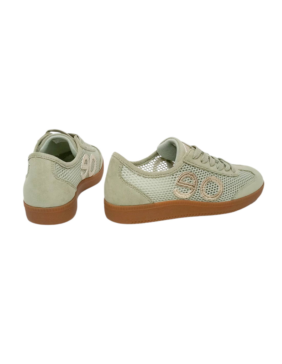 Zapatilla deportiva fabricado en símil piel y rejilla textil de colores beige, verde agua y una combinación de negro y dorado.