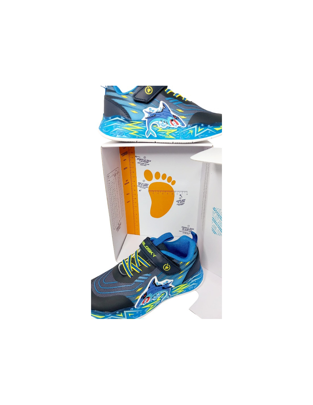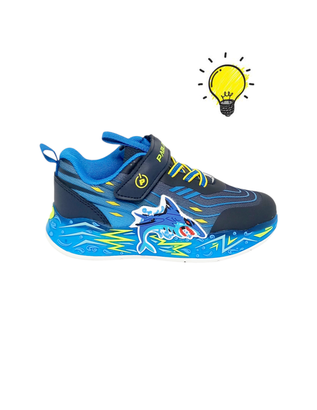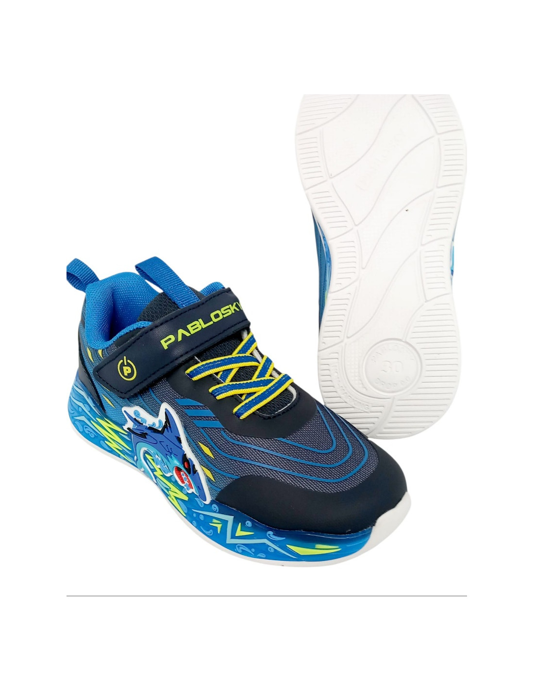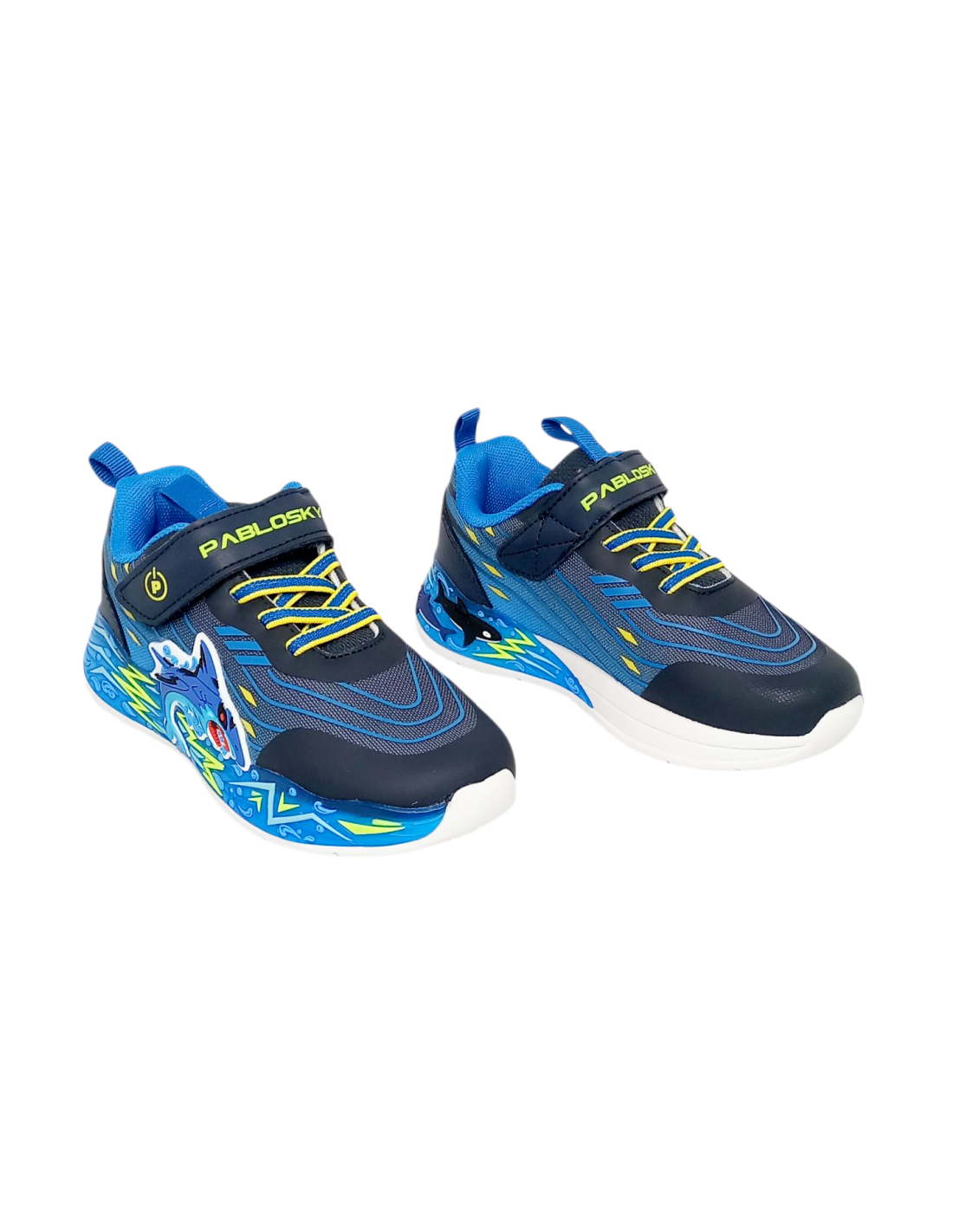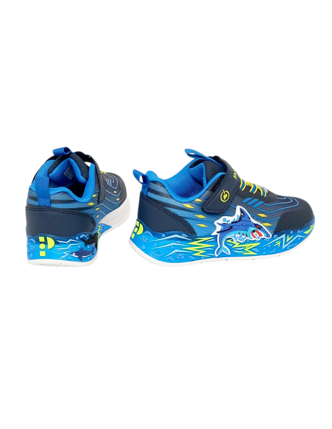 Deportivo fabricado con materiales textiles de primera calidad en varios tonos de azul y amarillo, con diseño de tiburón engomado en relieve en el lateral. Incorpora luces que se activan con la pisada, además de un botón de encendido y apagado en el lateral.