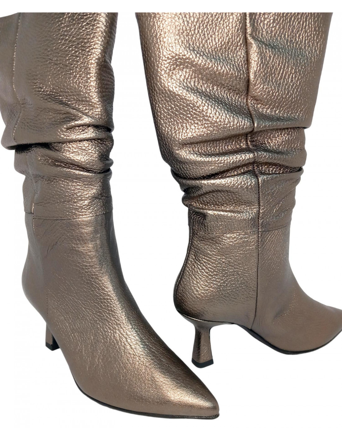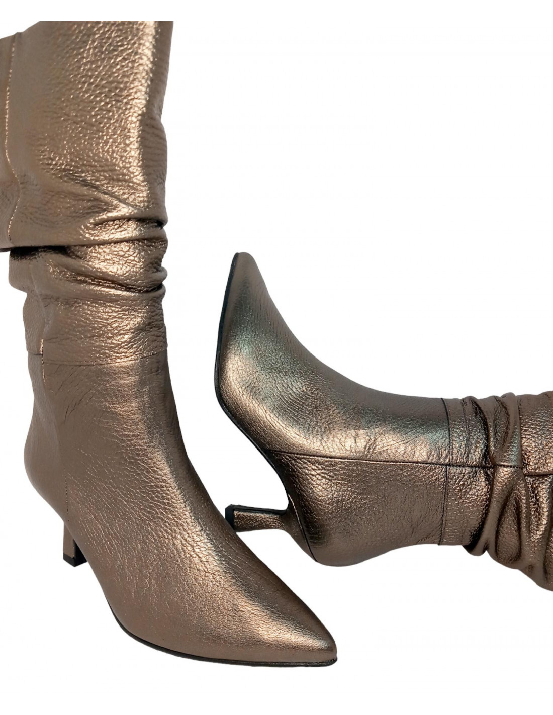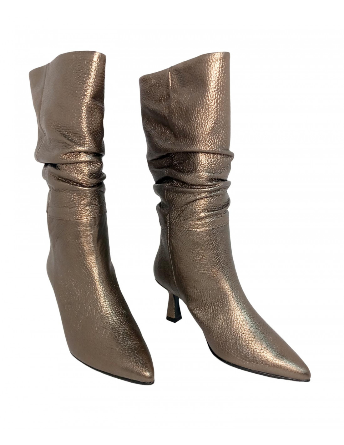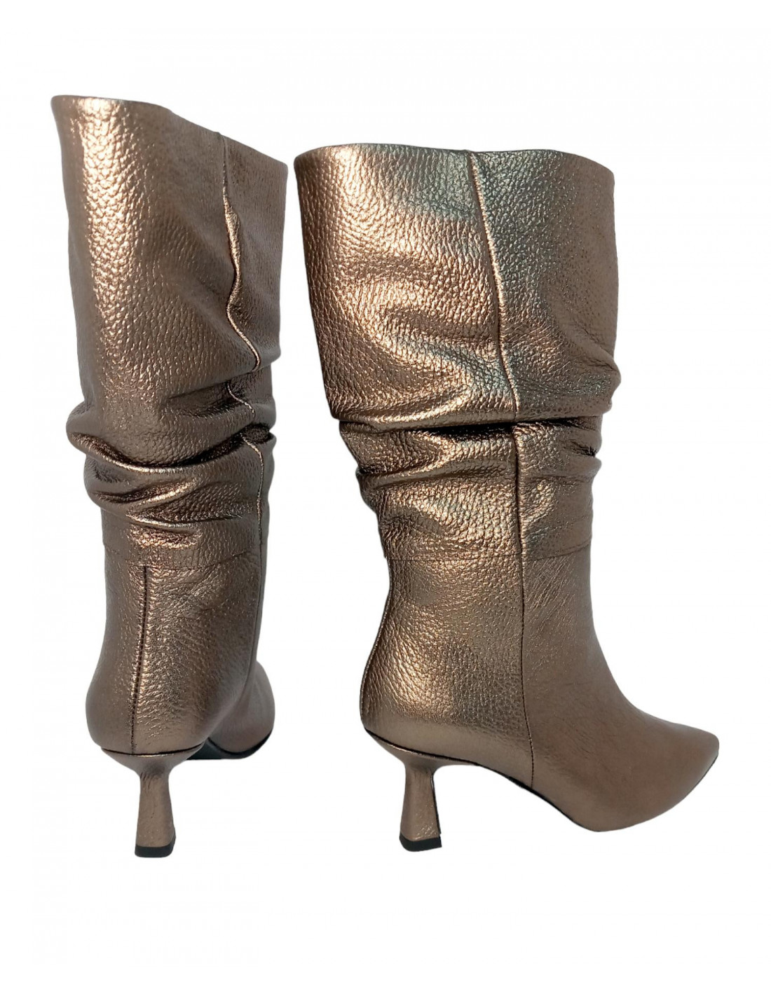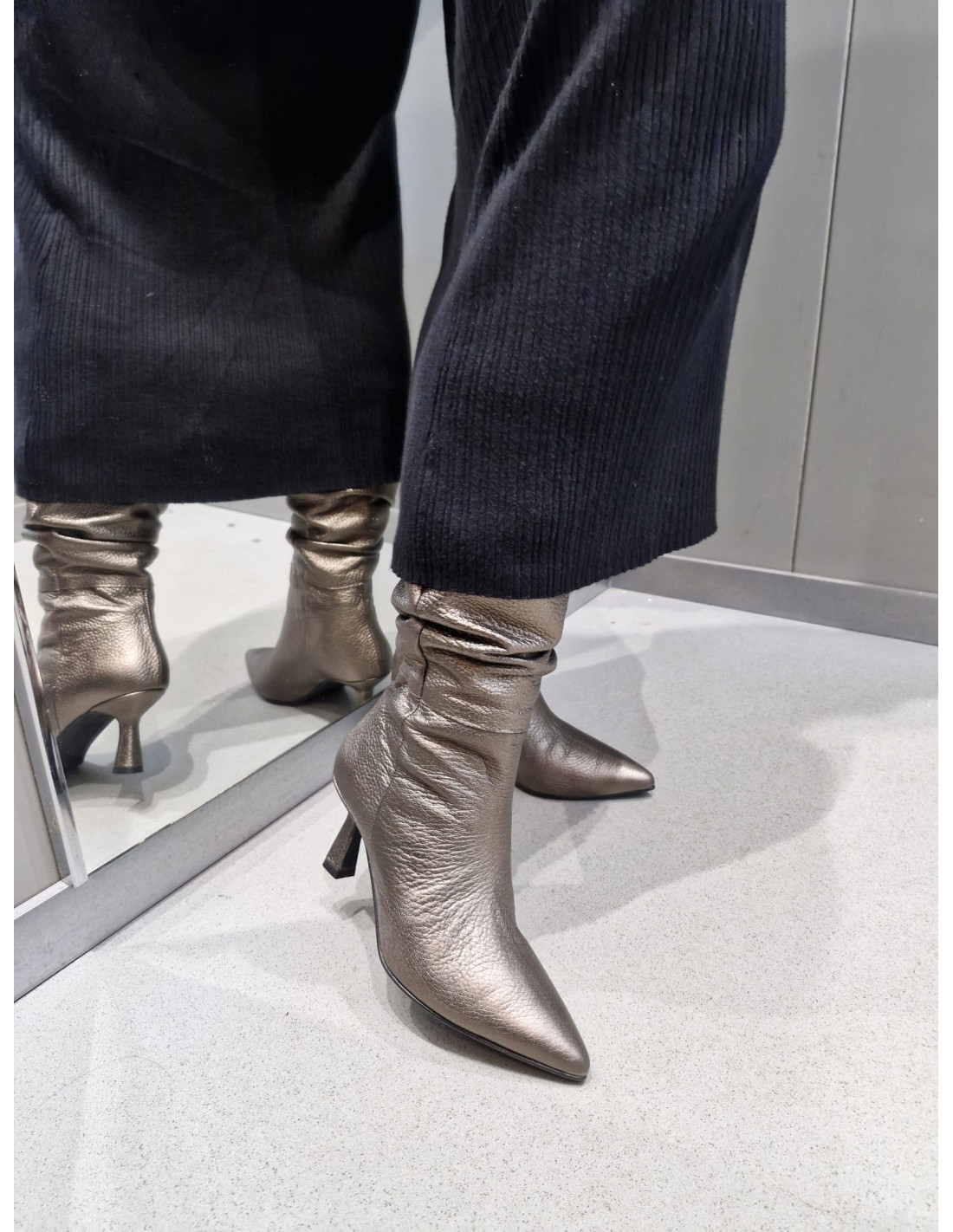 Es un diseño de punta afilada y caña de efecto arrugado. La plantilla es acolchada gracias a su relleno de gel y elaborada en piel al igual que el forro, para una comodidad suprema.