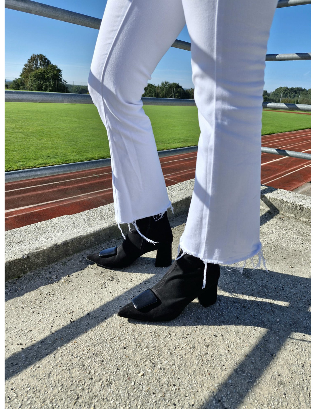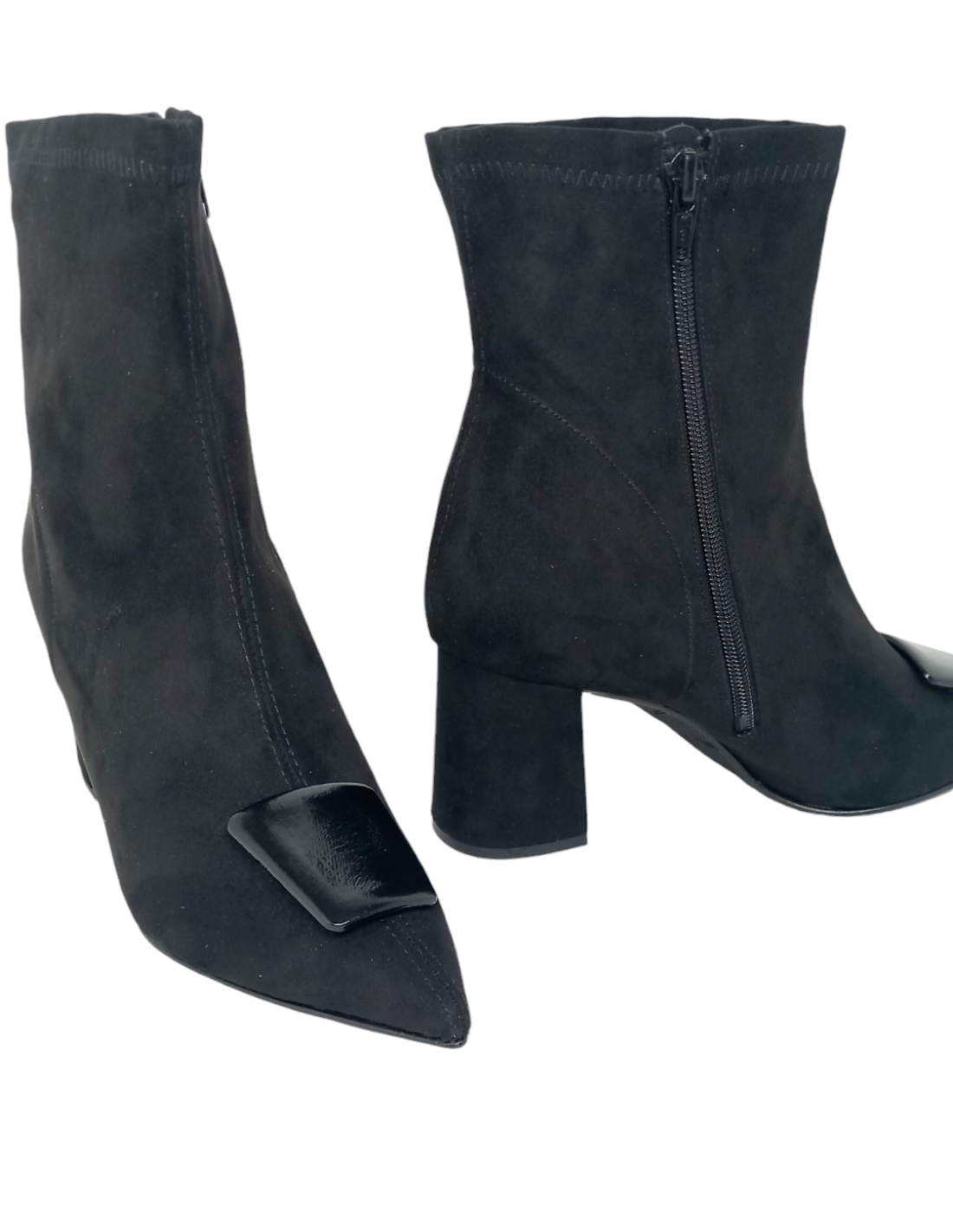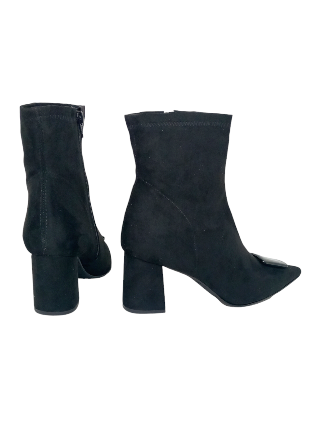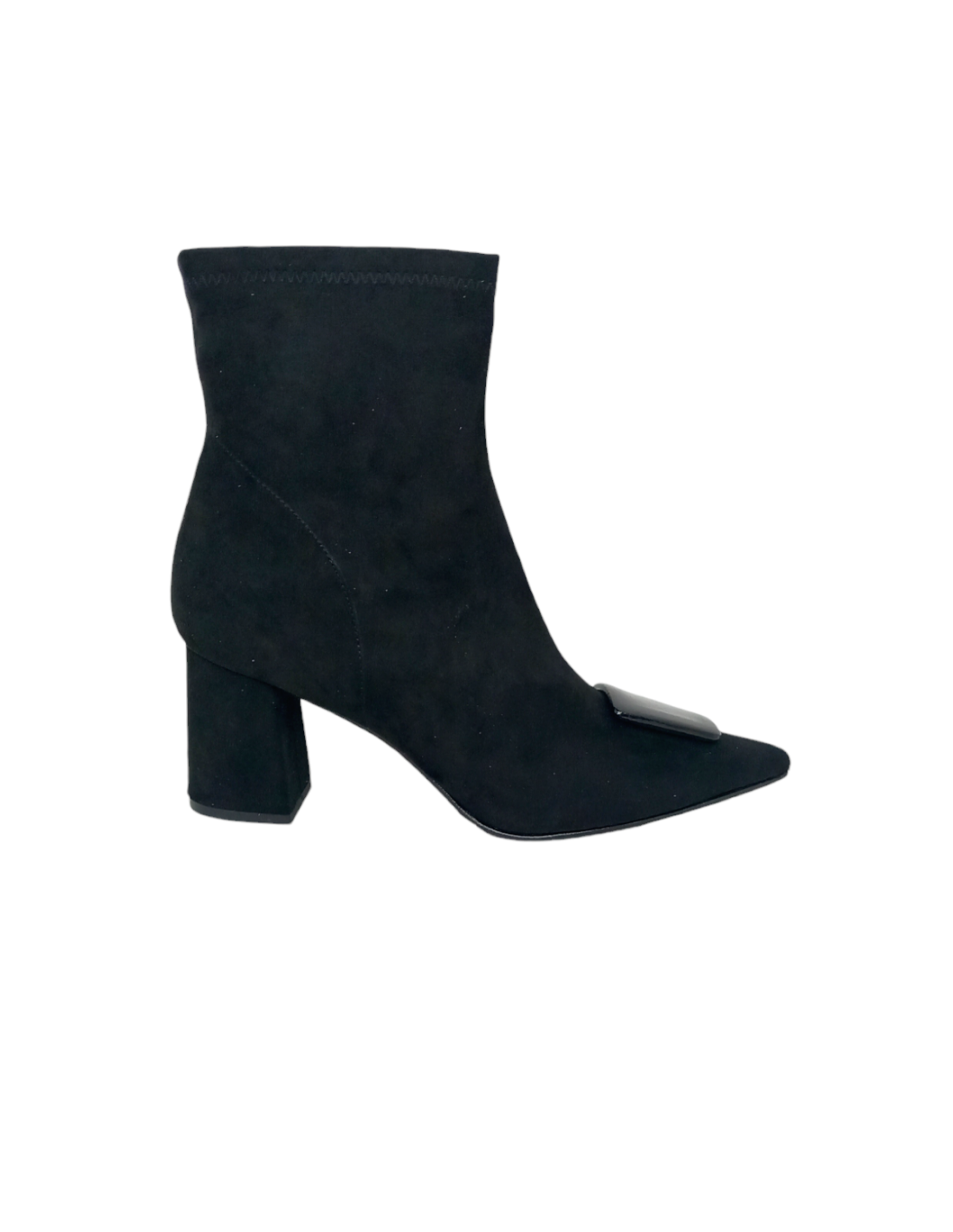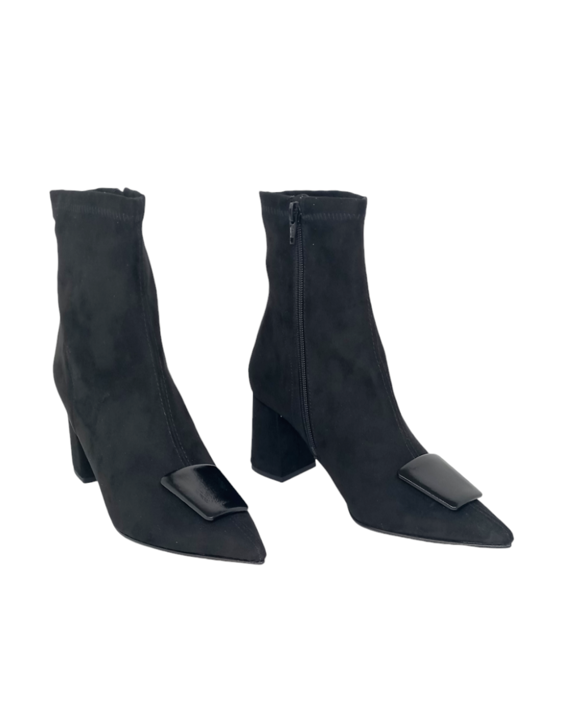 Botín fino fabricado en antelina de color negro adornado en la parte delantera con un aplique cuadrado forrado en piel negra.