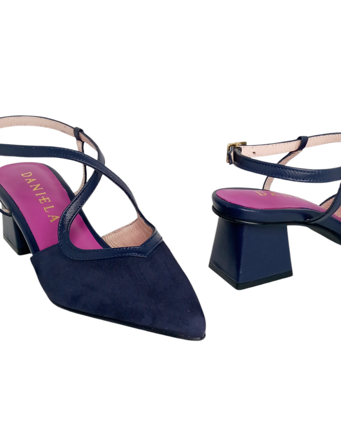 Zapato destalonado fabricado en ante azul marino combinado con acabados en piel en las tiras del empeine y el tacón.